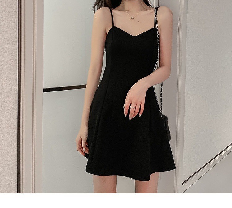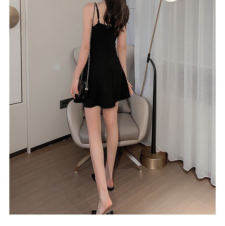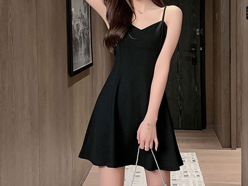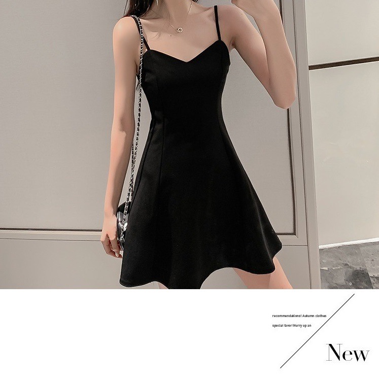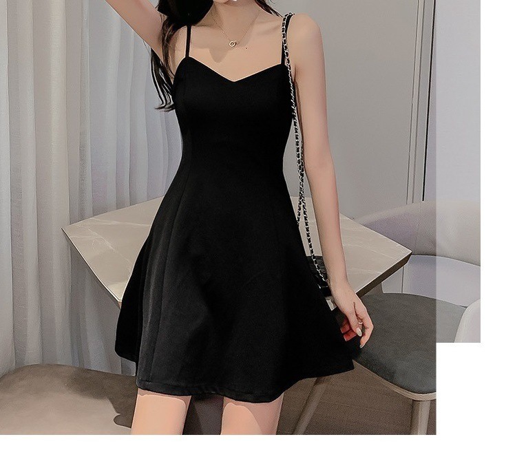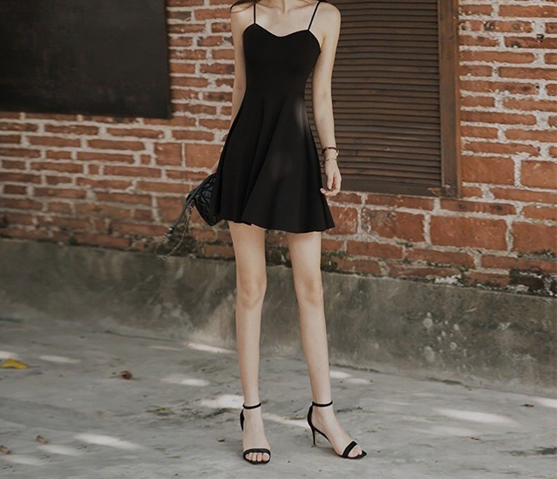 黑色吊带连衣裙女夏季外穿收腰显瘦小个子a字裙短裙赫本小黑裙子