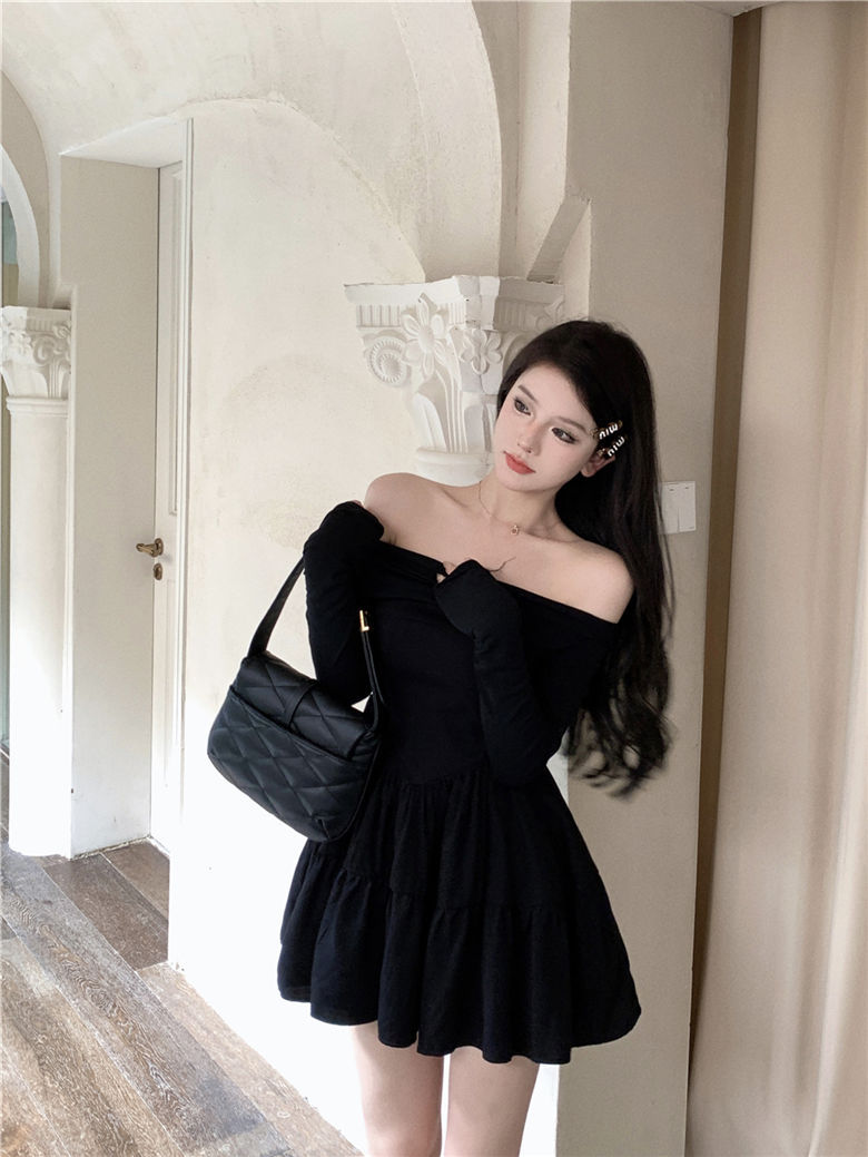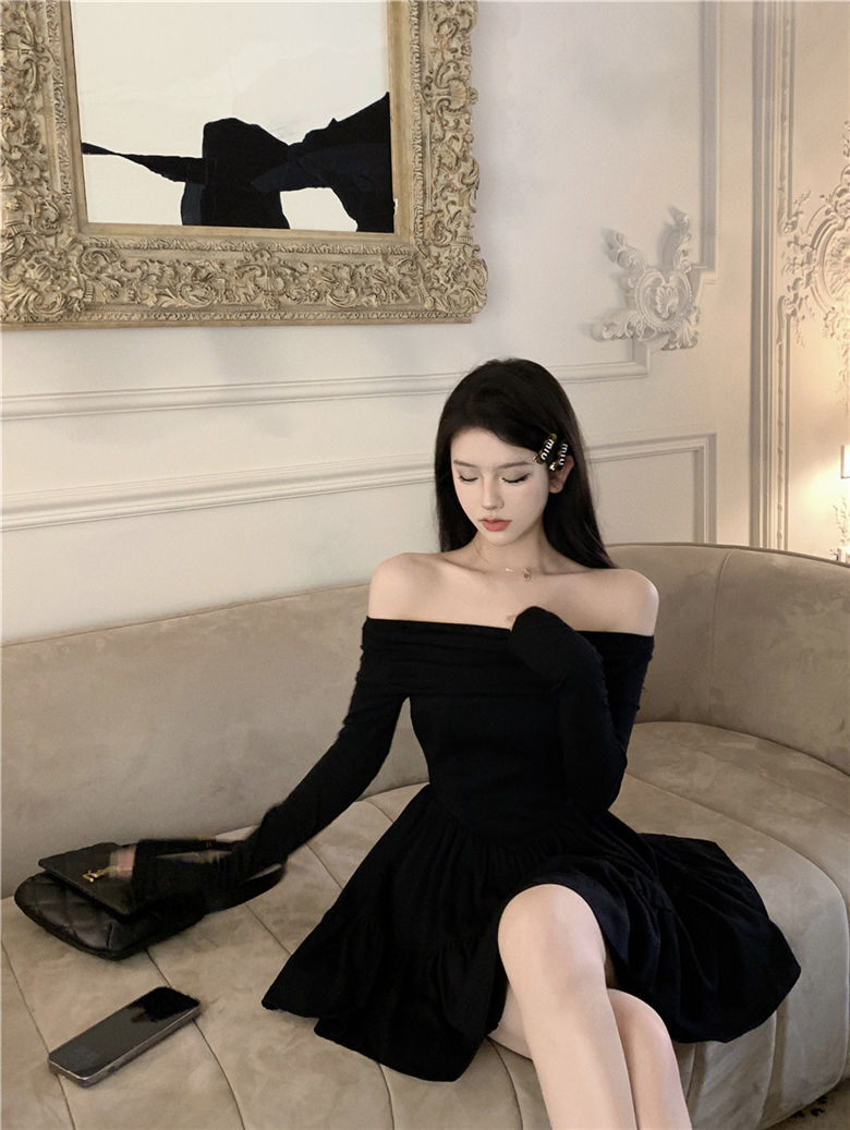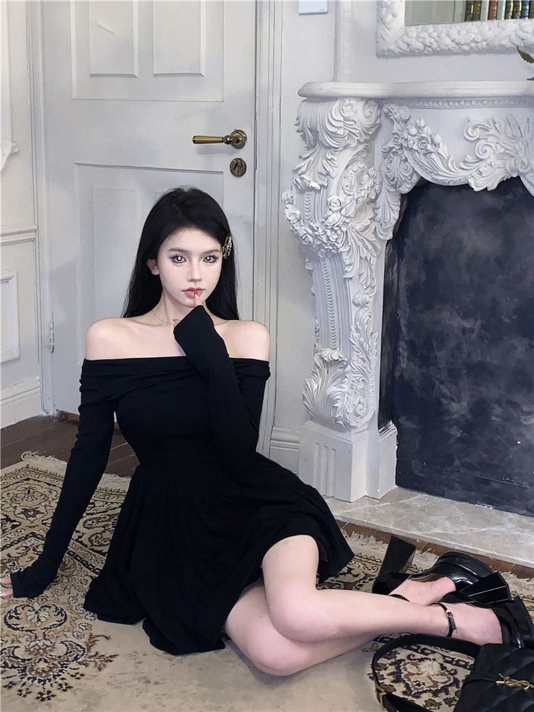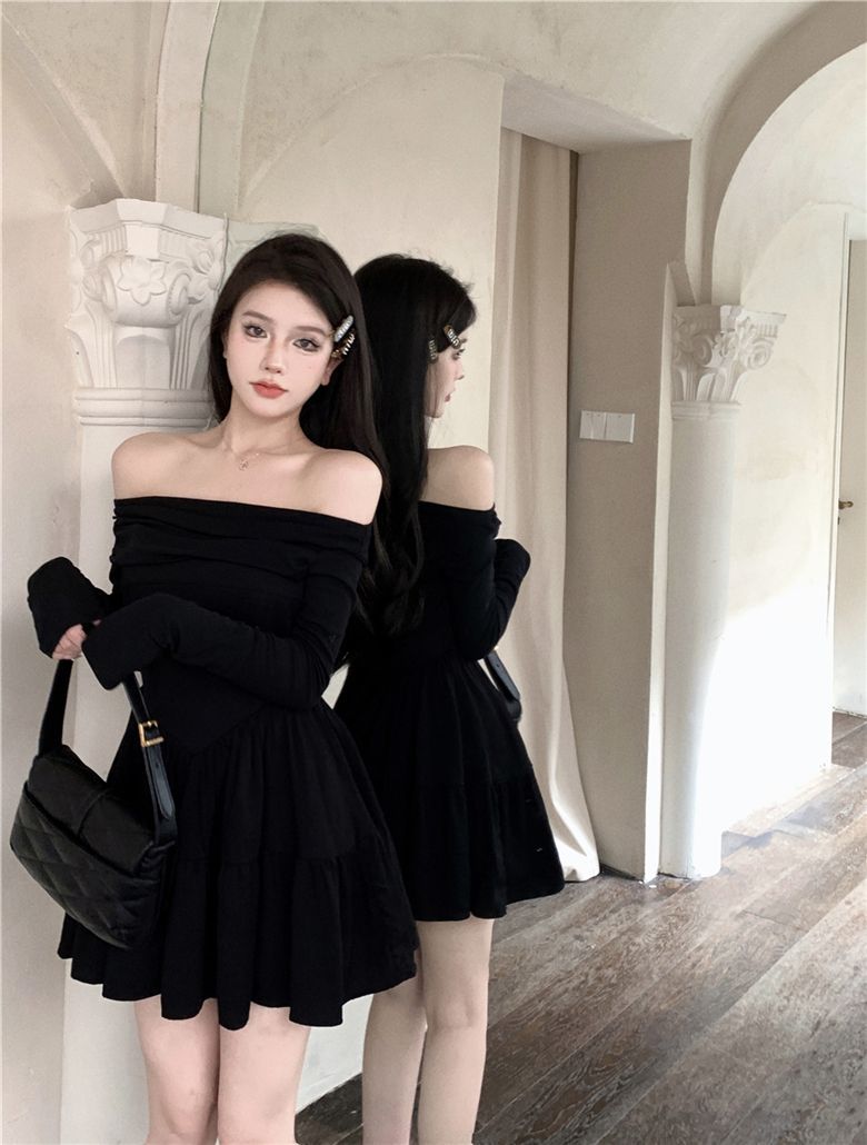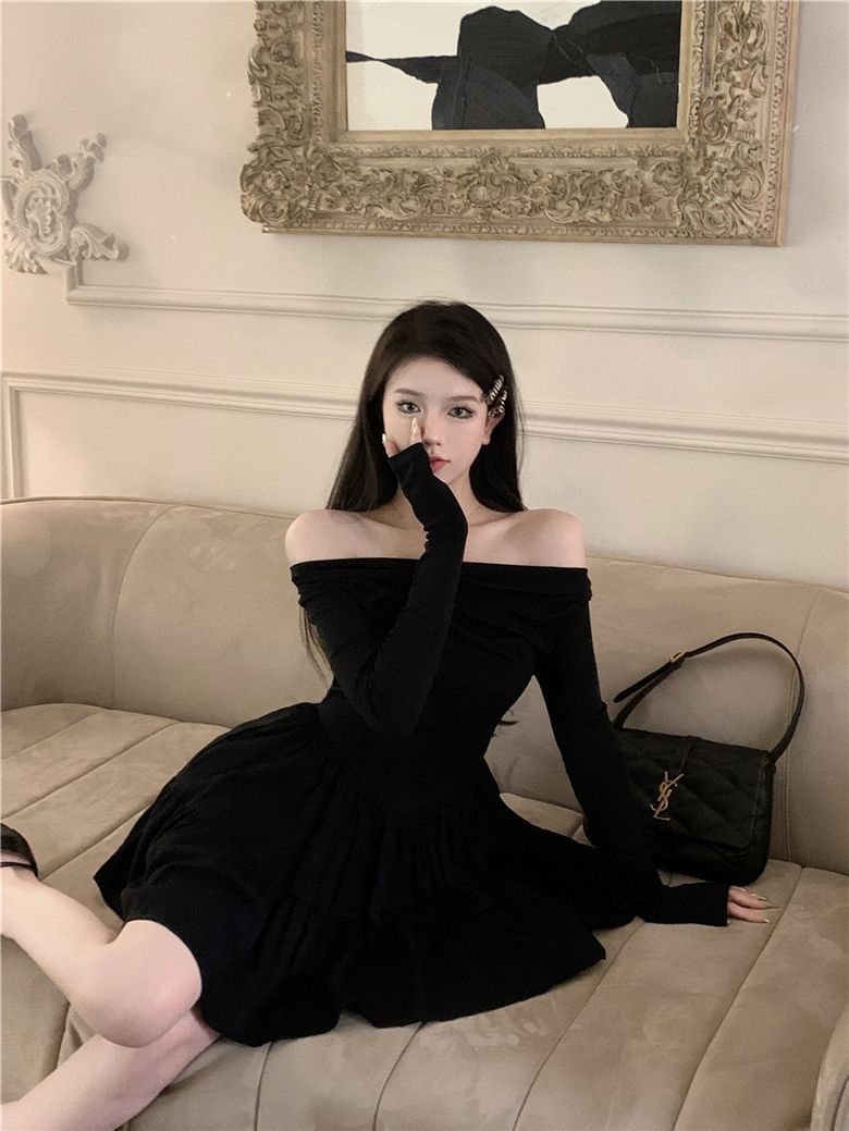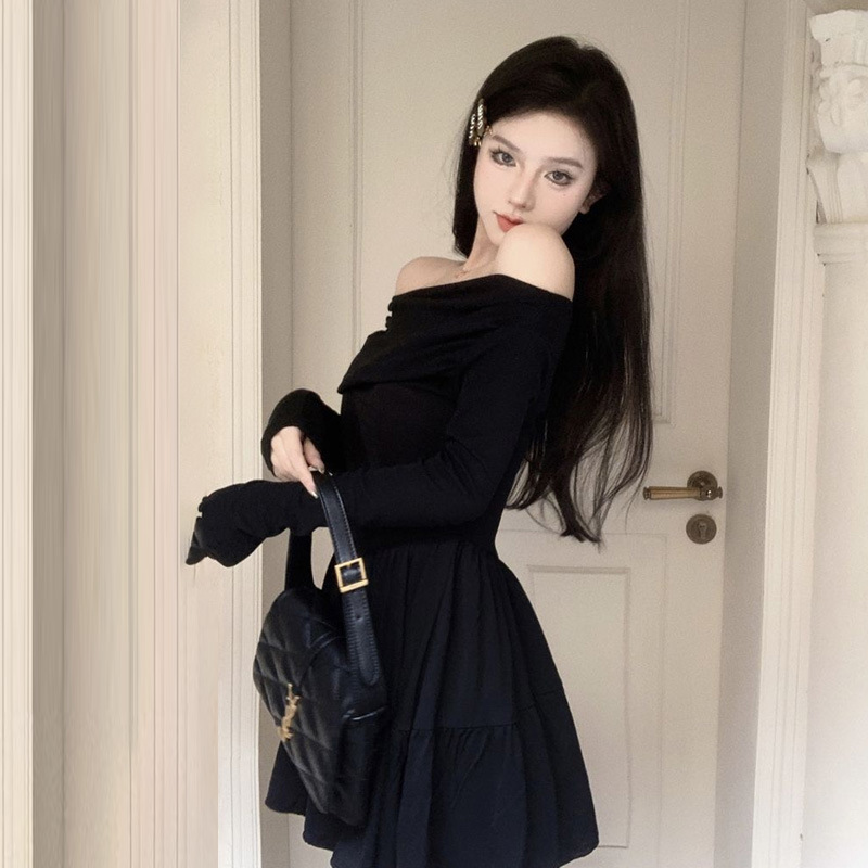 一字肩连衣裙女秋季2024新款性感一字领法式名媛收腰蓬蓬小黑裙子