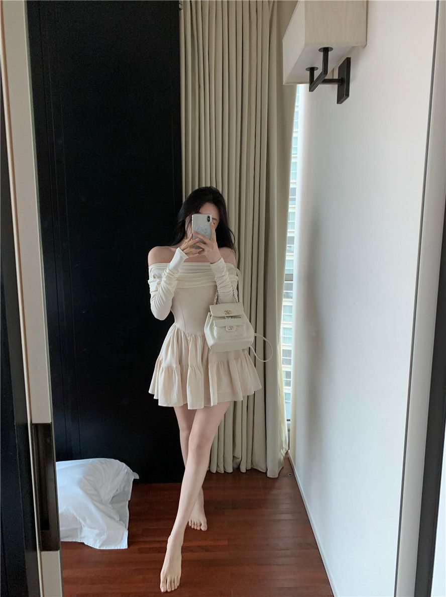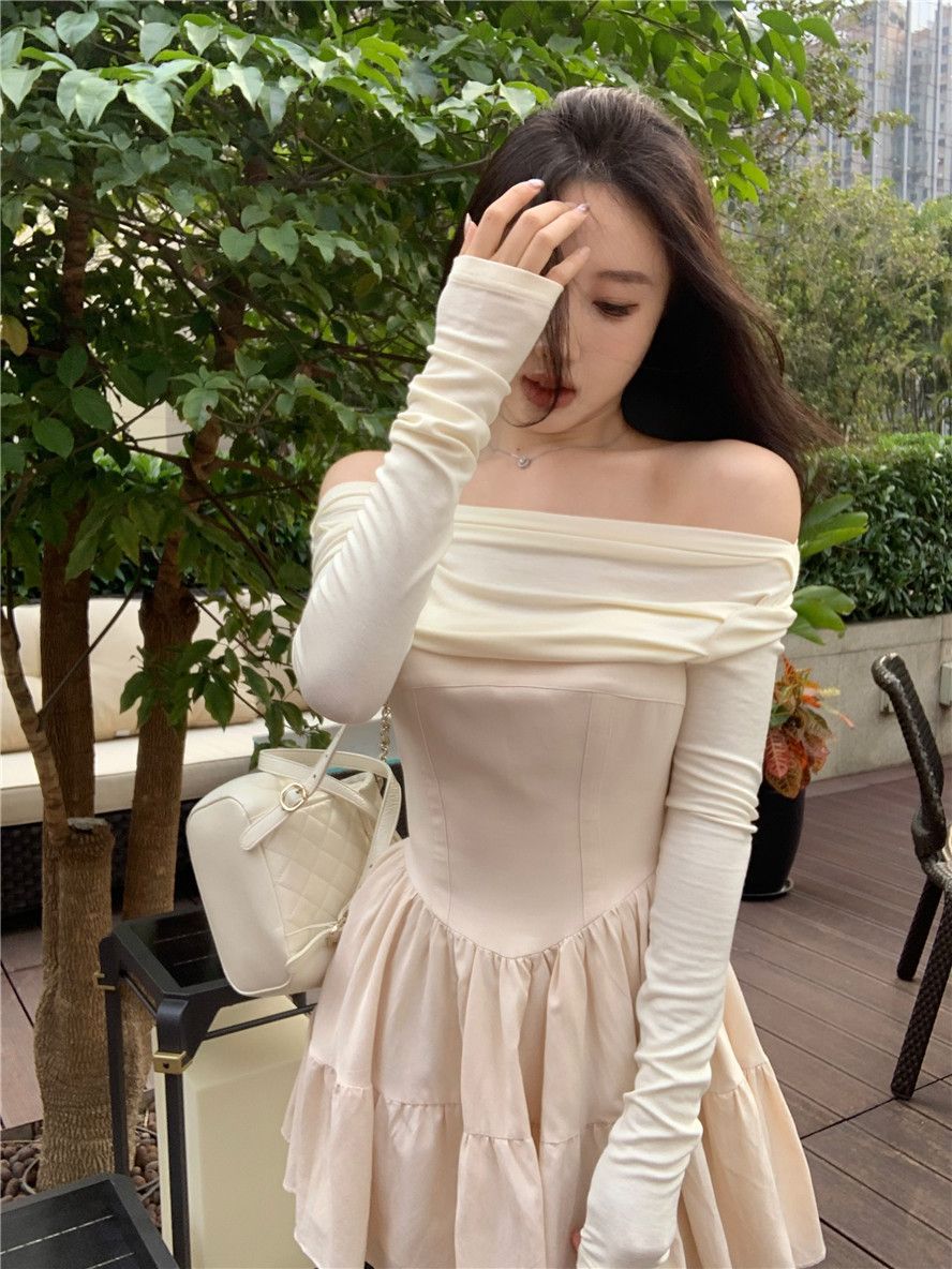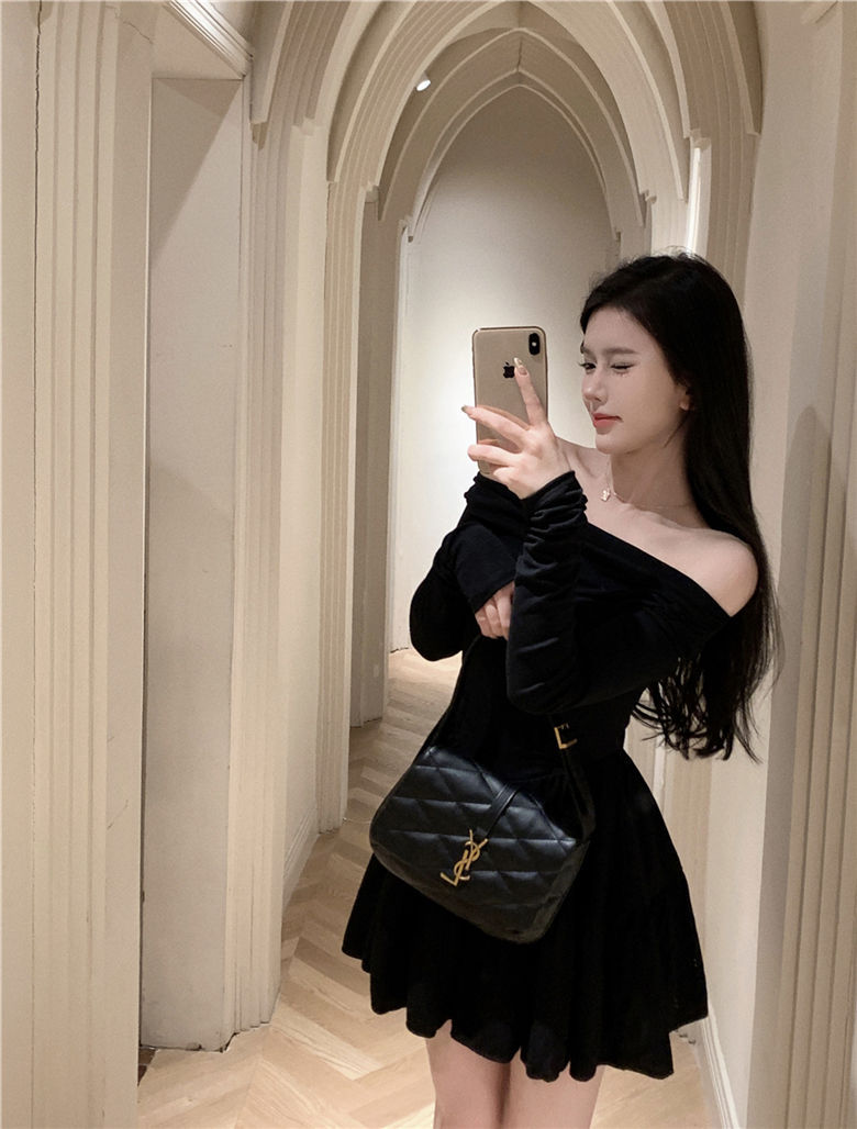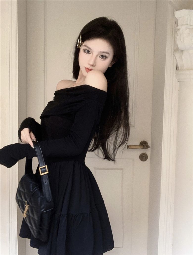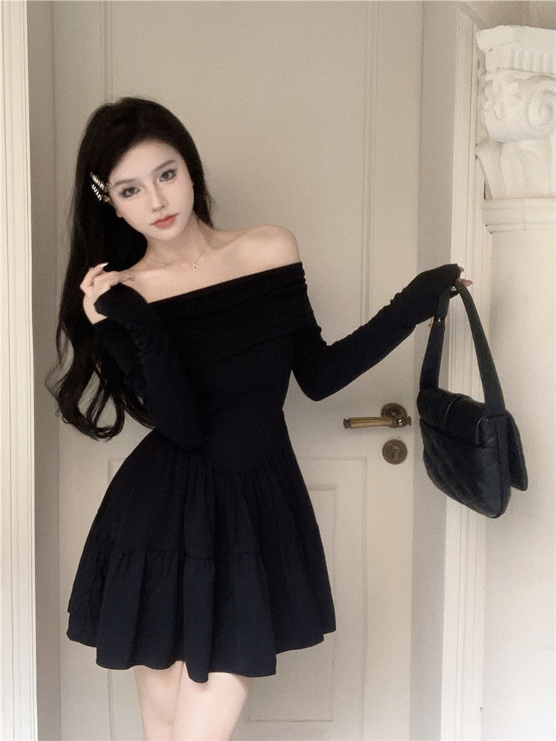 一字肩连衣裙女秋季2024新款性感一字领法式名媛收腰蓬蓬小黑裙子