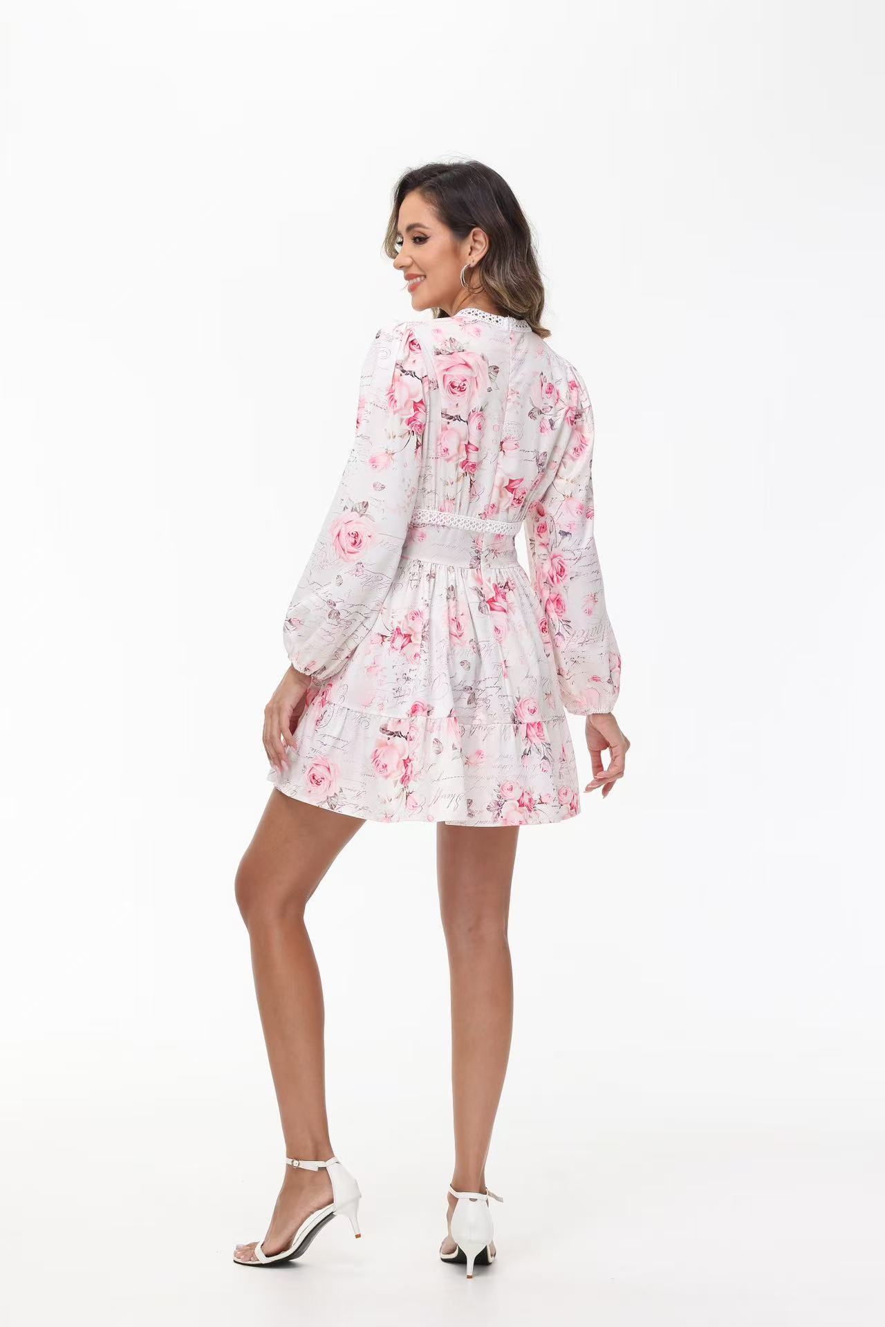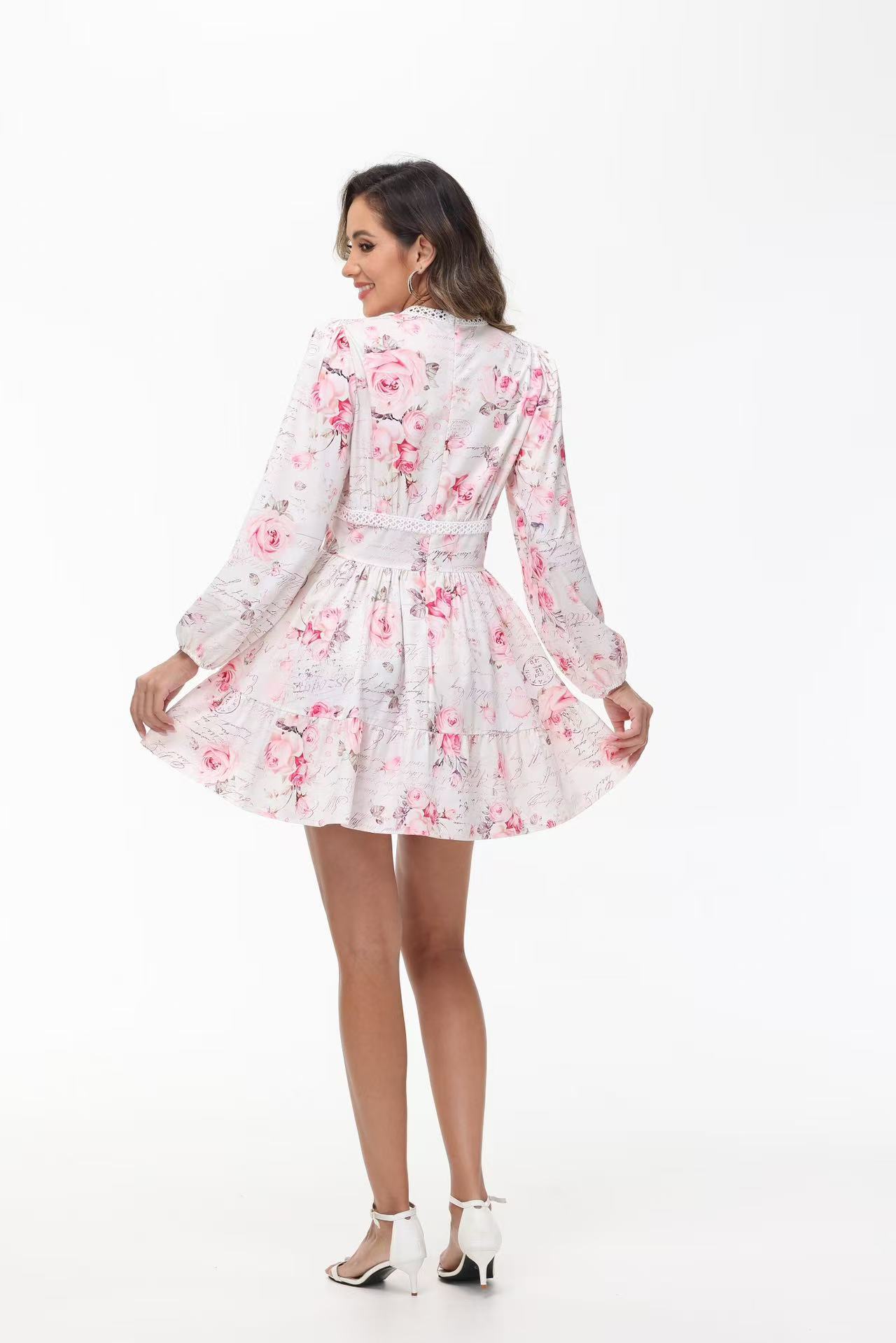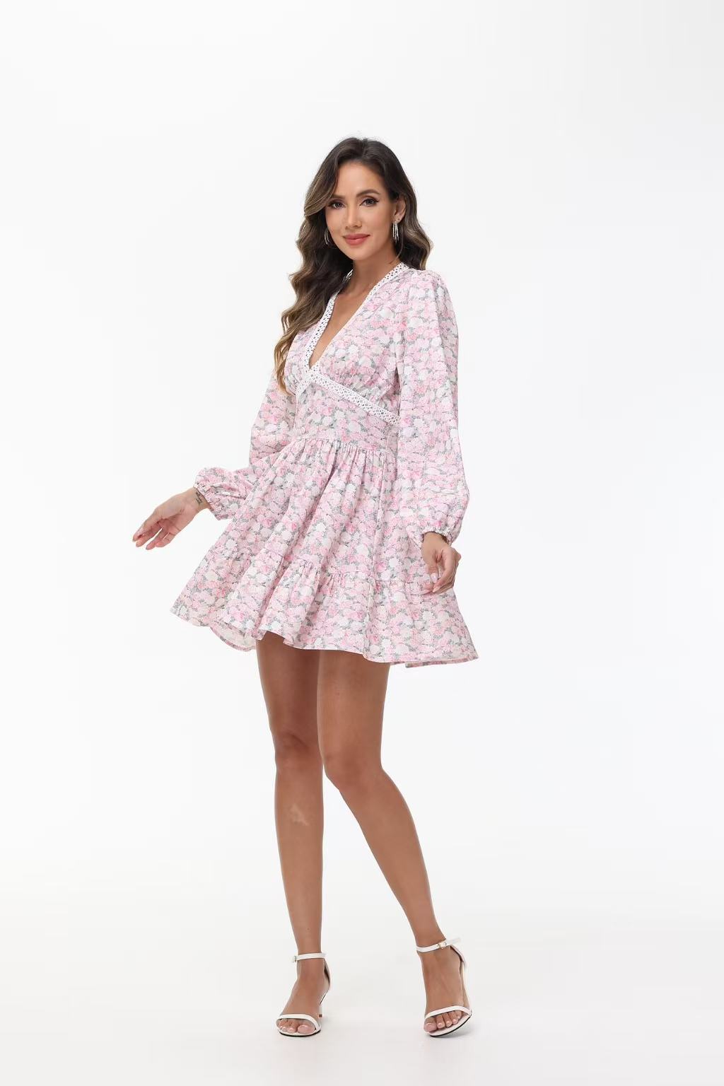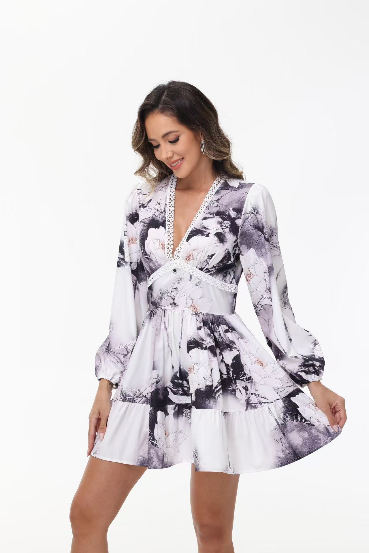 现货 2023 欧美春季女装新款外贸气质甜美印花v领蕾丝短款连衣裙