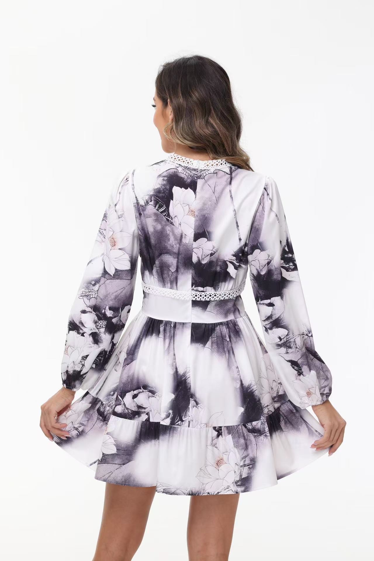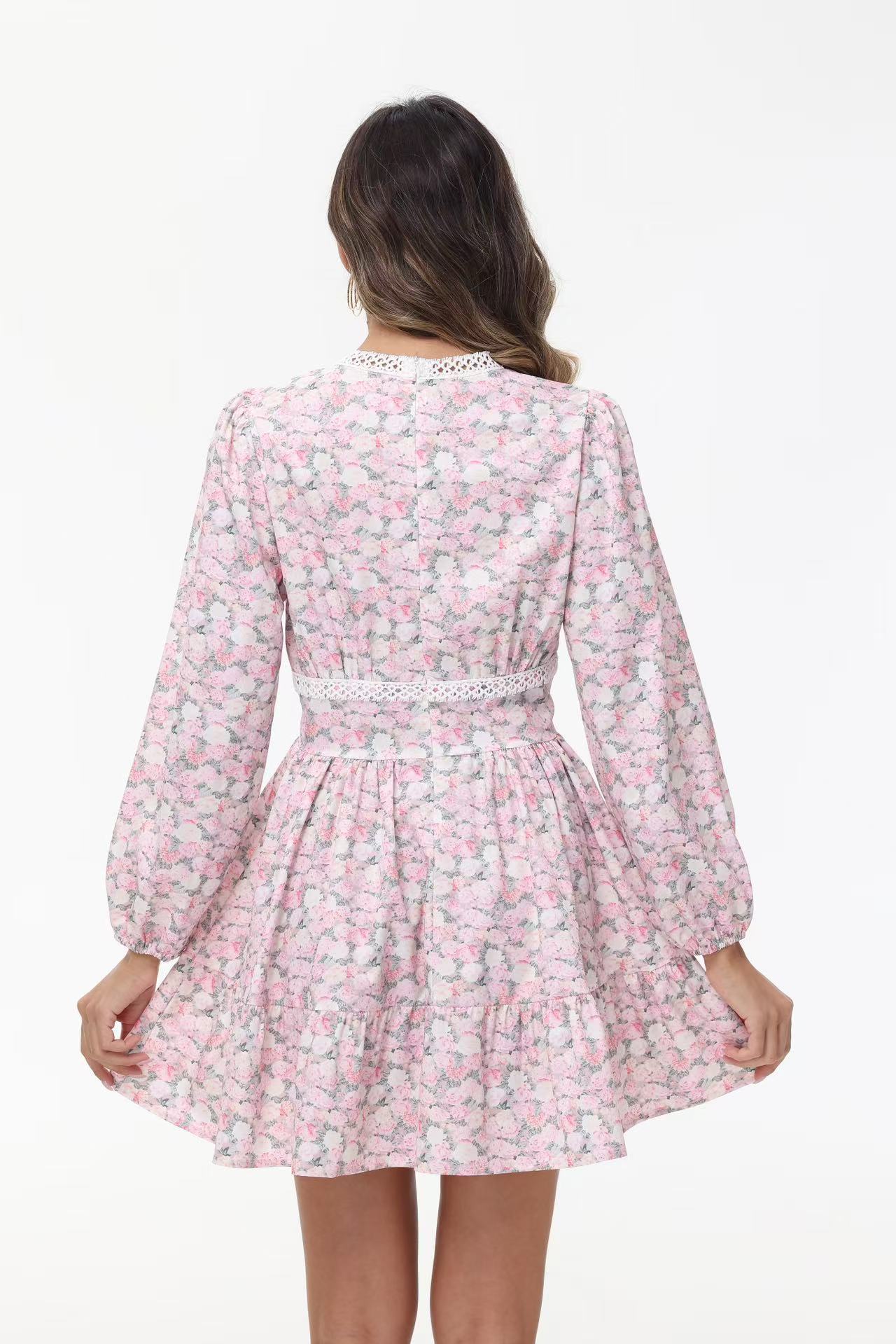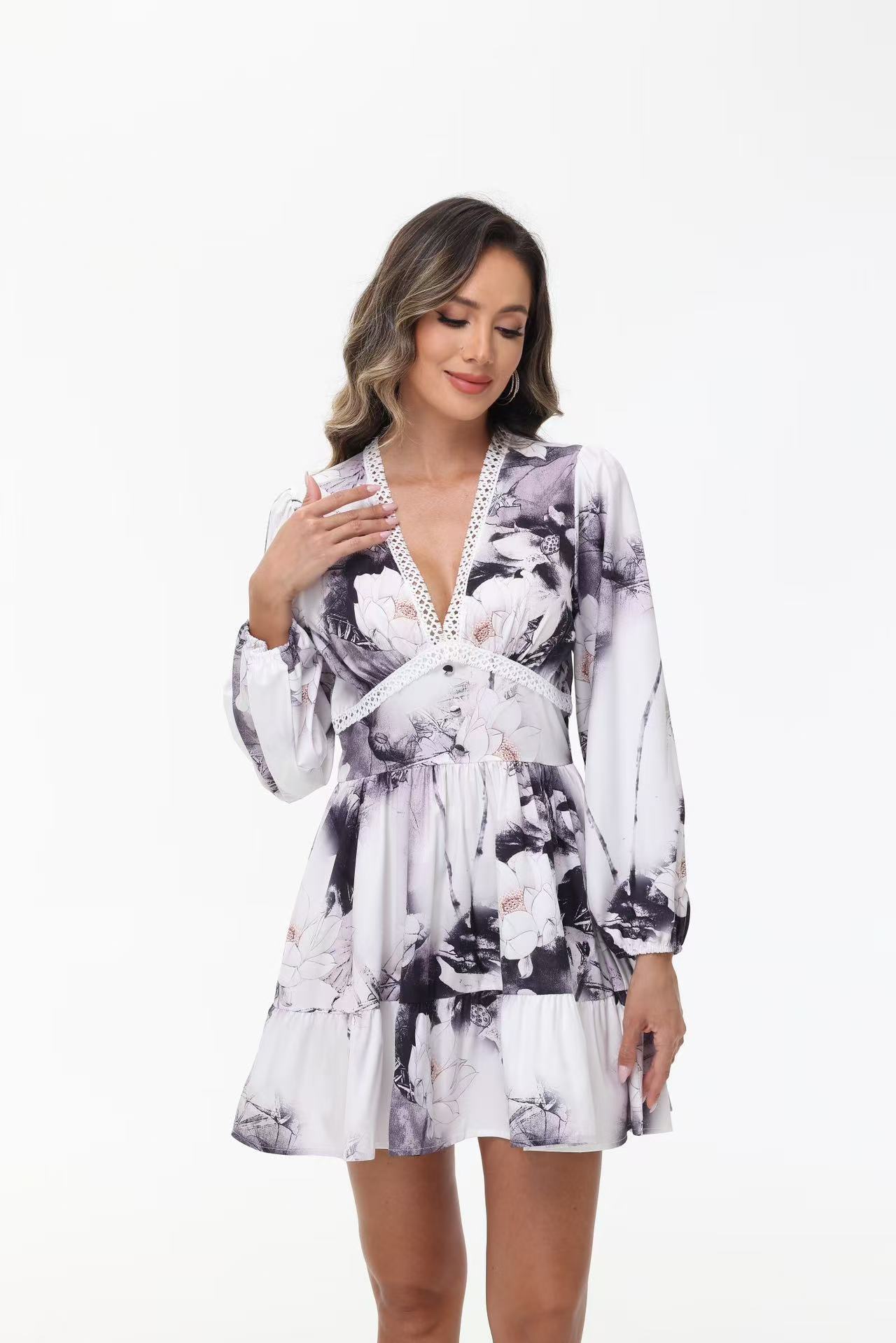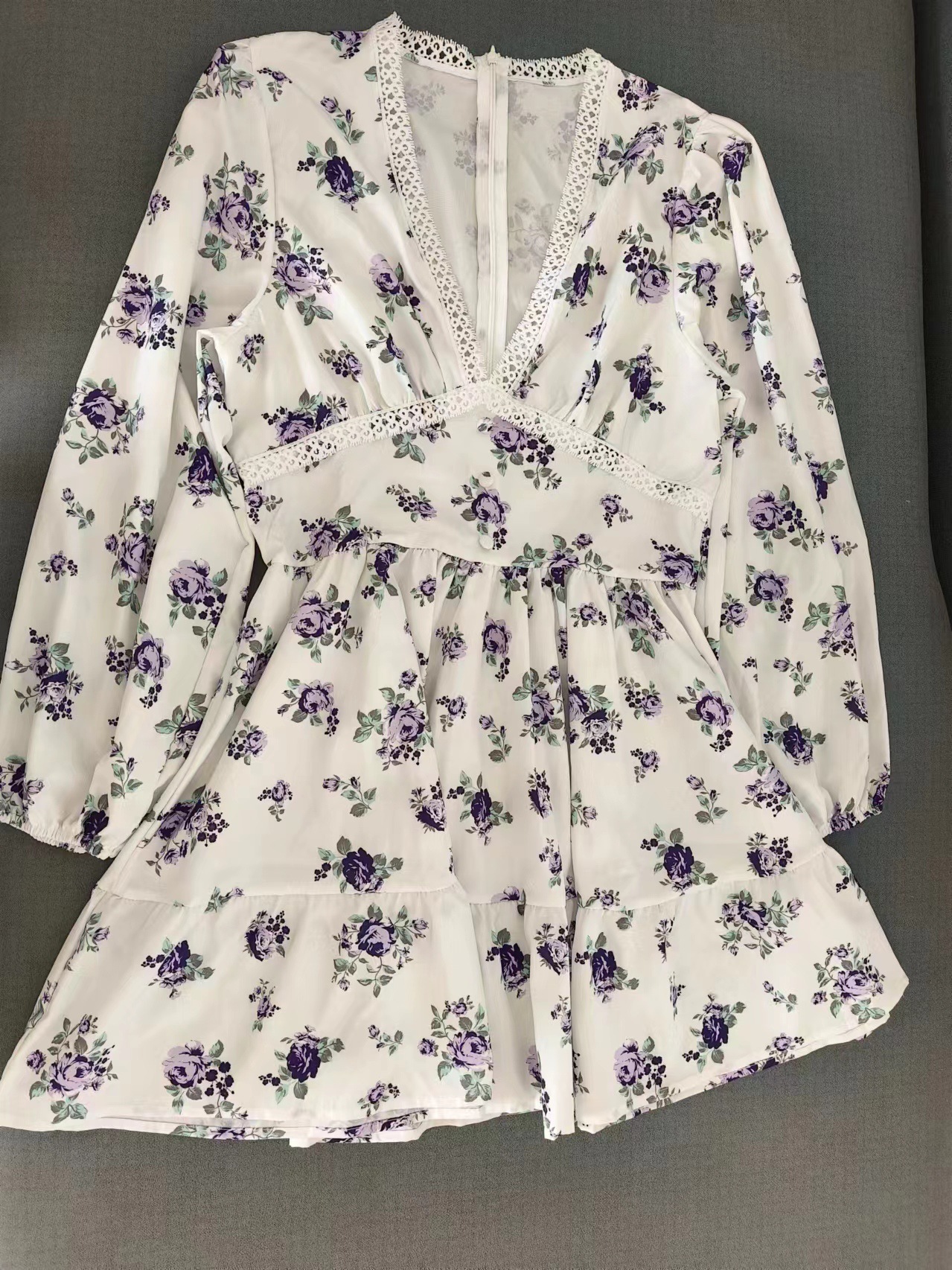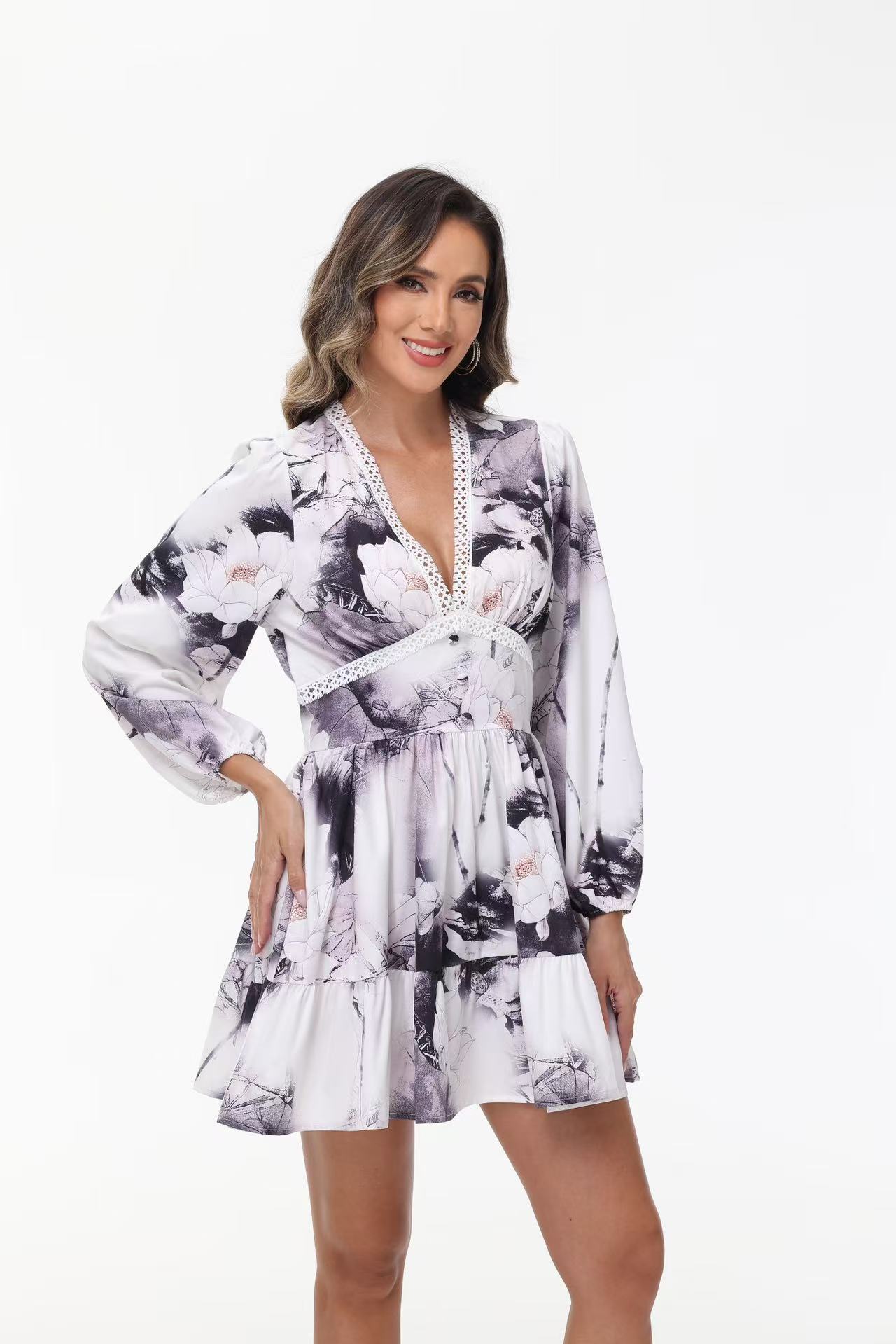 现货 2023 欧美春季女装新款外贸气质甜美印花v领蕾丝短款连衣裙