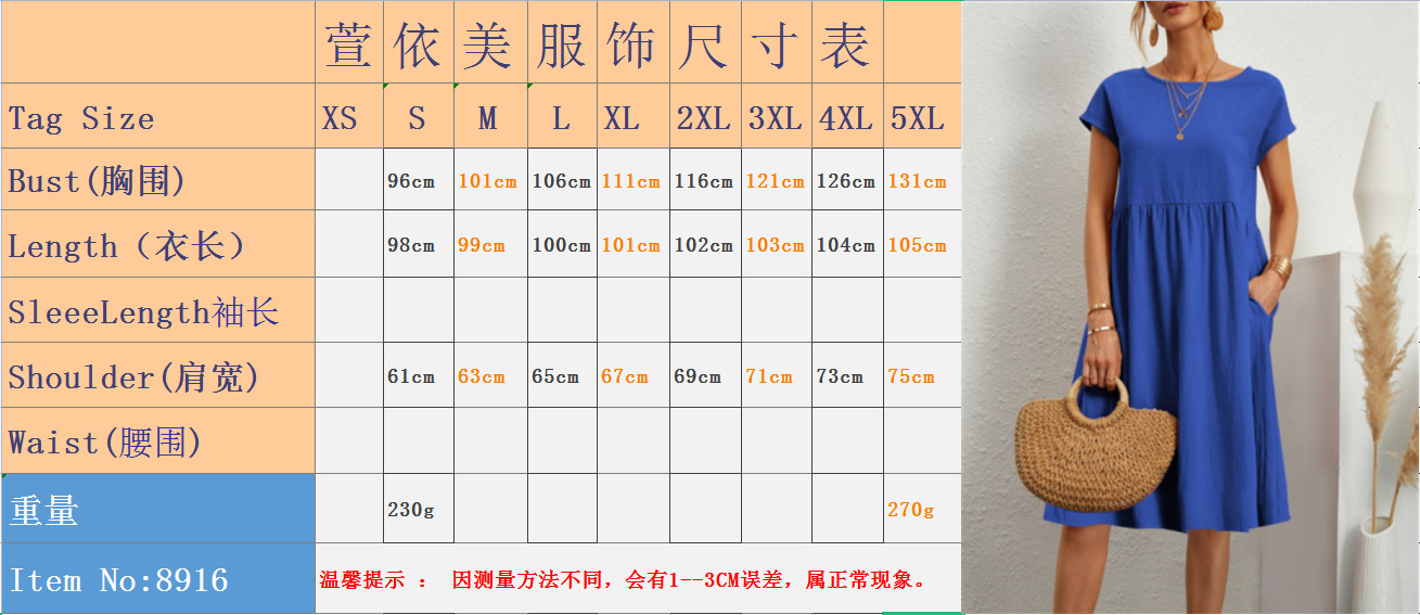 亚马逊2025欧美时尚夏季OL气质女装棉麻圆领A字裙大码宽松连衣裙