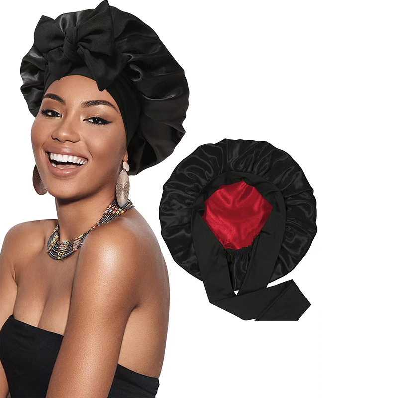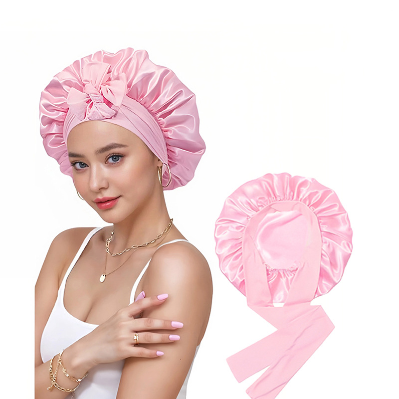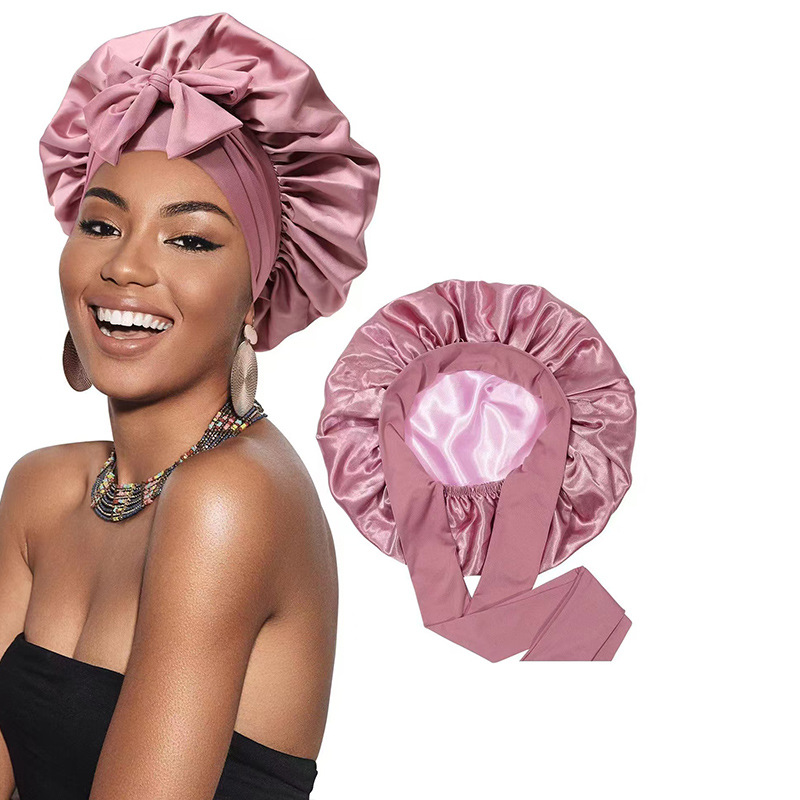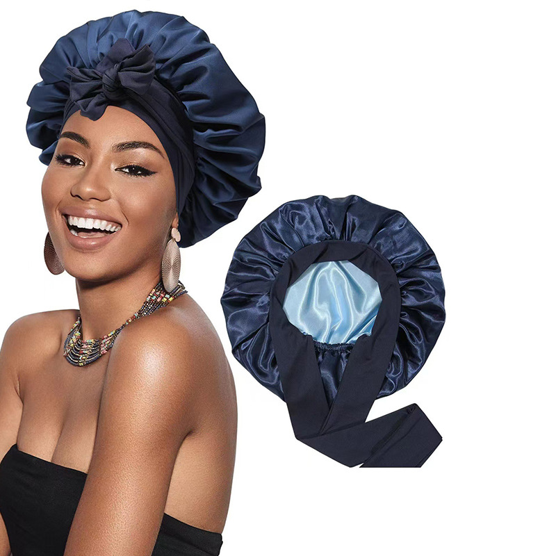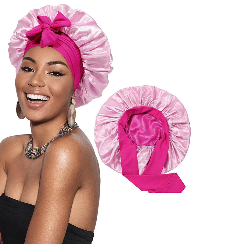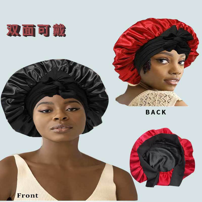 亚马逊爆款双层色丁睡帽飘带蝴蝶结仿真丝帽包头巾美容家居护发帽