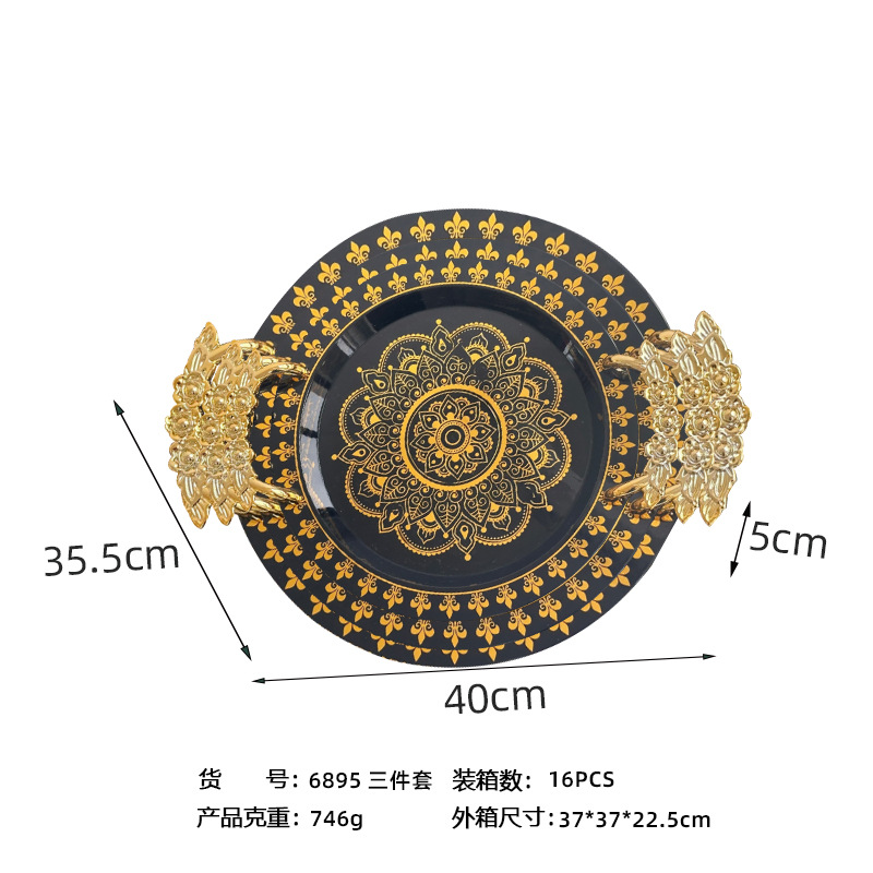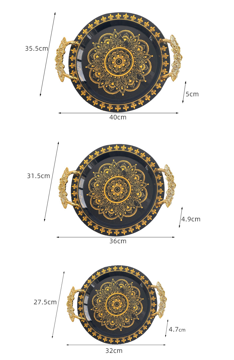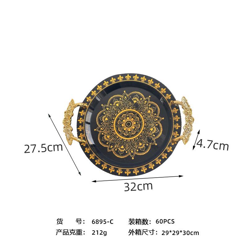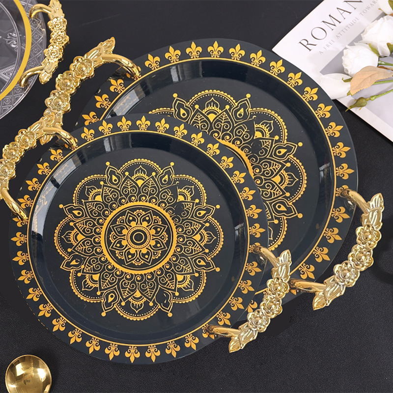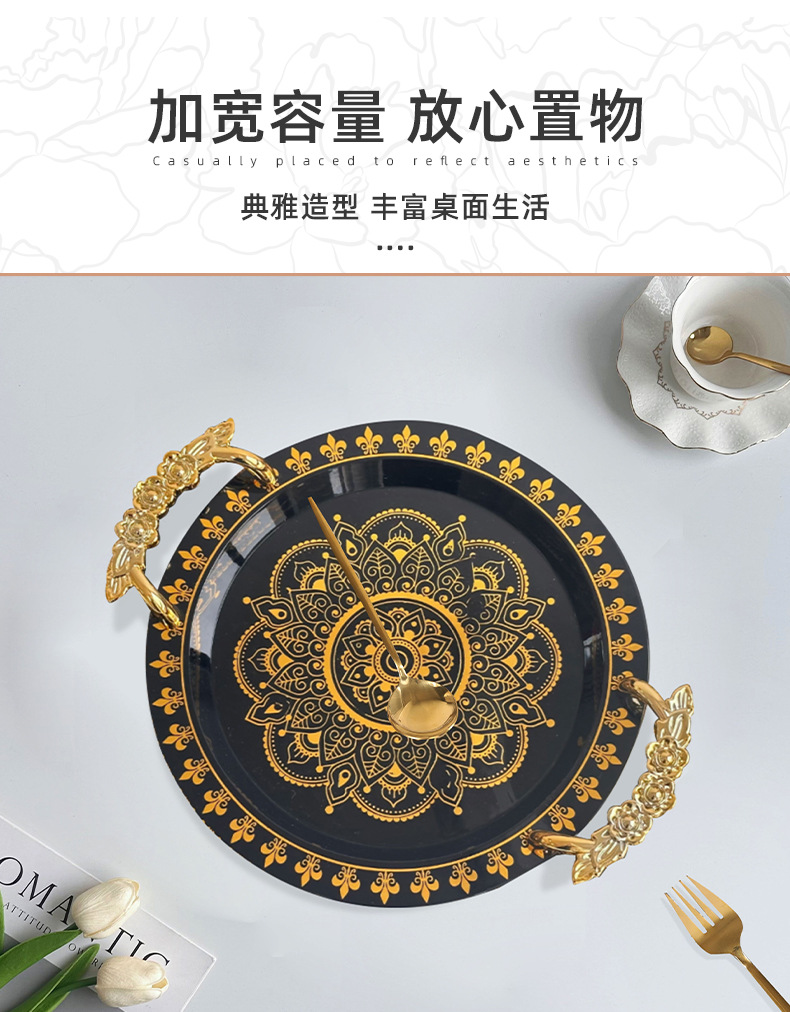 | black gilding round wide edge tray rose handle(黑色烫金圆形宽边托盘玫瑰把手) | USD $1.26 | 99980 piece available |