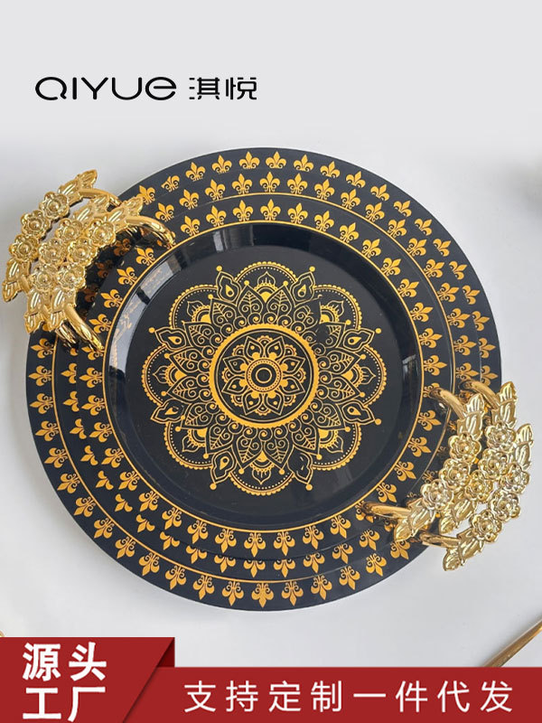 圆形烫金黑色托盘厂家批发北欧轻奢果盘茶盘高级酒店托盘欧式盘子