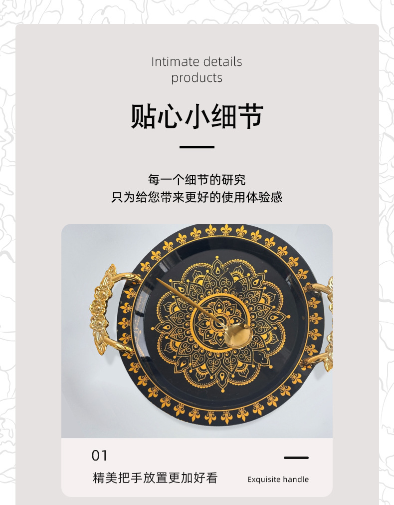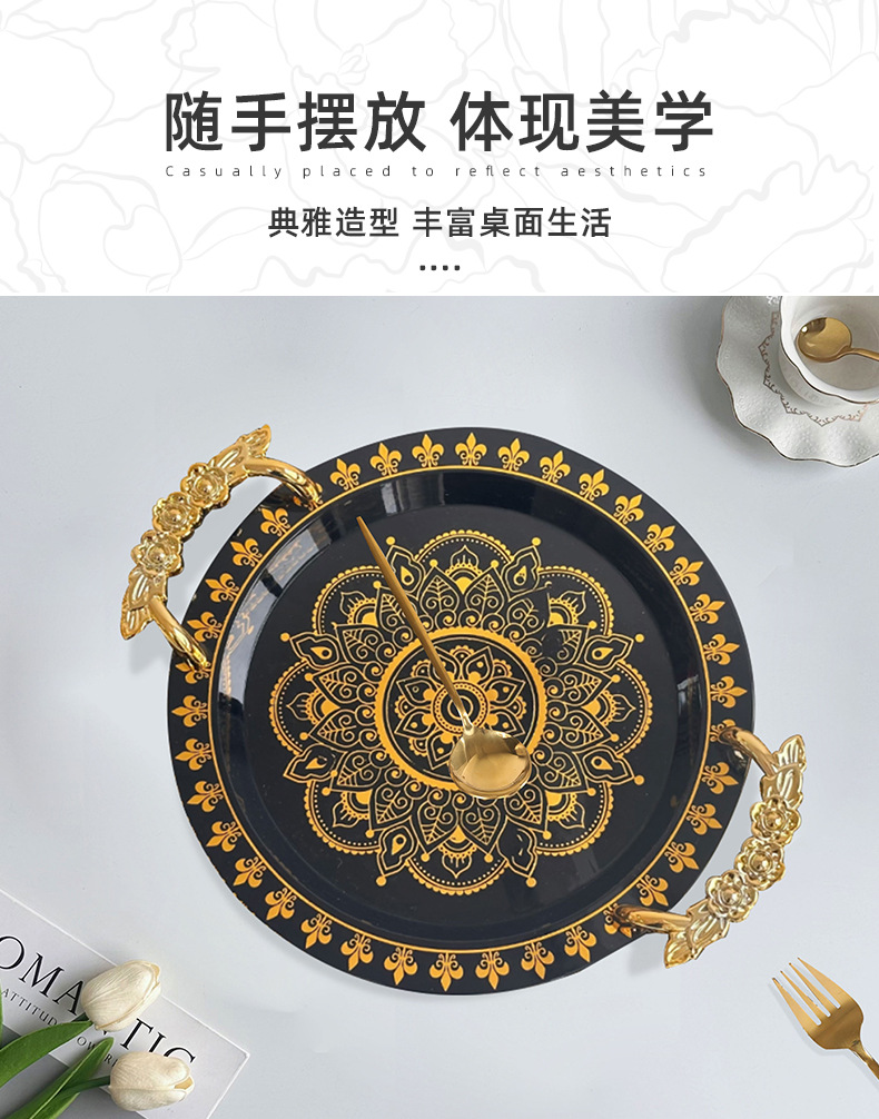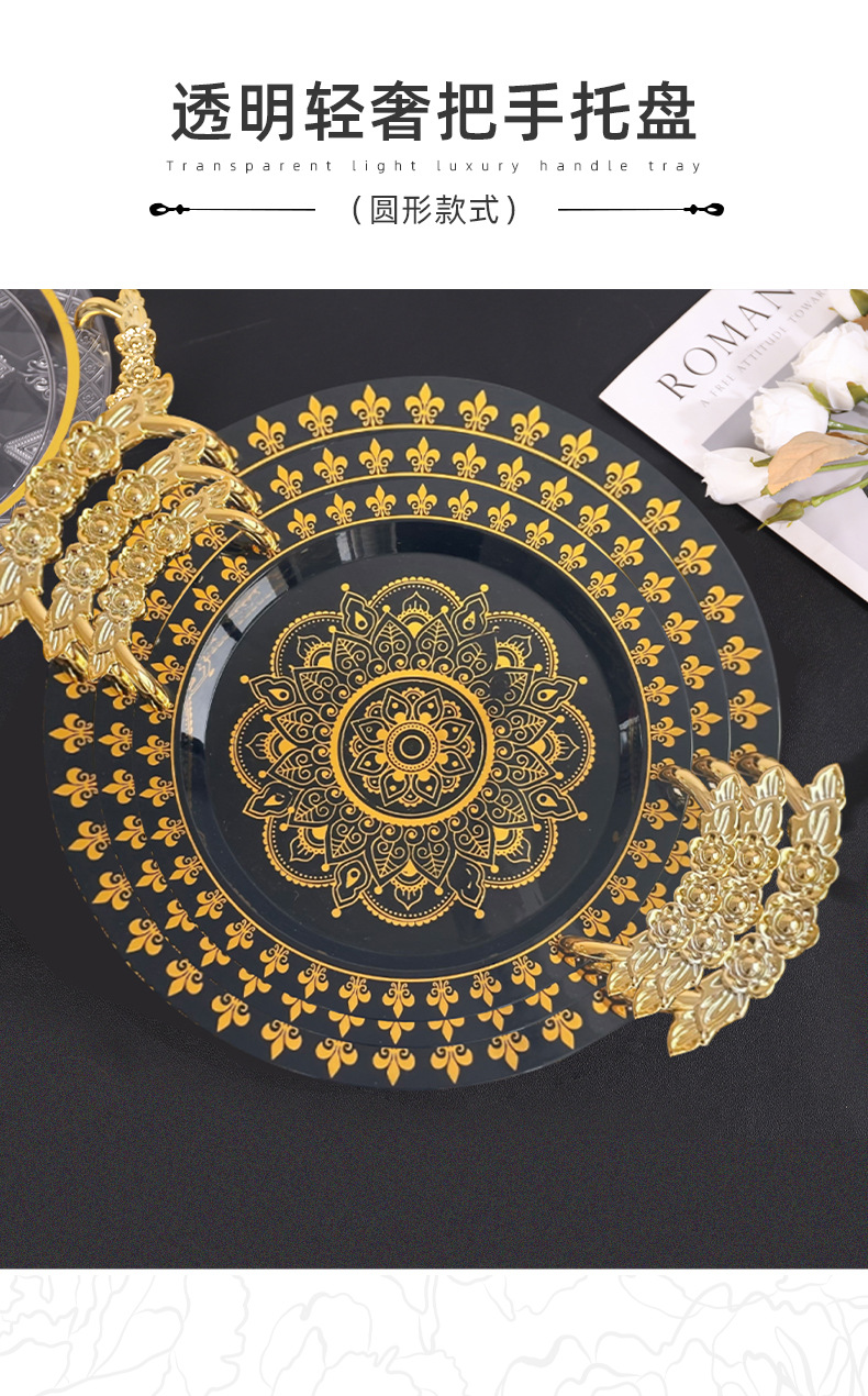 | black gilding round wide edge tray rose handle(黑色烫金圆形宽边托盘玫瑰把手) | USD $1.08 | 99984 piece available |