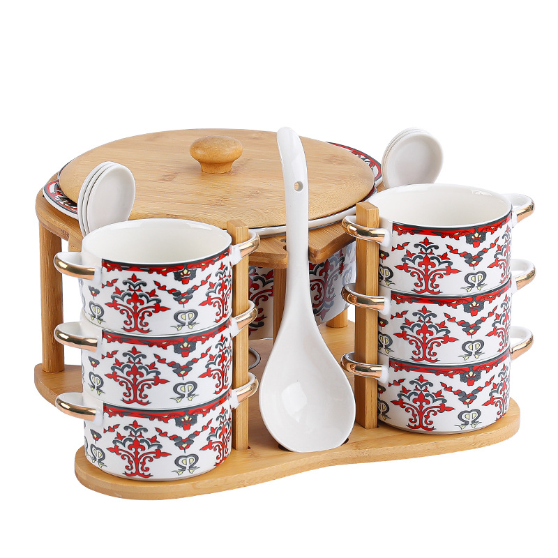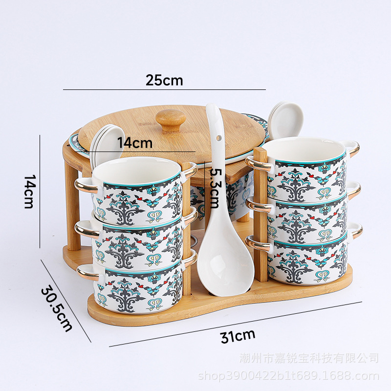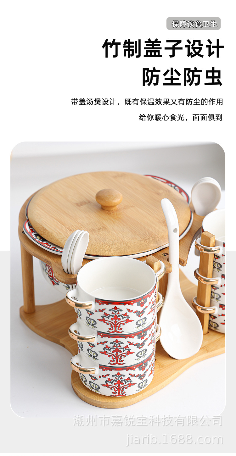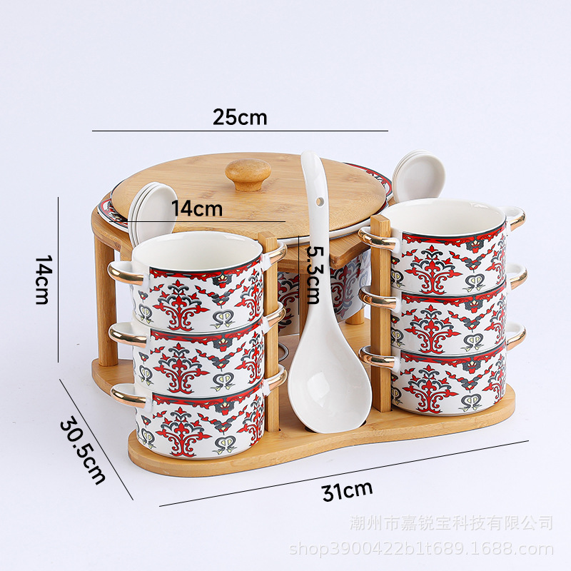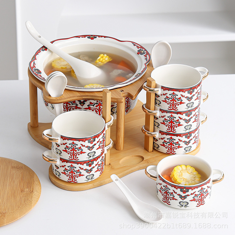 | 1 big soup bowl 1 ladel 6 bowls 6 spoons with rack(1大汤碗1大汤勺6碗6勺配架子) | USD $0.0 | 96 set available |