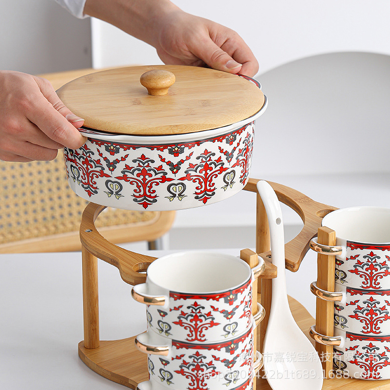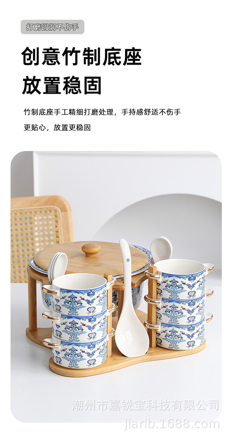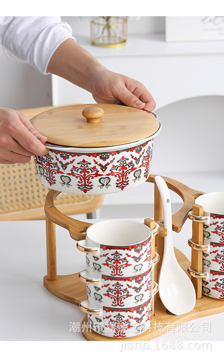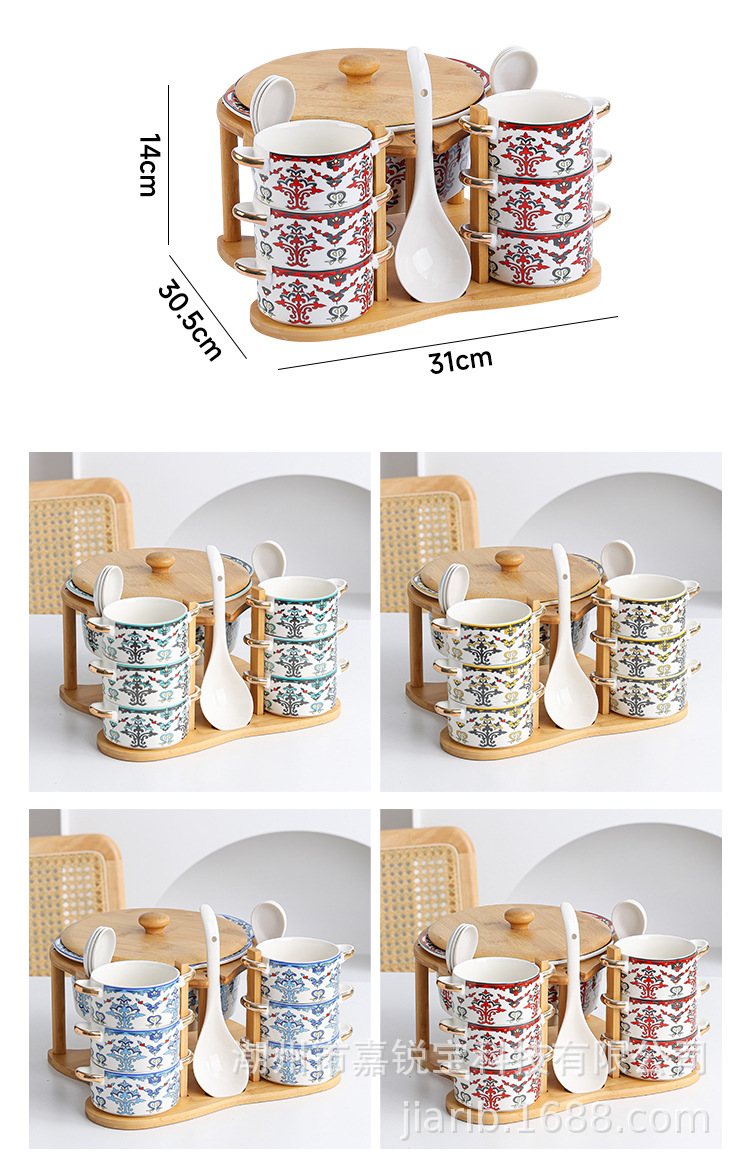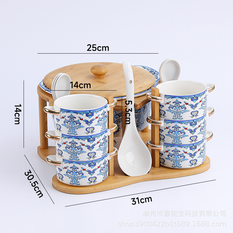 | 1 big soup bowl 1 ladel 6 bowls 6 spoons with rack(1大汤碗1大汤勺6碗6勺配架子) | USD $0.0 | 96 set available |