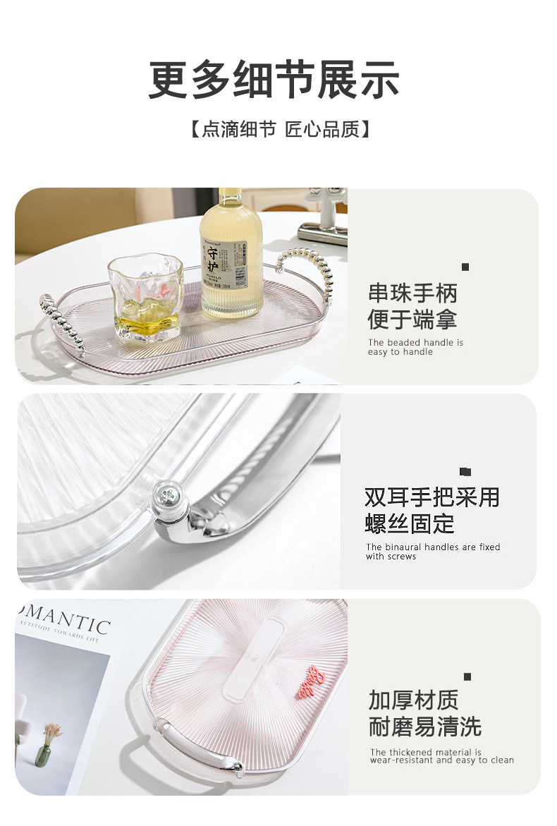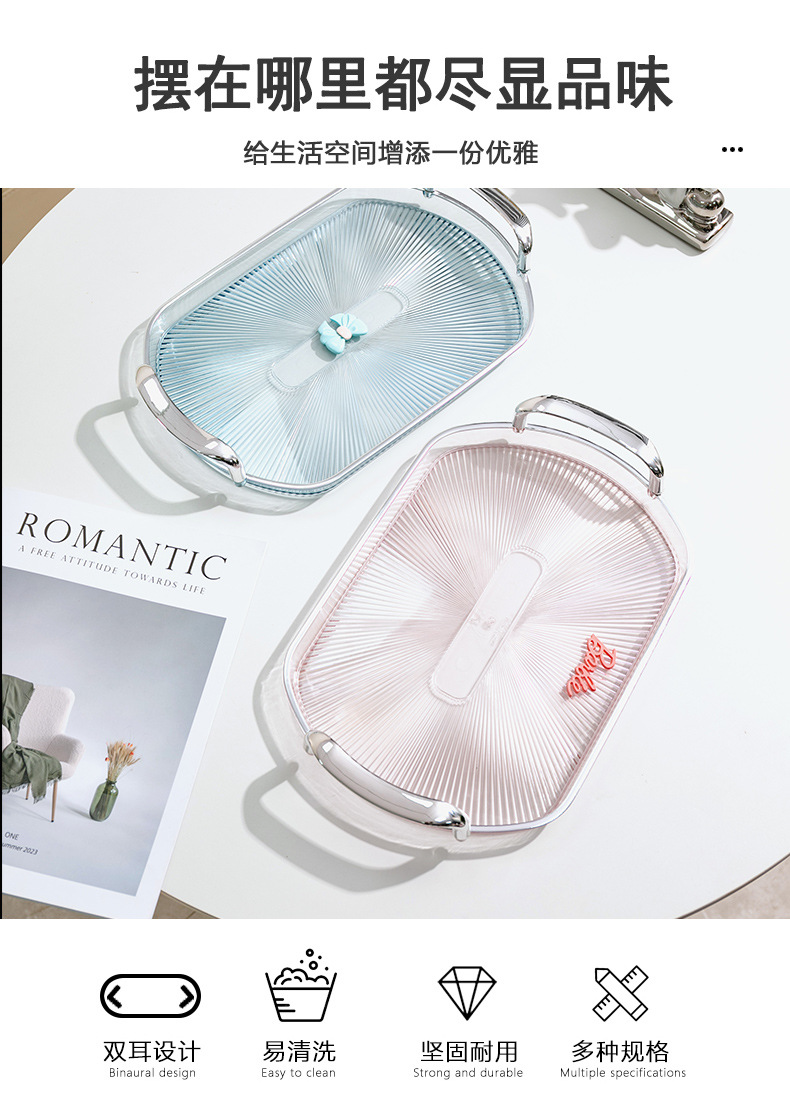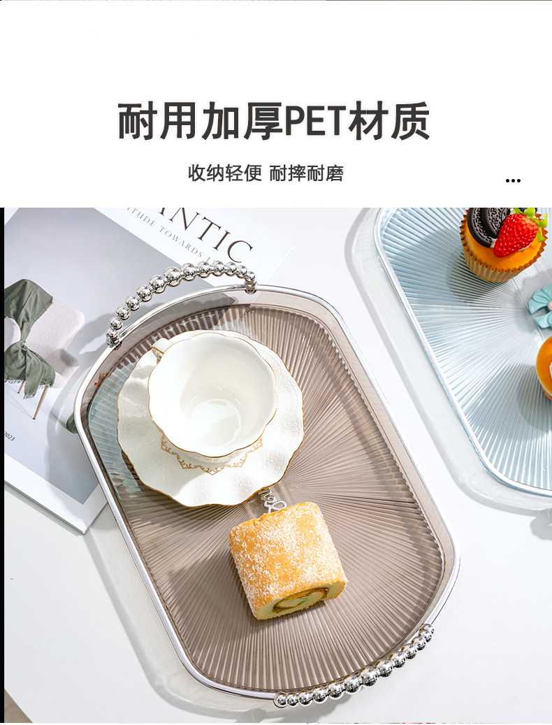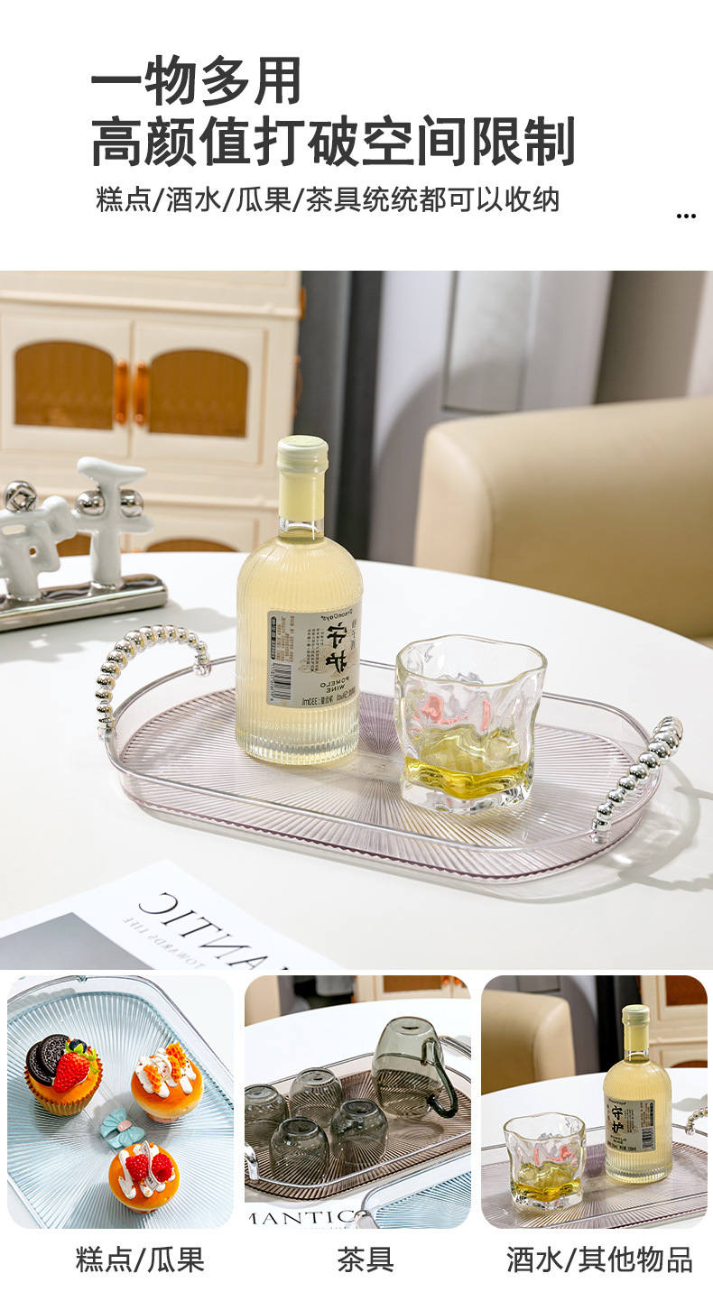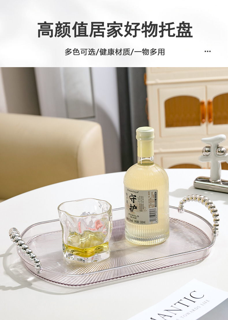 椭圆透明粉色镀银轻奢茶盘客厅茶几托盘放茶杯水杯收纳盘水果盘