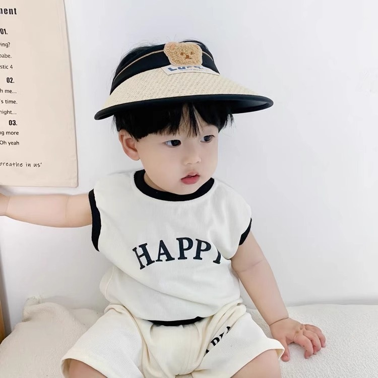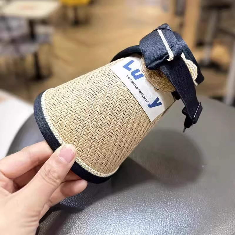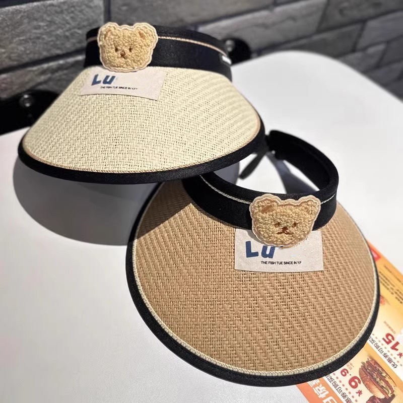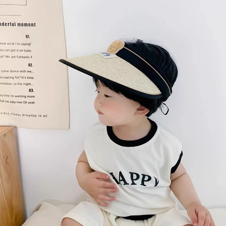 儿童帽子夏季男女宝宝卡通小熊草编太阳帽大檐防紫外线遮阳帽