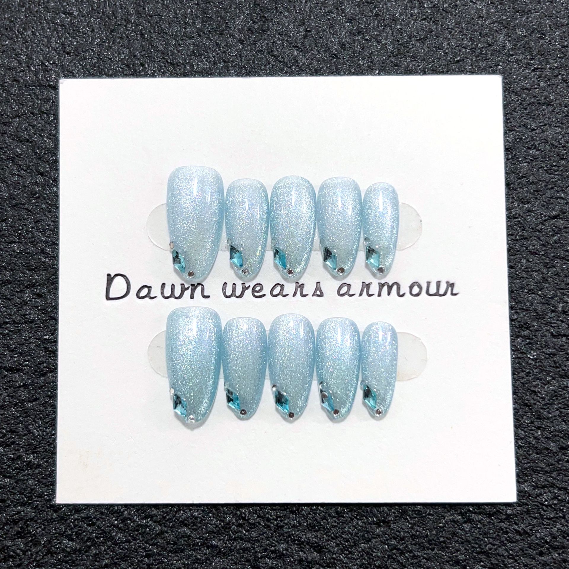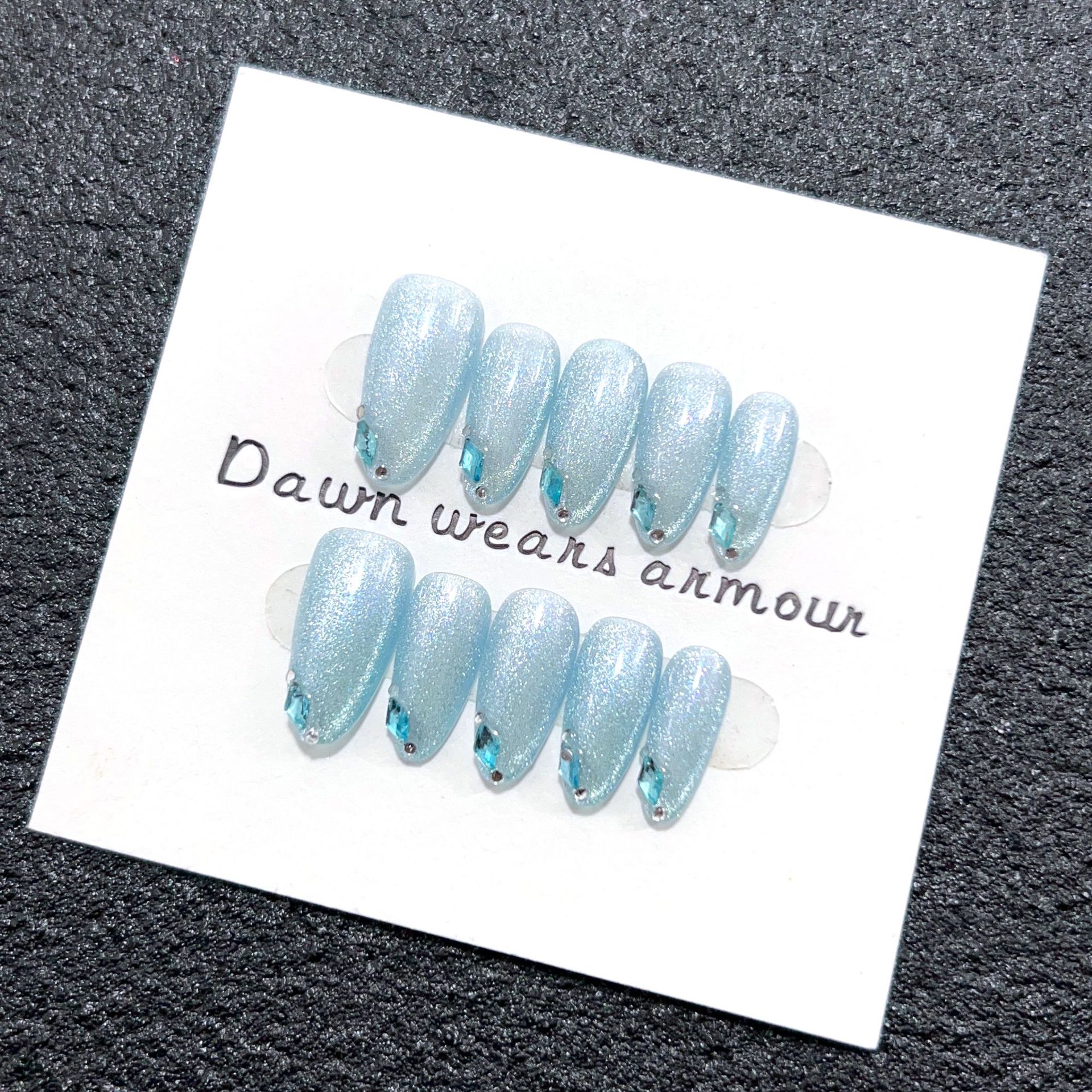 浮生如梦纯手工穿戴甲短款蓝色爆闪猫眼美甲贴清新ins可拆卸甲片