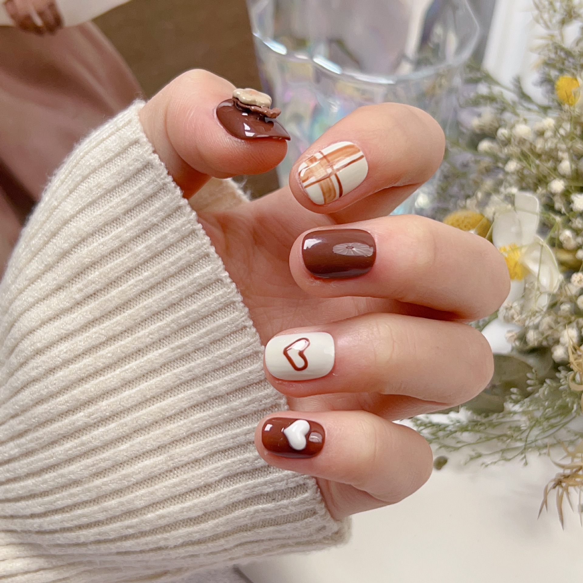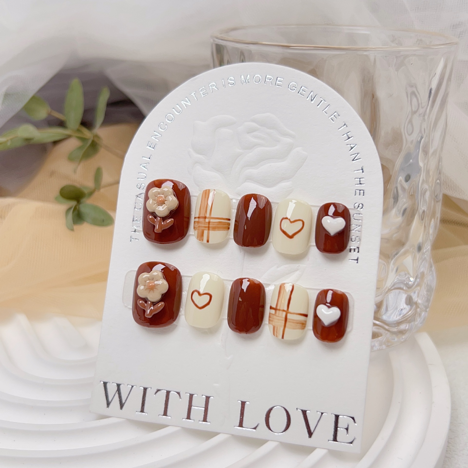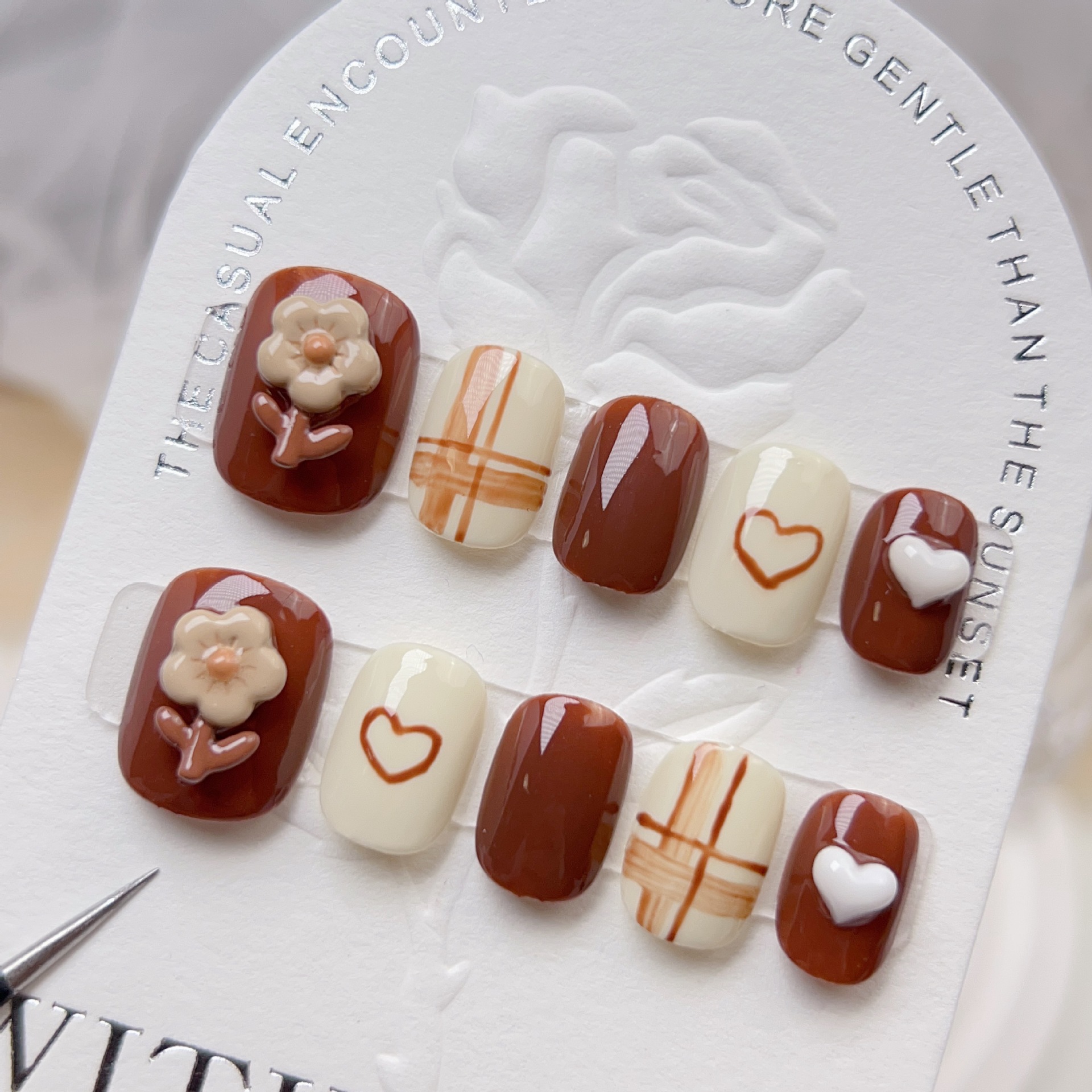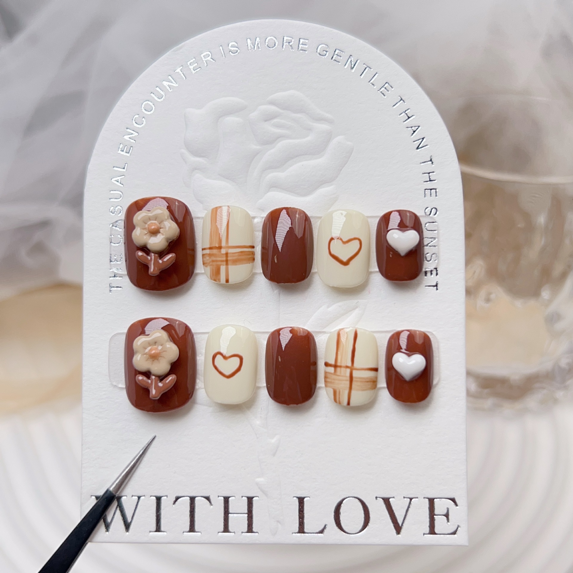 纯手工穿戴甲焦糖奶茶短方圆可爱风手绘花朵线条晕染学生甲片成品
