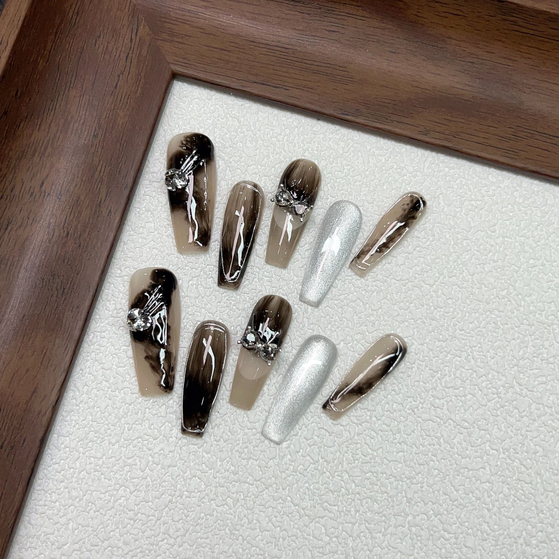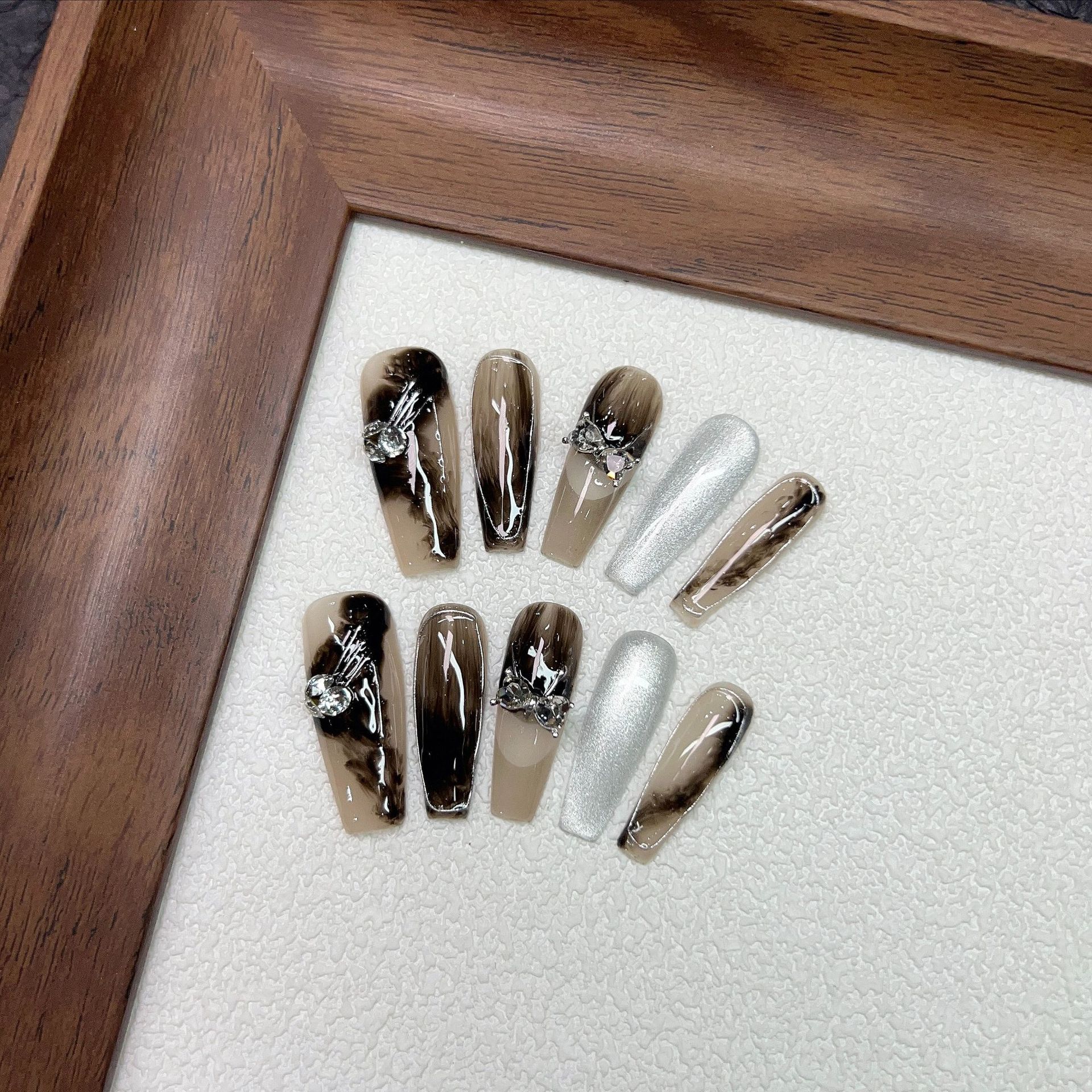 秋冬新款手工穿戴甲暗夜缪斯欧美长款晕染贴钻美甲贴可拆卸甲片女
