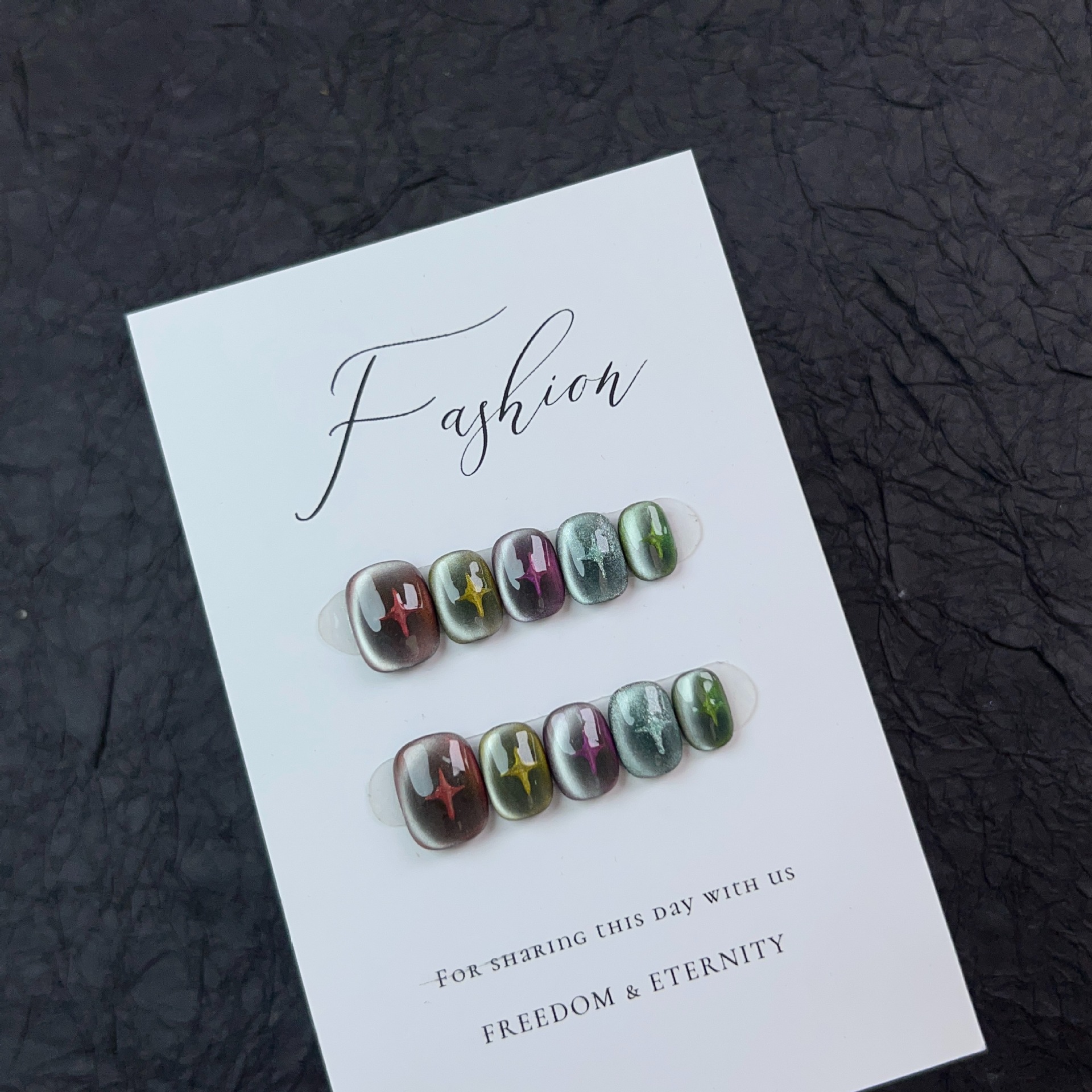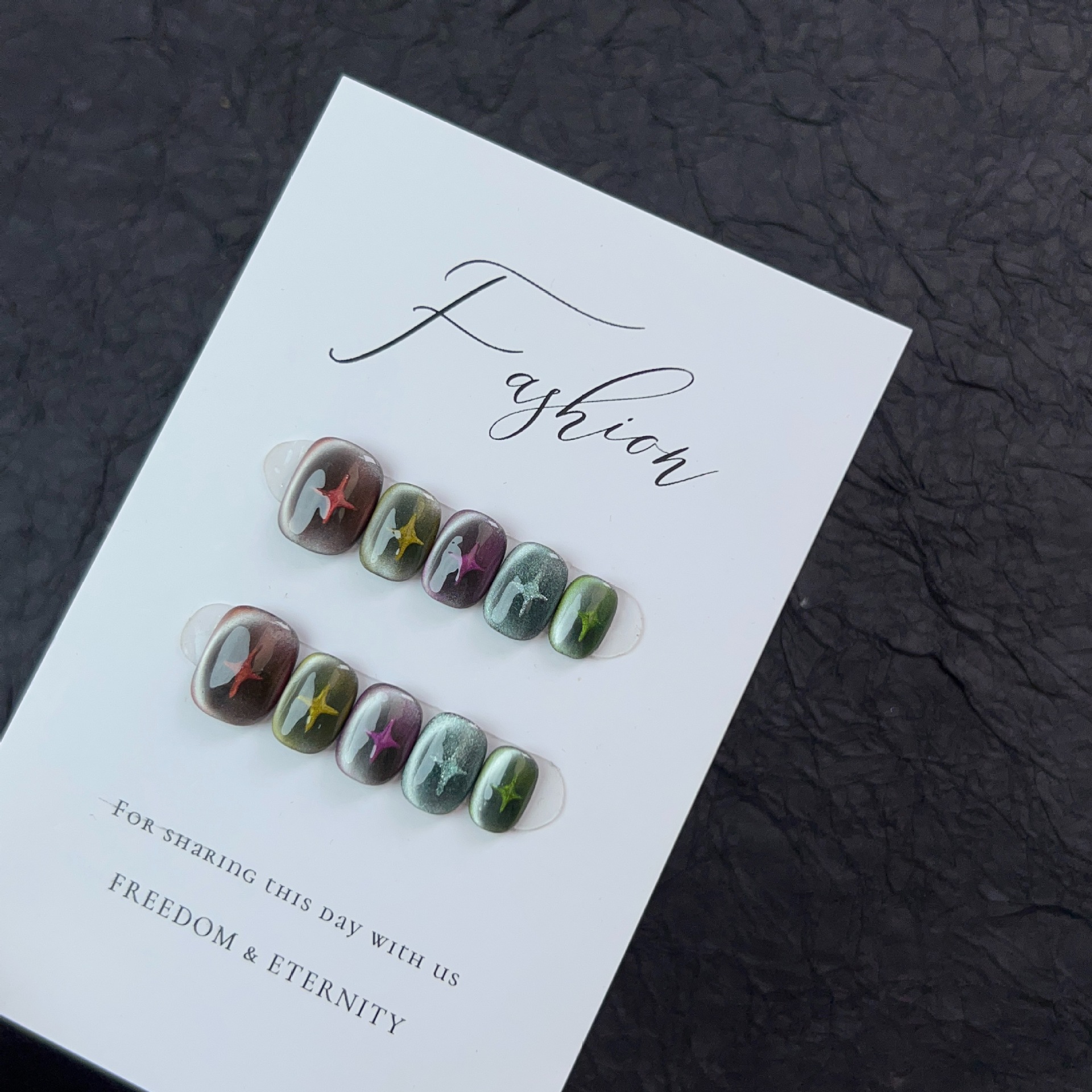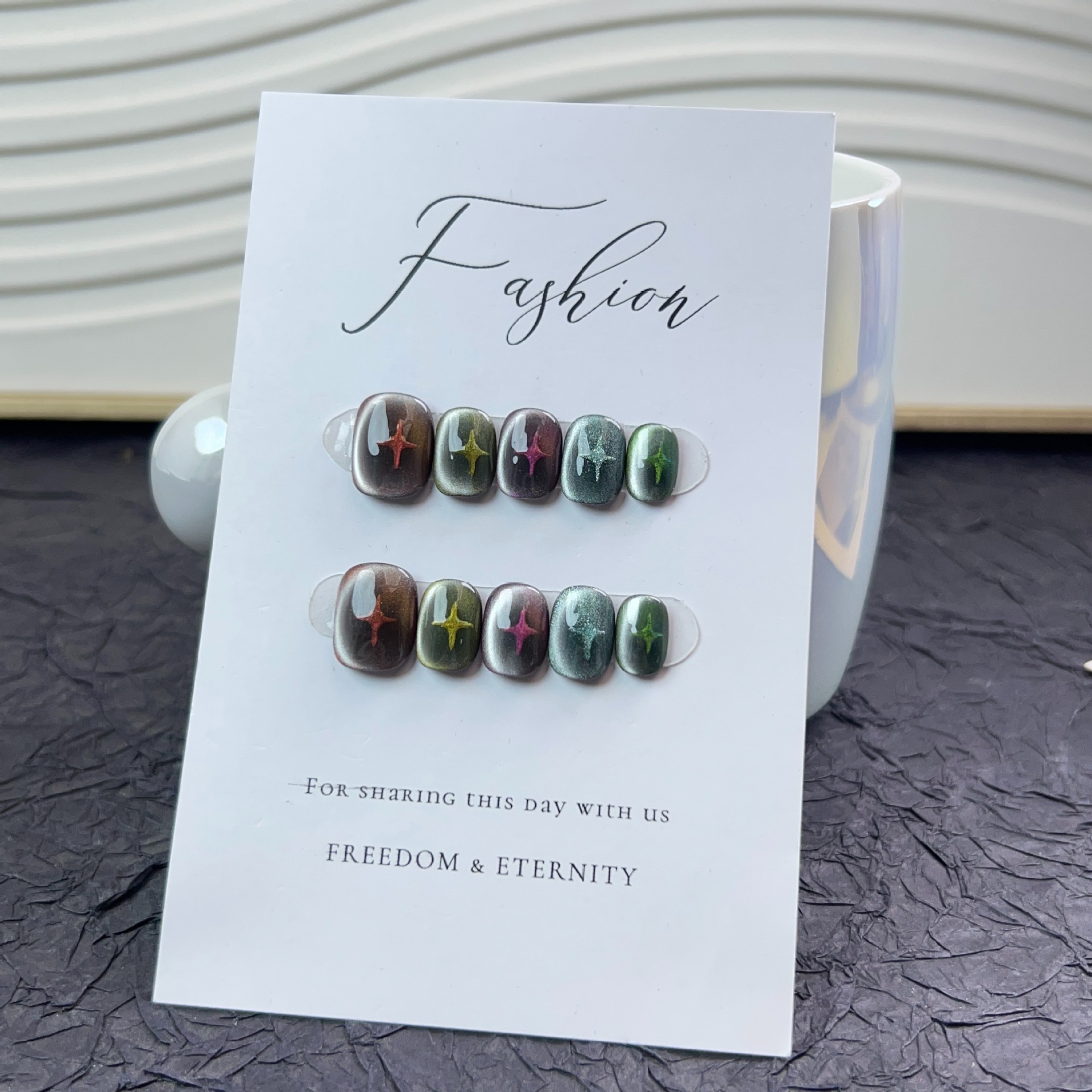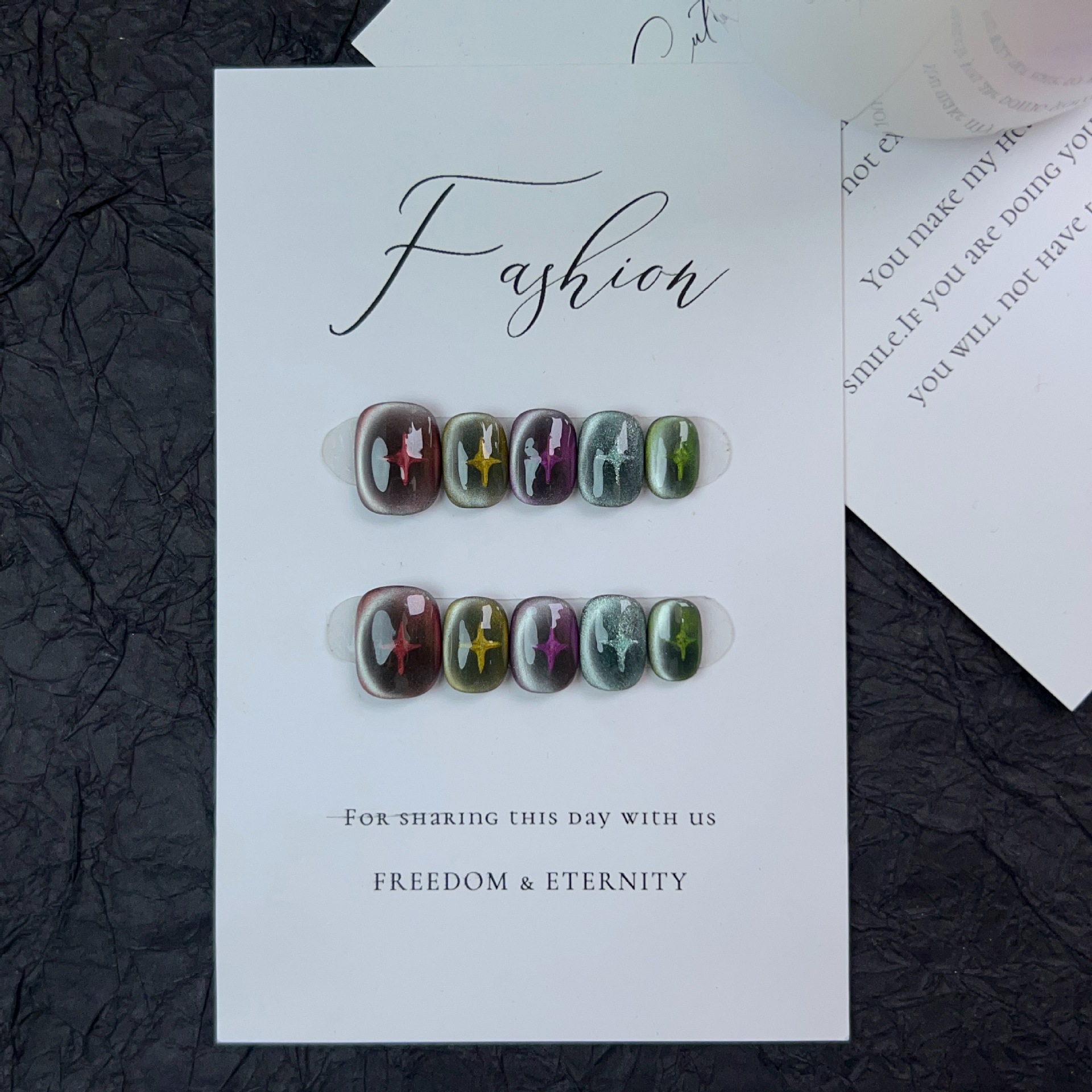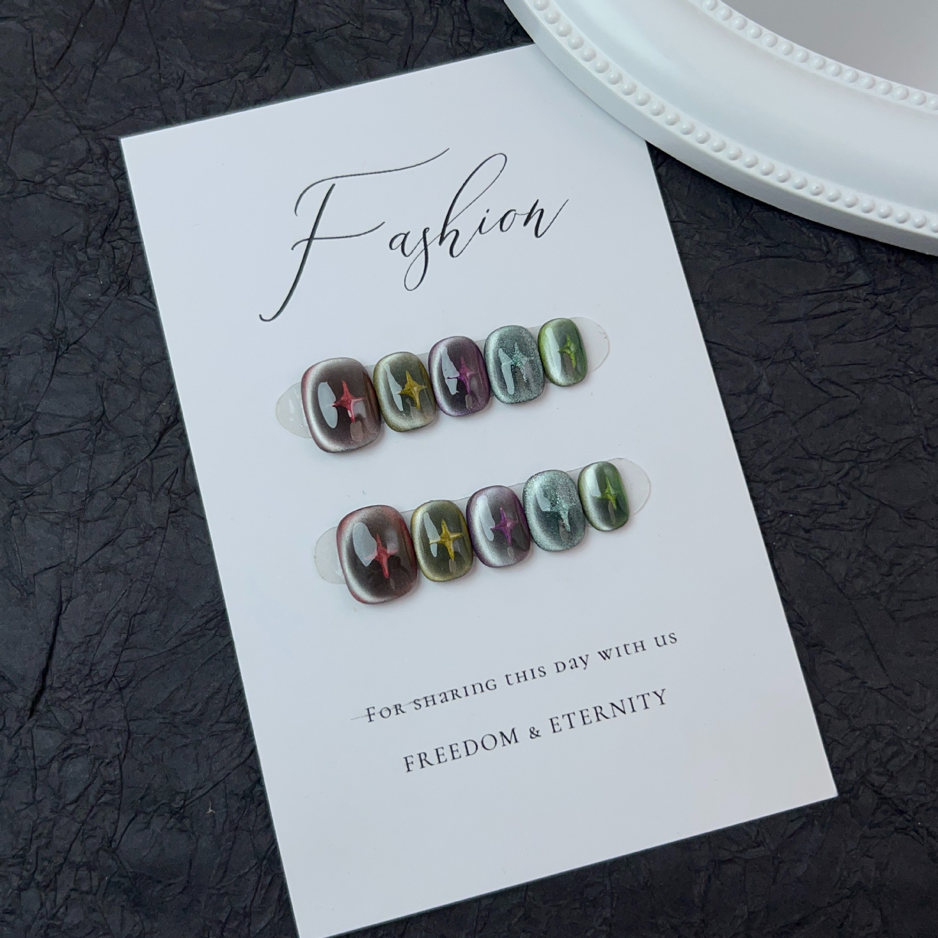 眼中有光纯手工穿戴甲短款多彩猫眼美甲贴四芒星爆闪可拆卸甲片