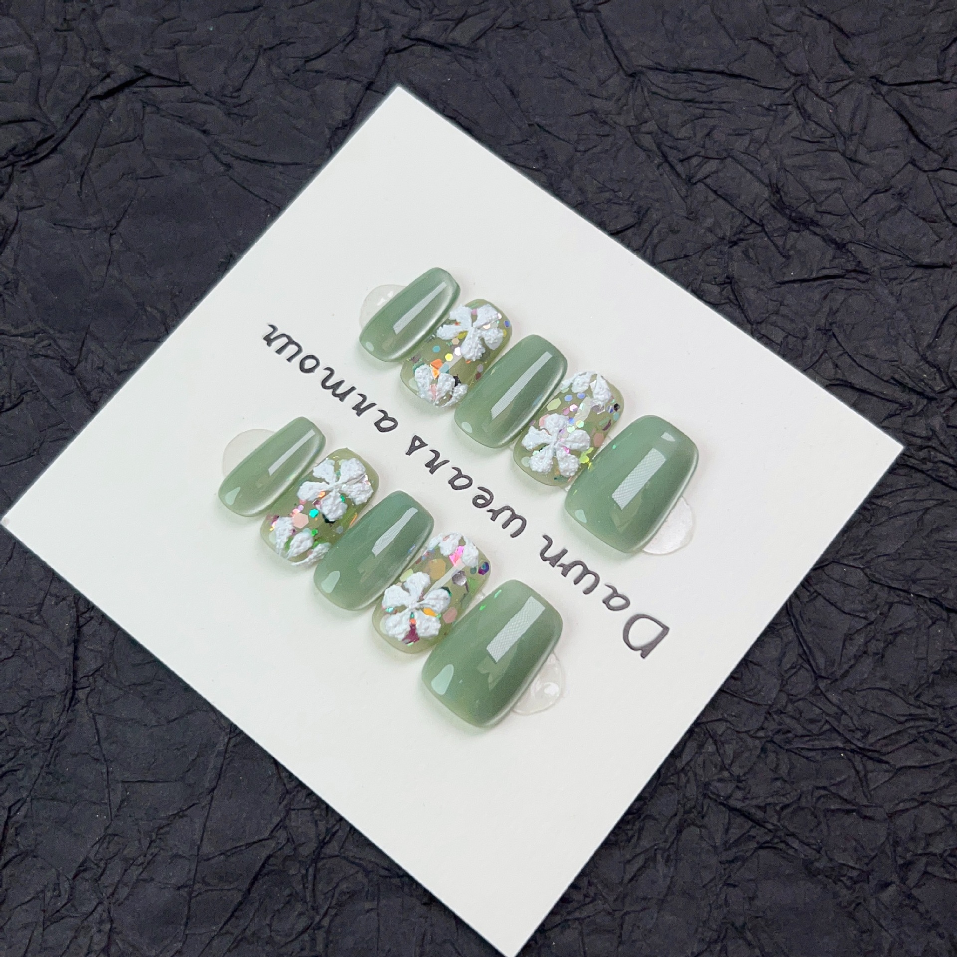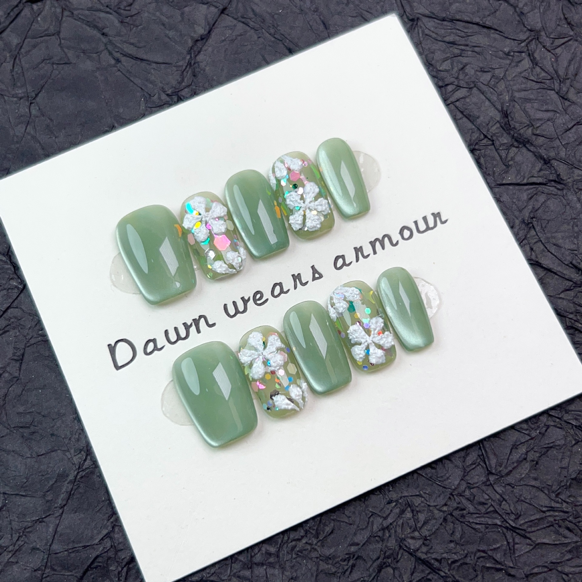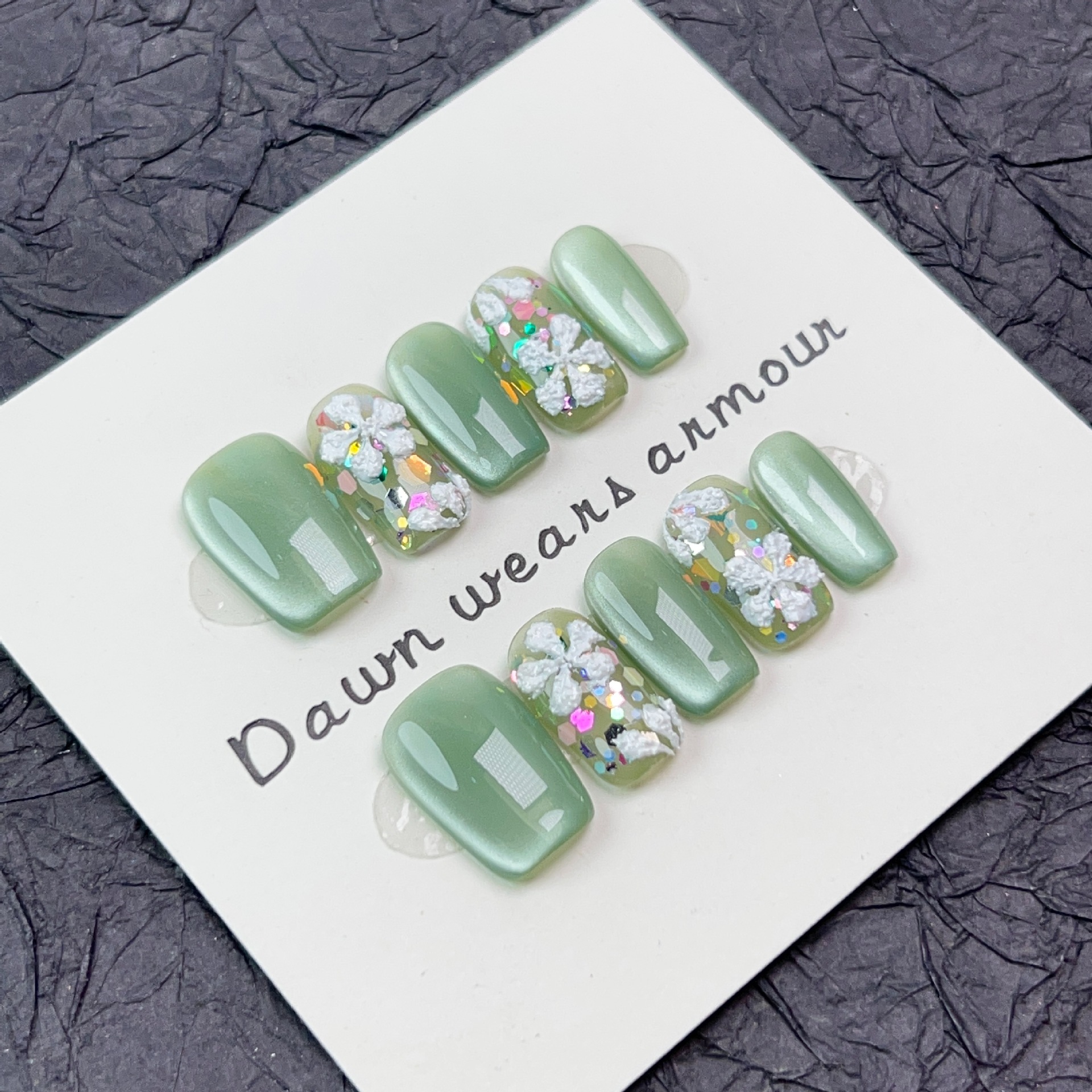 光影密林纯手工穿戴甲短款爆闪绿色玻璃猫眼小清新小花可拆卸甲片