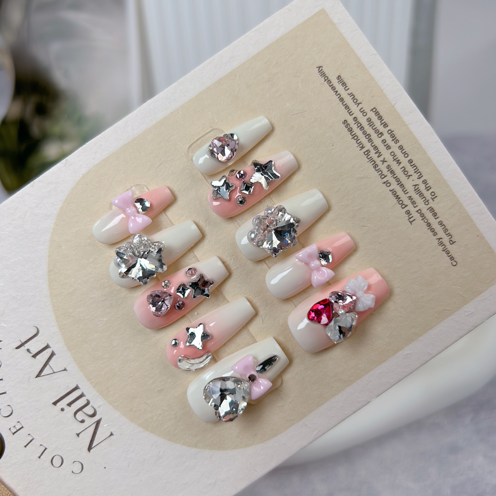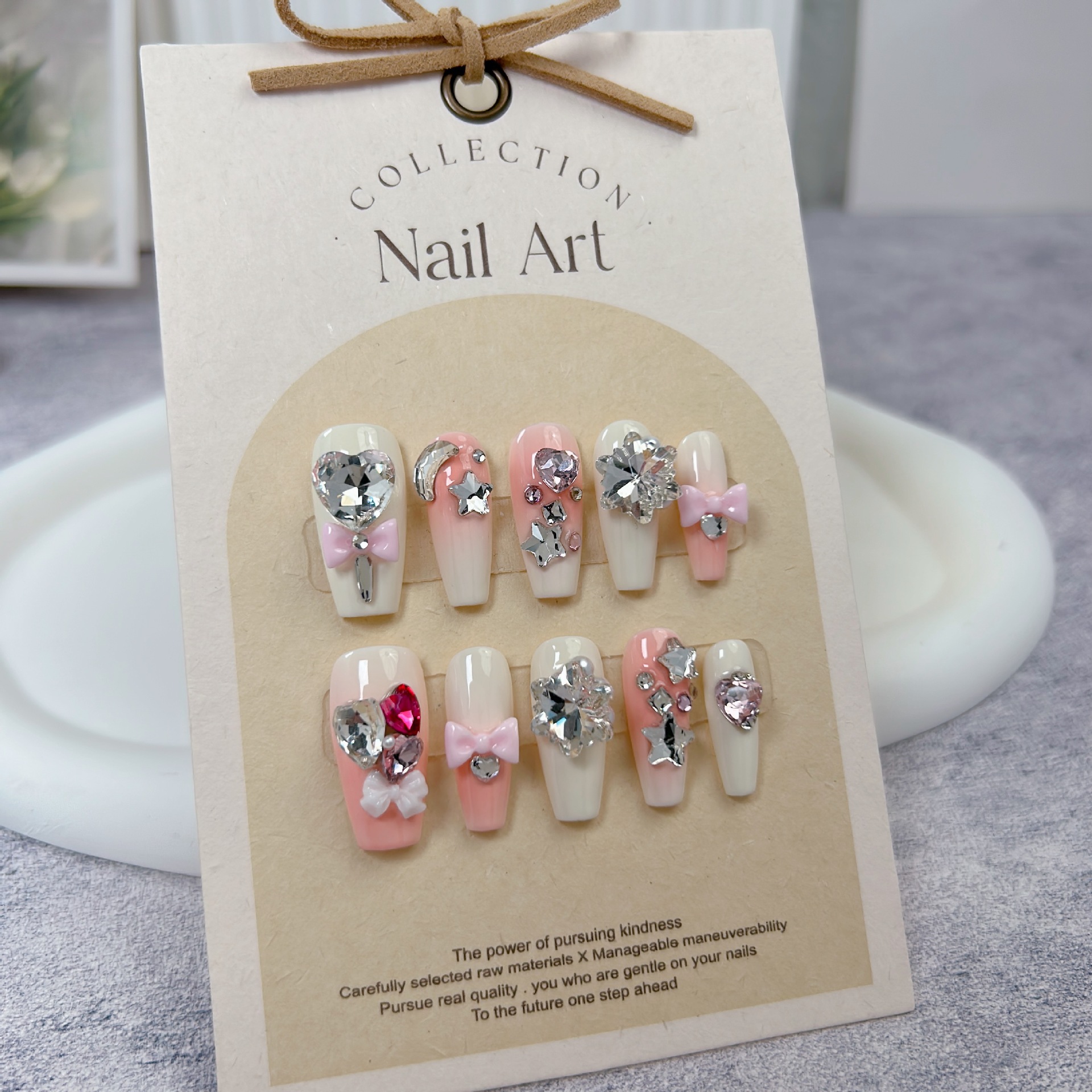 批发纯手工穿戴甲白桃奶盖粉蝴蝶结美甲贴片中长款反复使用可拆卸