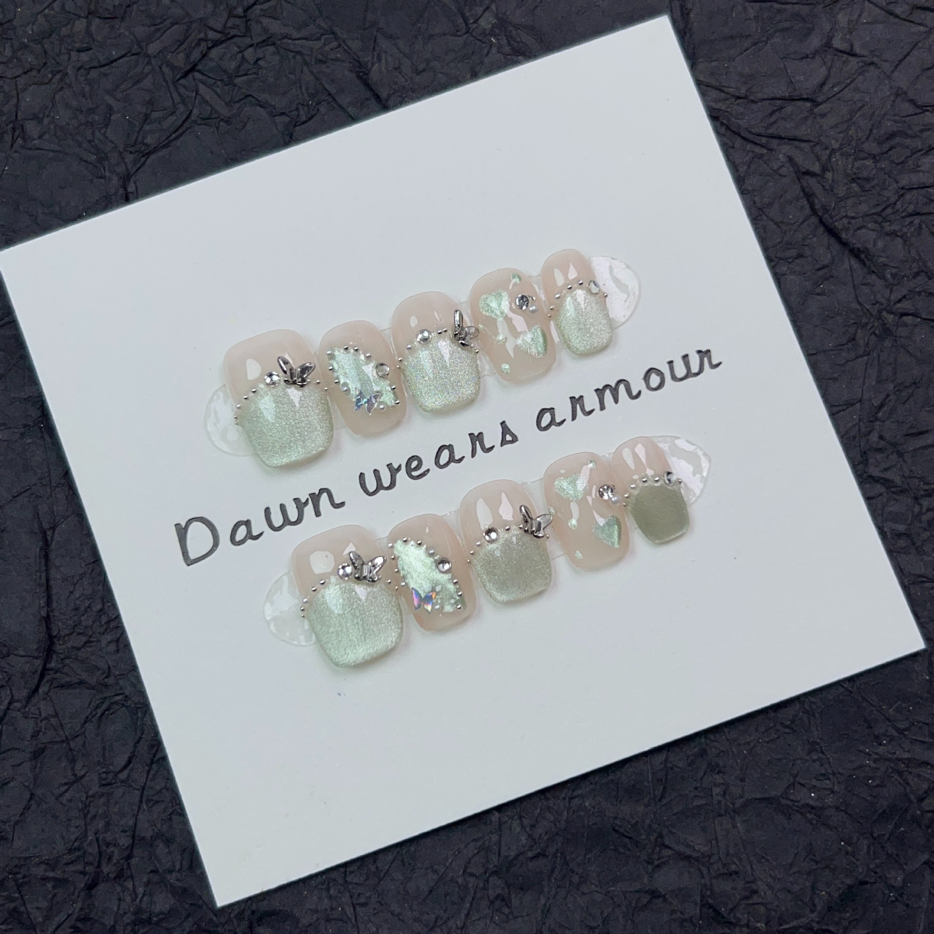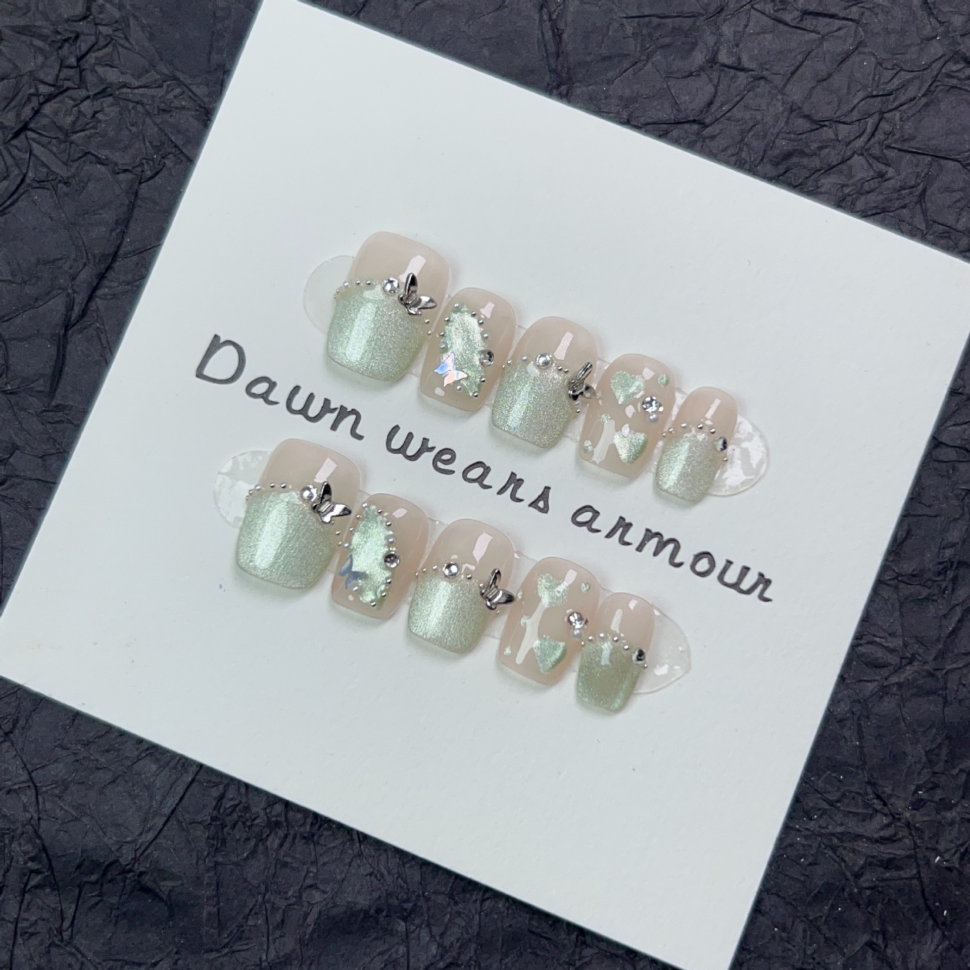 烟雨初菏纯手工穿戴甲裸色冰透晶石猫眼美甲成品ins光疗指甲贴片