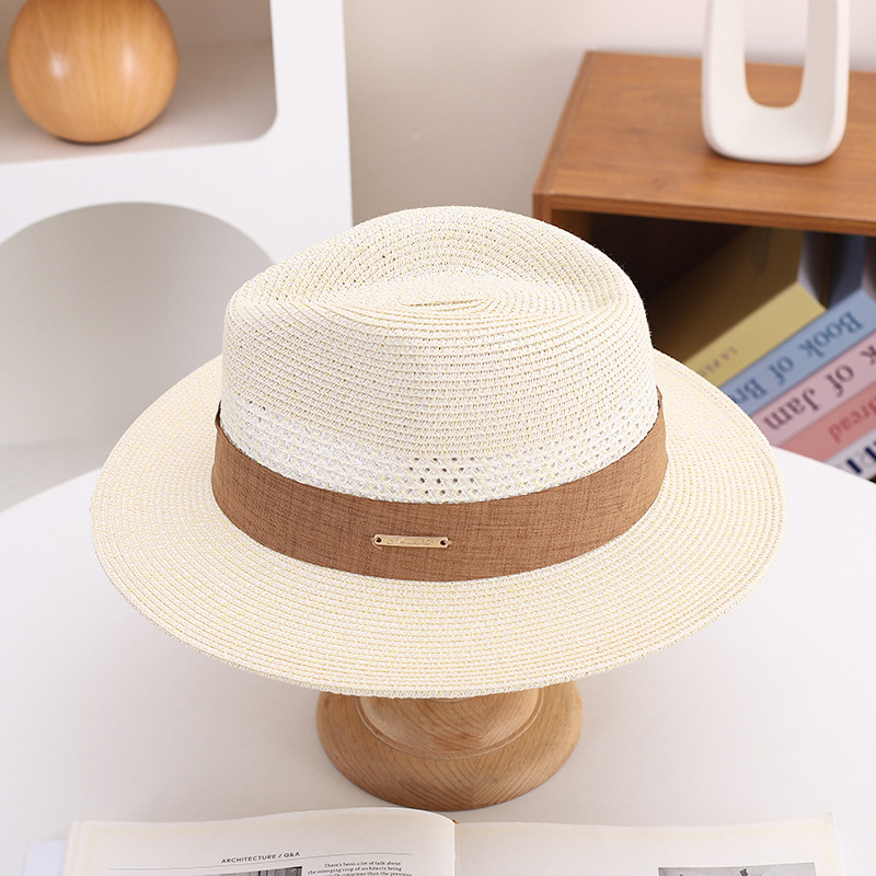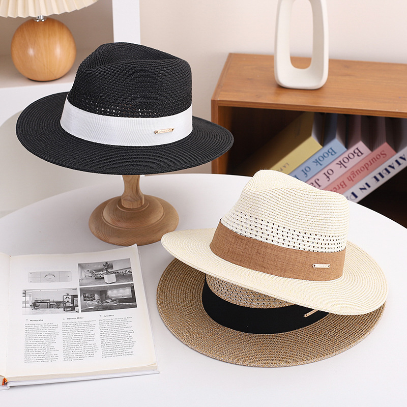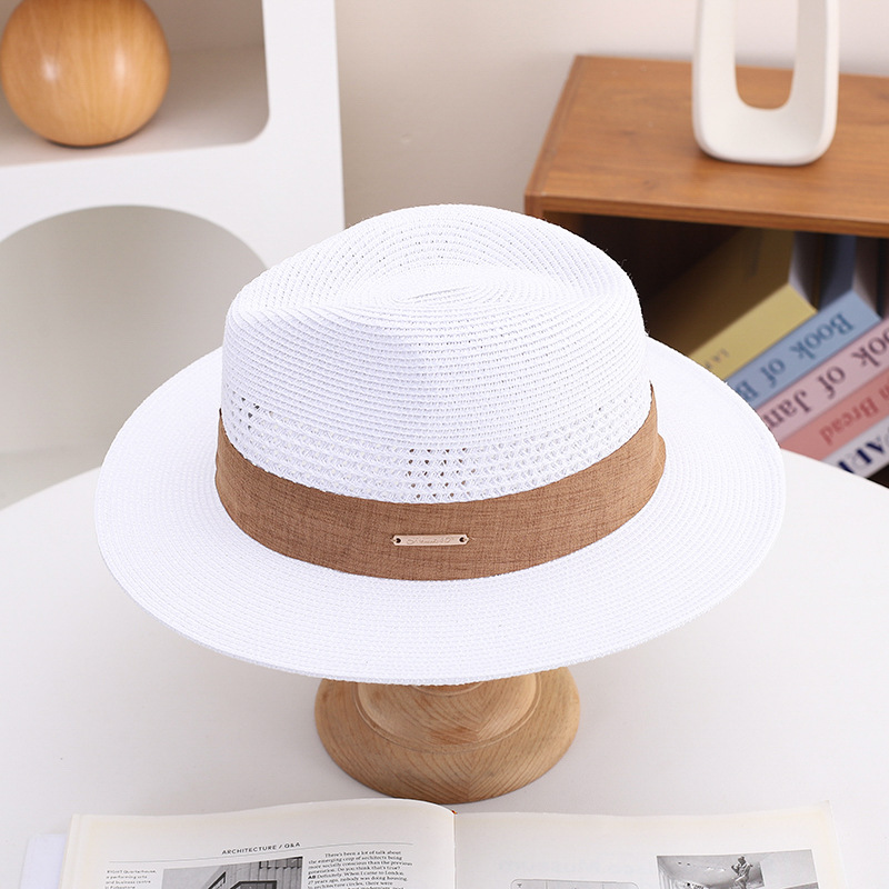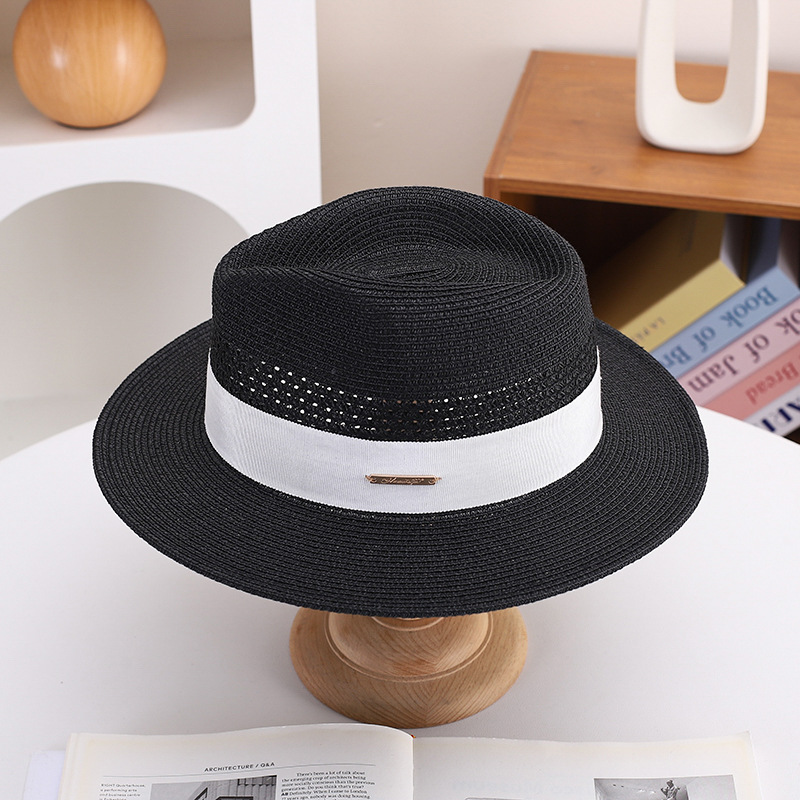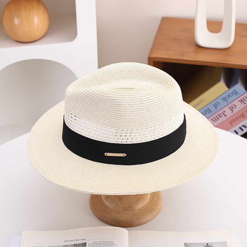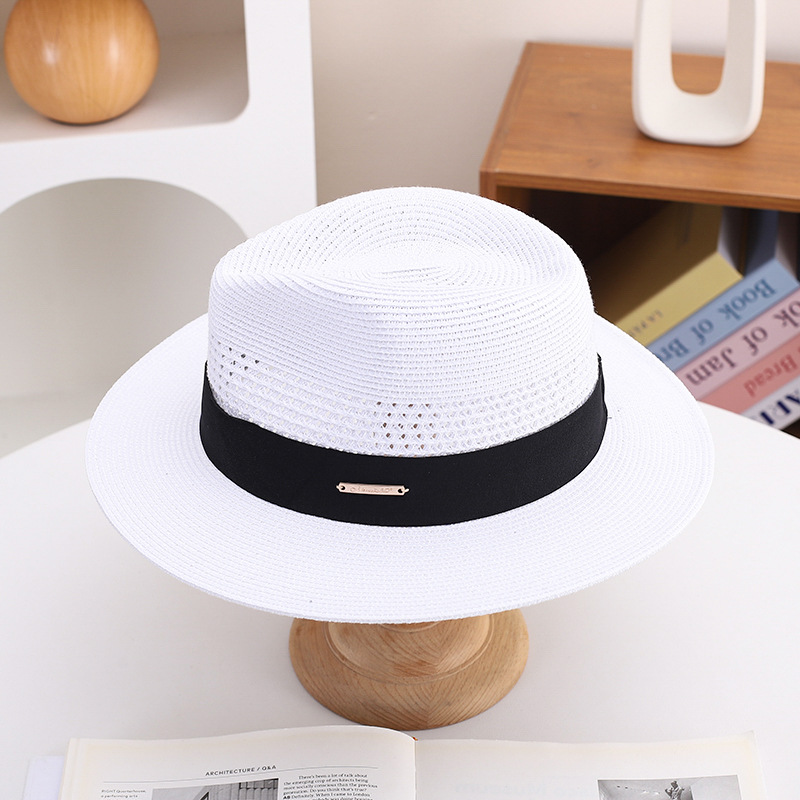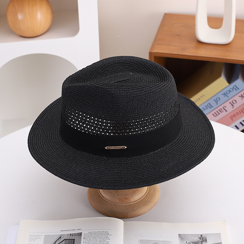 跨境热卖草帽女夏海边遮阳平顶帽镂空顶编织防晒帽子休闲帽透气