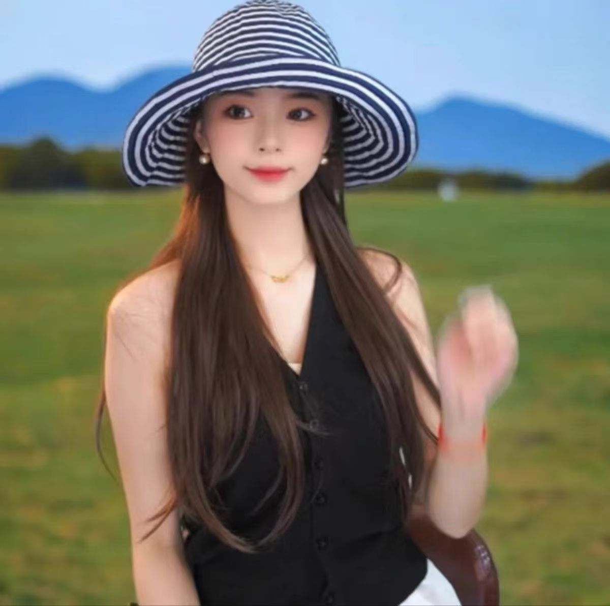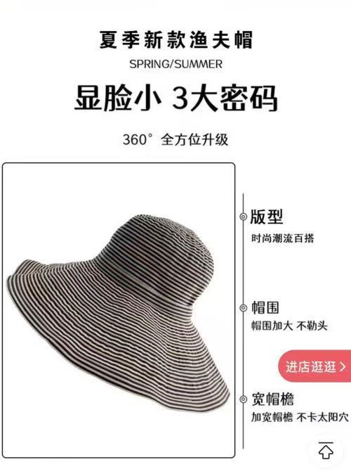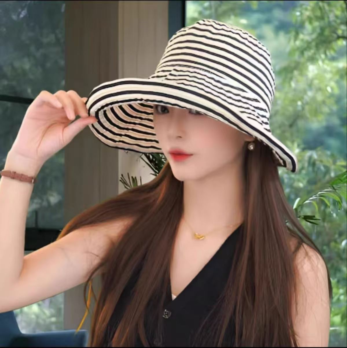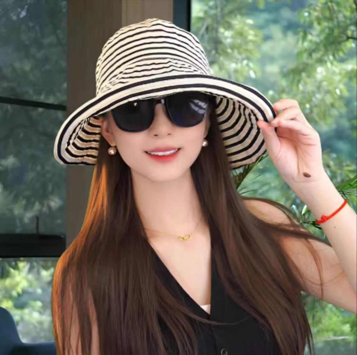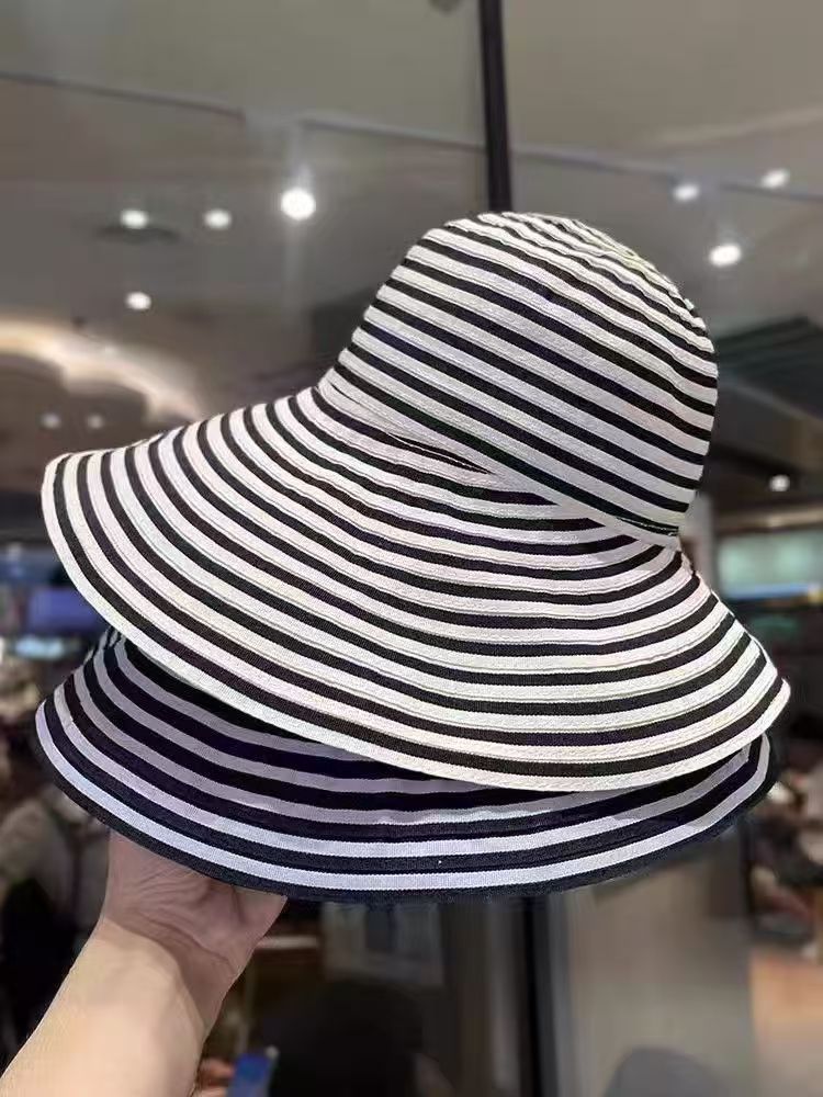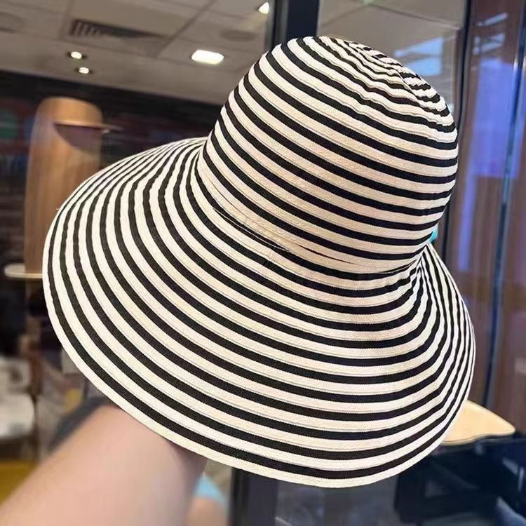新款日韩系可折叠春秋条纹渔夫帽帽檐防晒帽子时尚盆帽大沿太阳帽