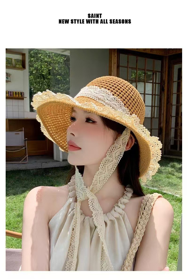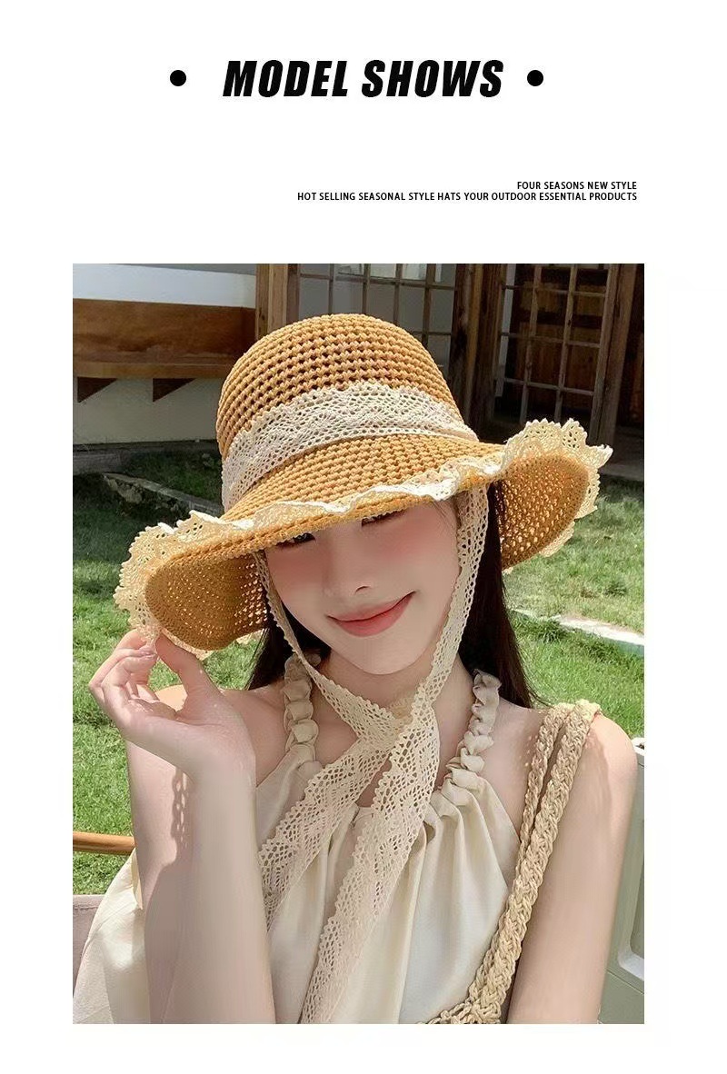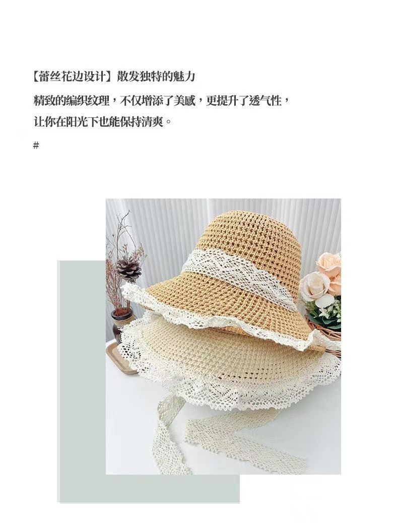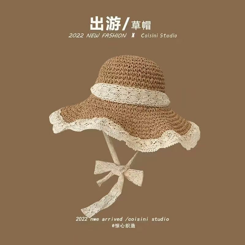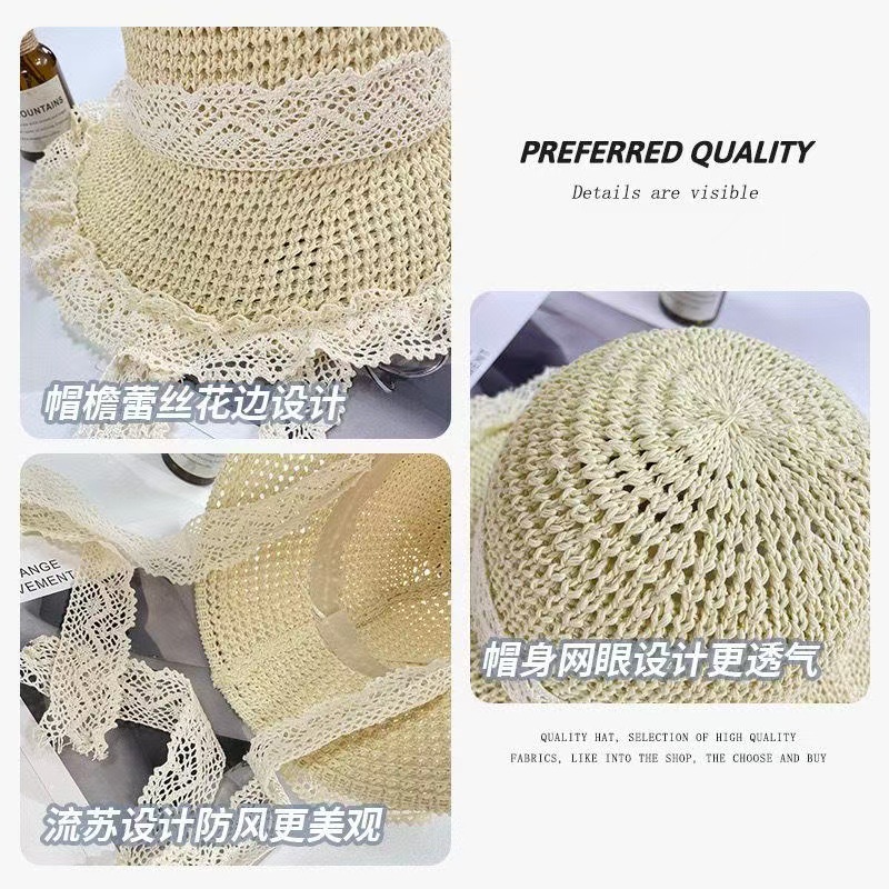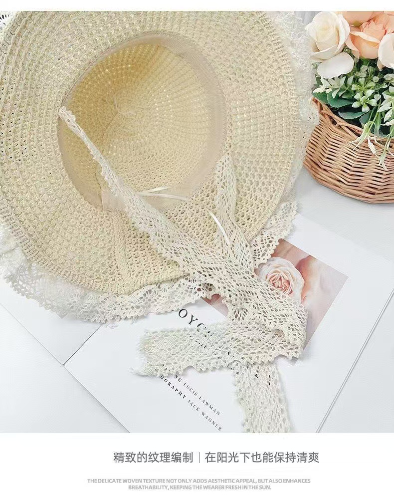 小众洋气遮阳帽子甜美渔夫帽透气蕾丝蝴蝶结大帽檐草帽女女款
