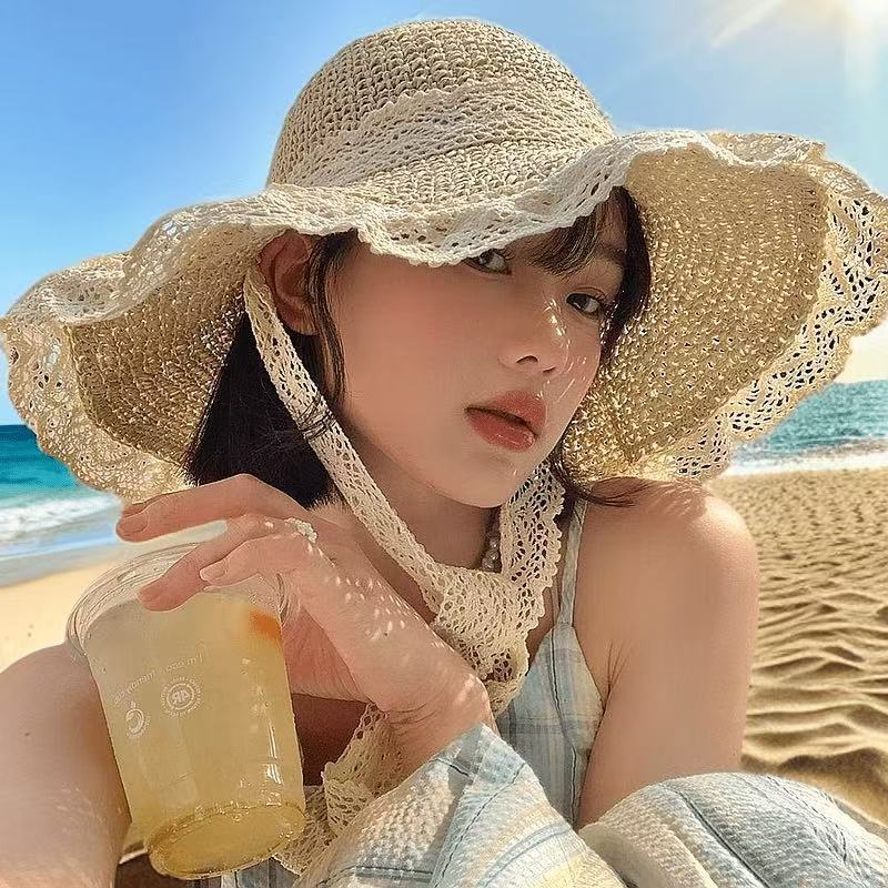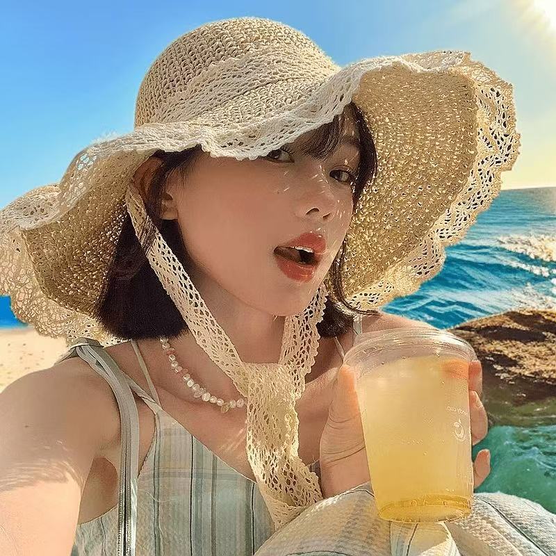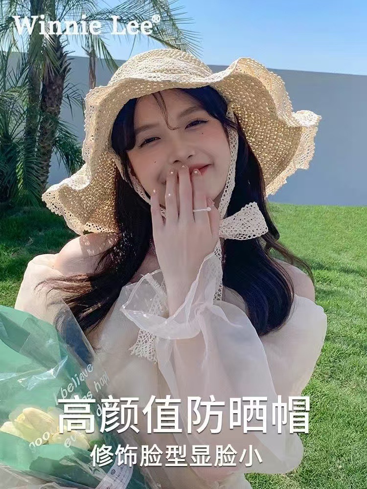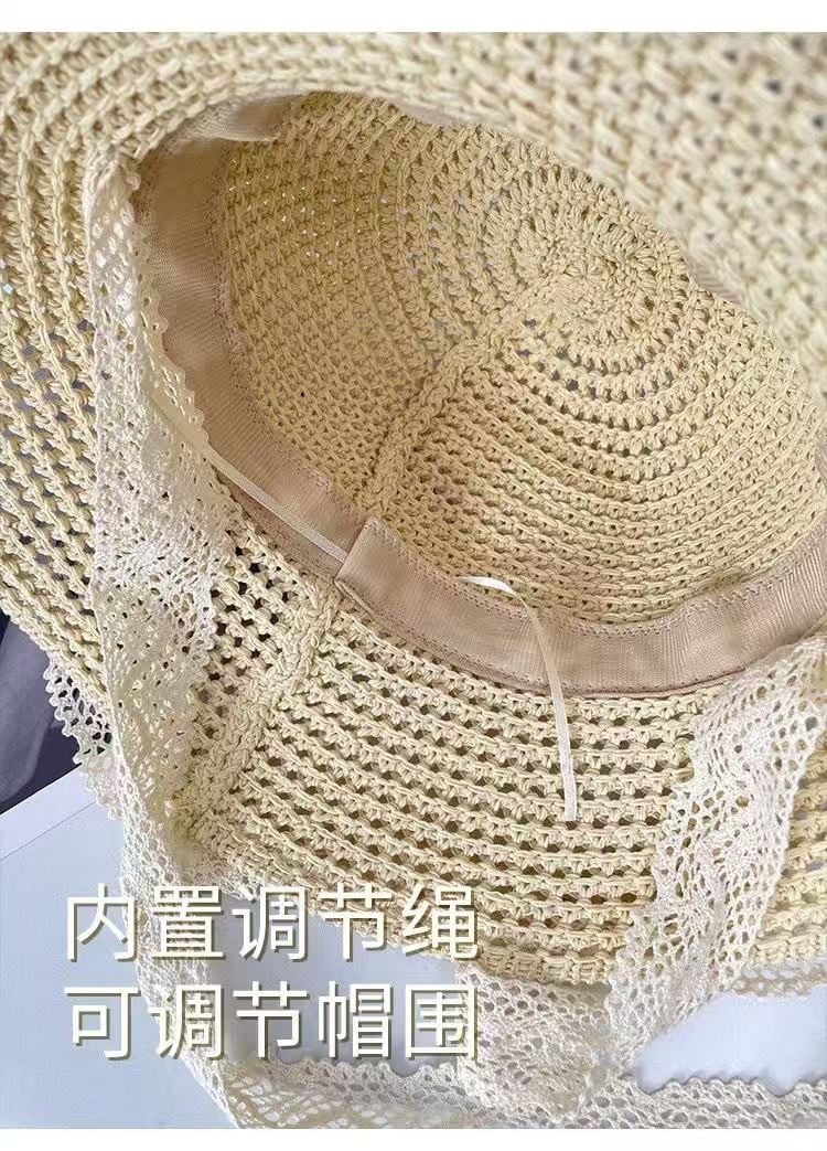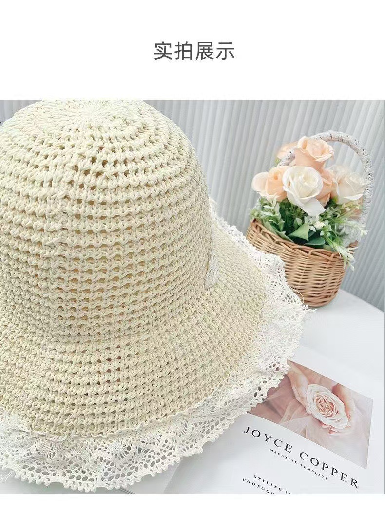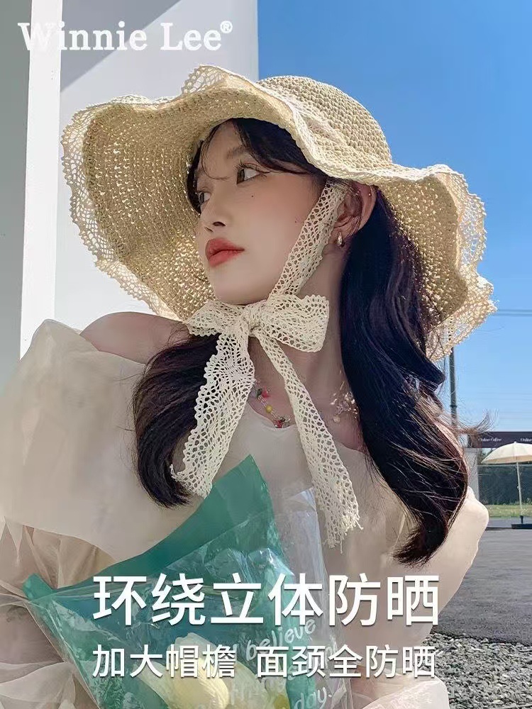 小众洋气遮阳帽子甜美渔夫帽透气蕾丝蝴蝶结大帽檐草帽女女款