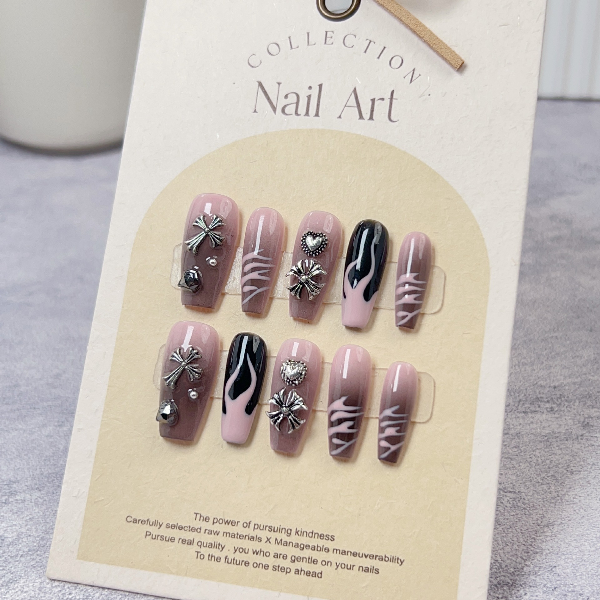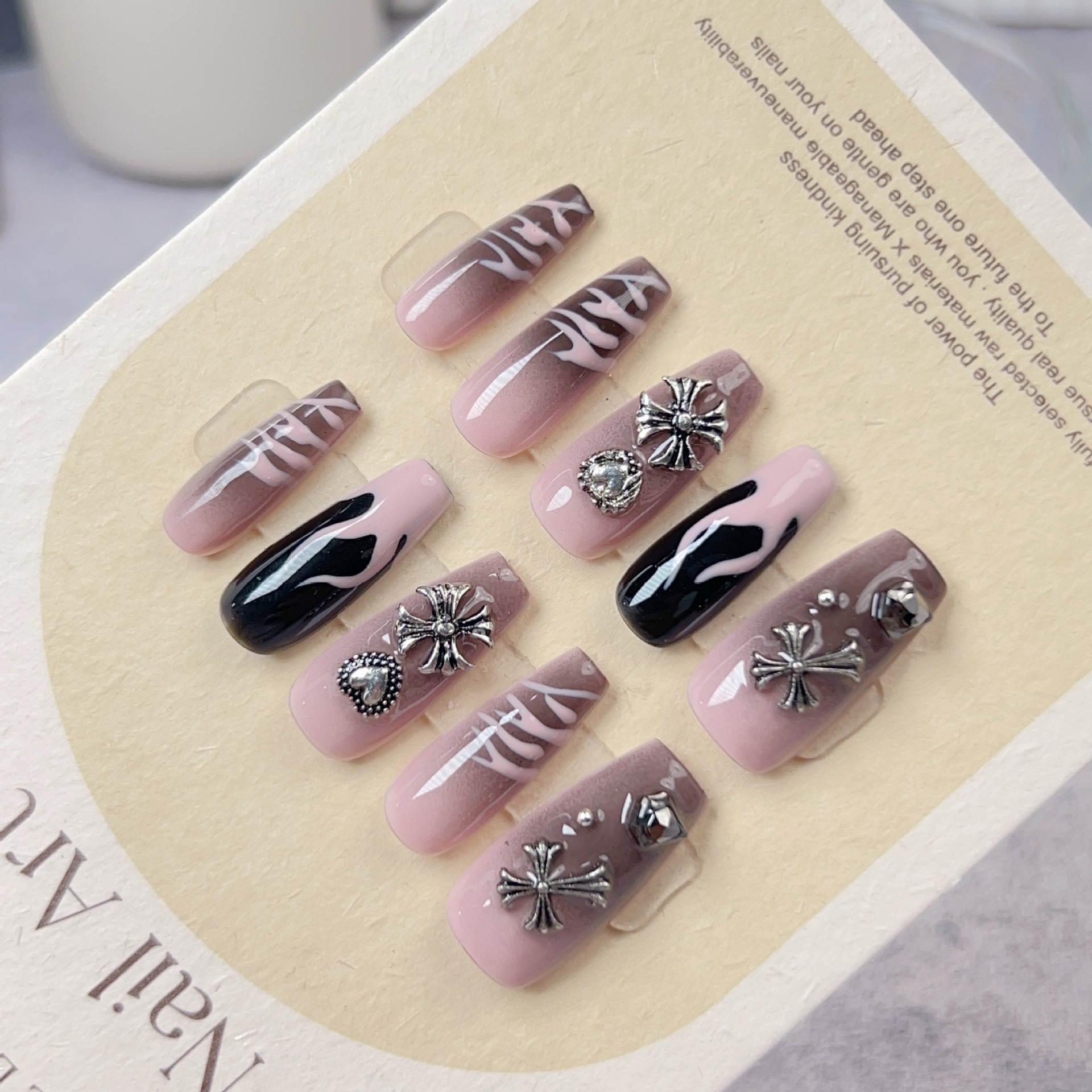 纯手工穿戴甲辣妹夜焰美甲暗黑粉超酷克罗心甲片可拆卸光疗甲贴片