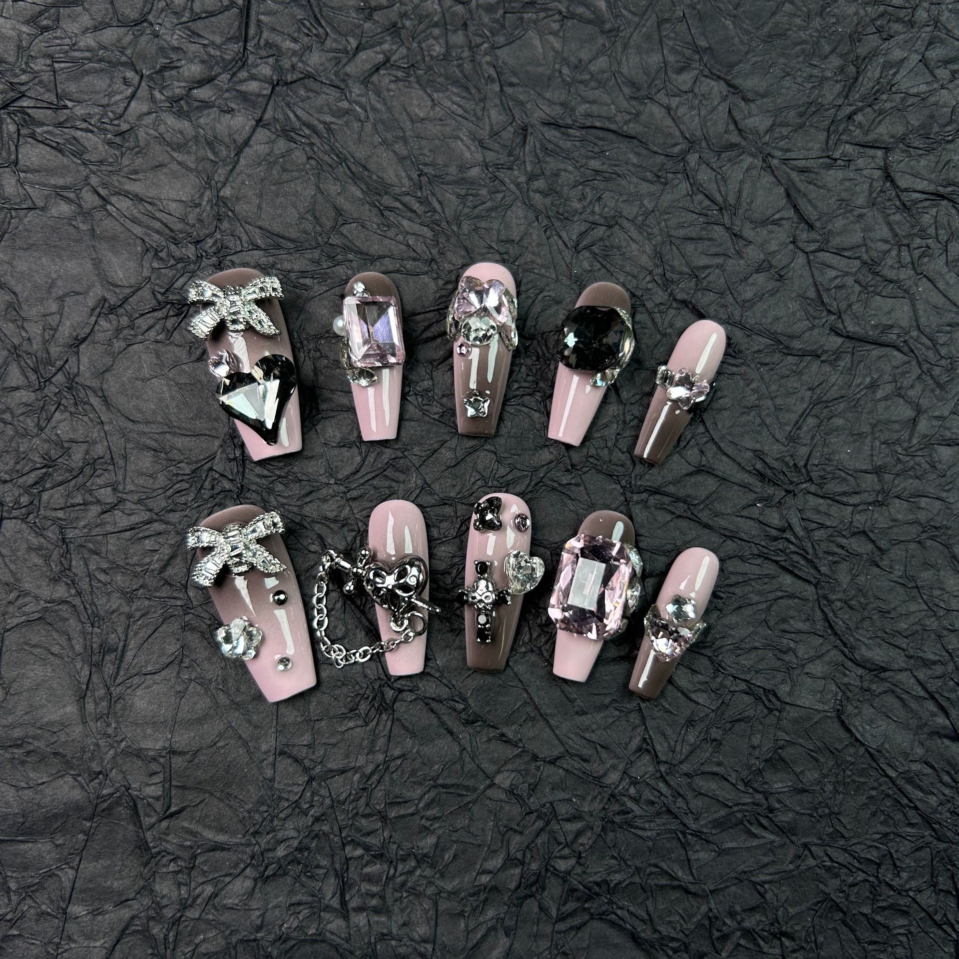 纯手工穿戴甲黑魔仙立体贴钻长款美甲贴精工镶嵌高级可拆卸甲片