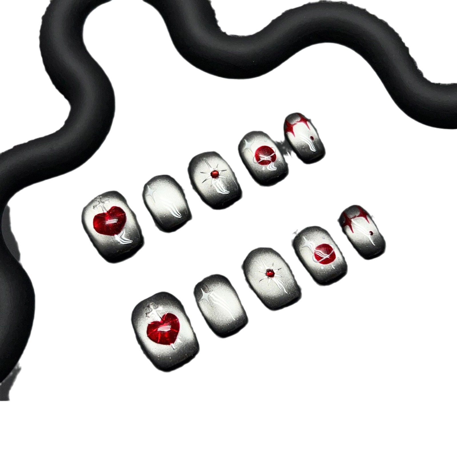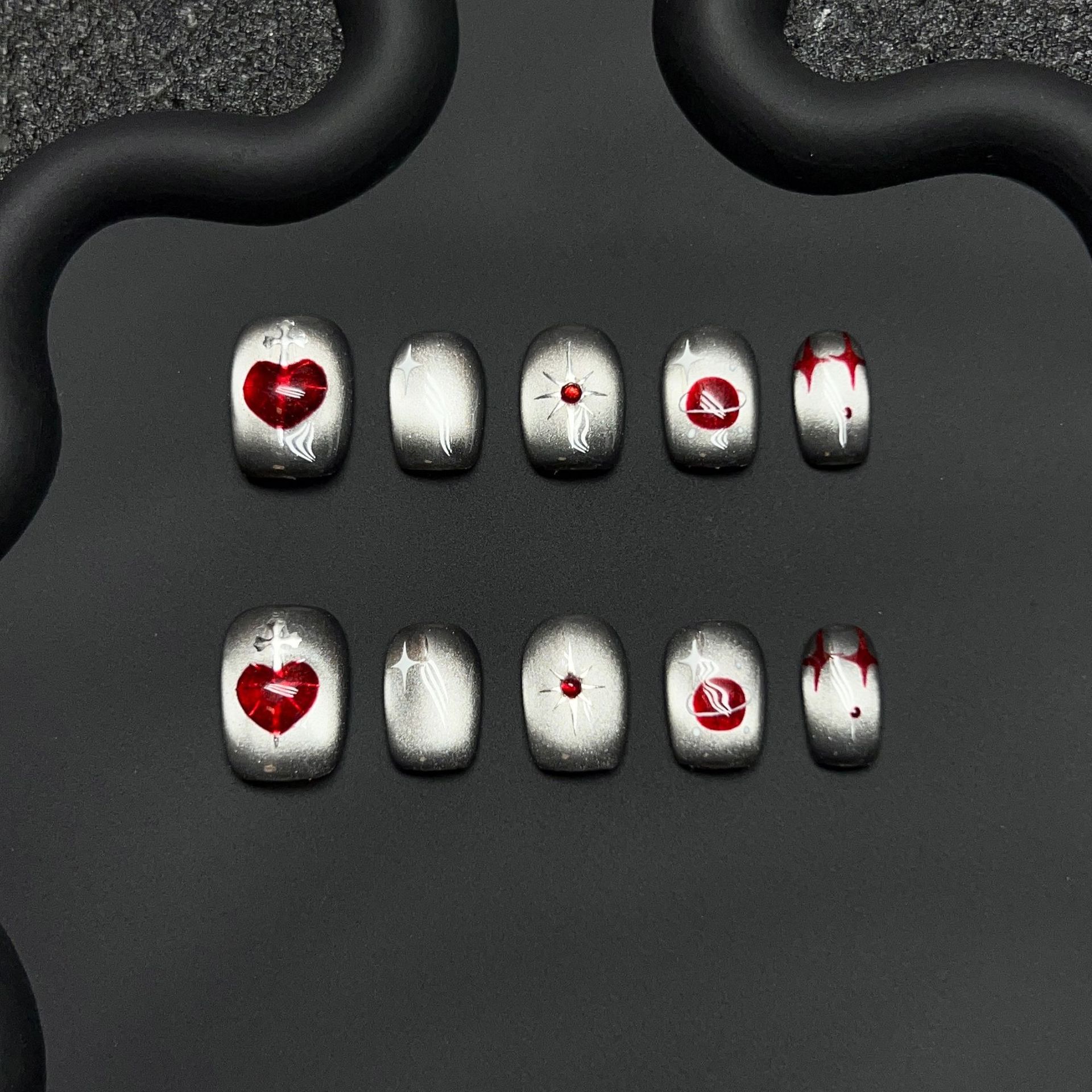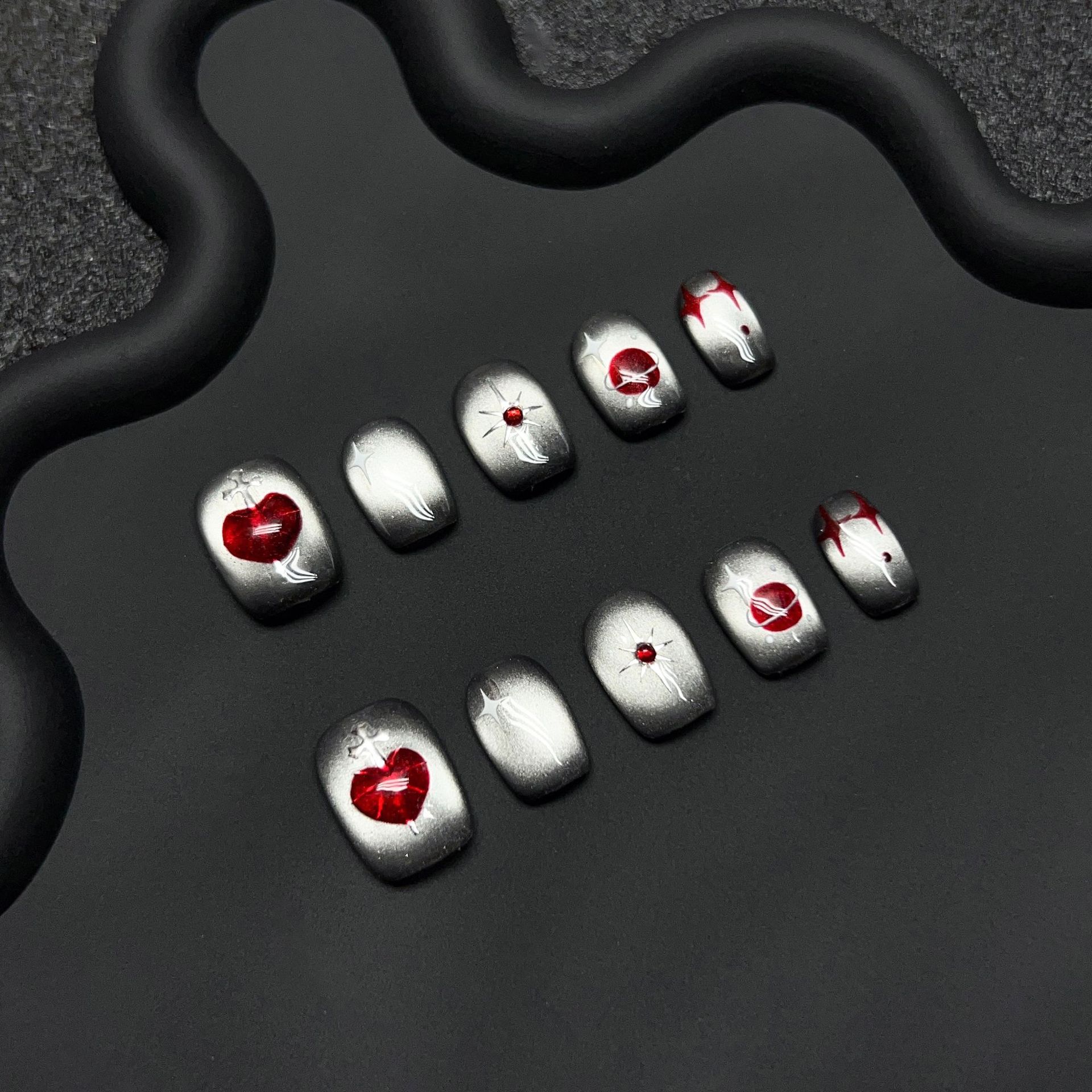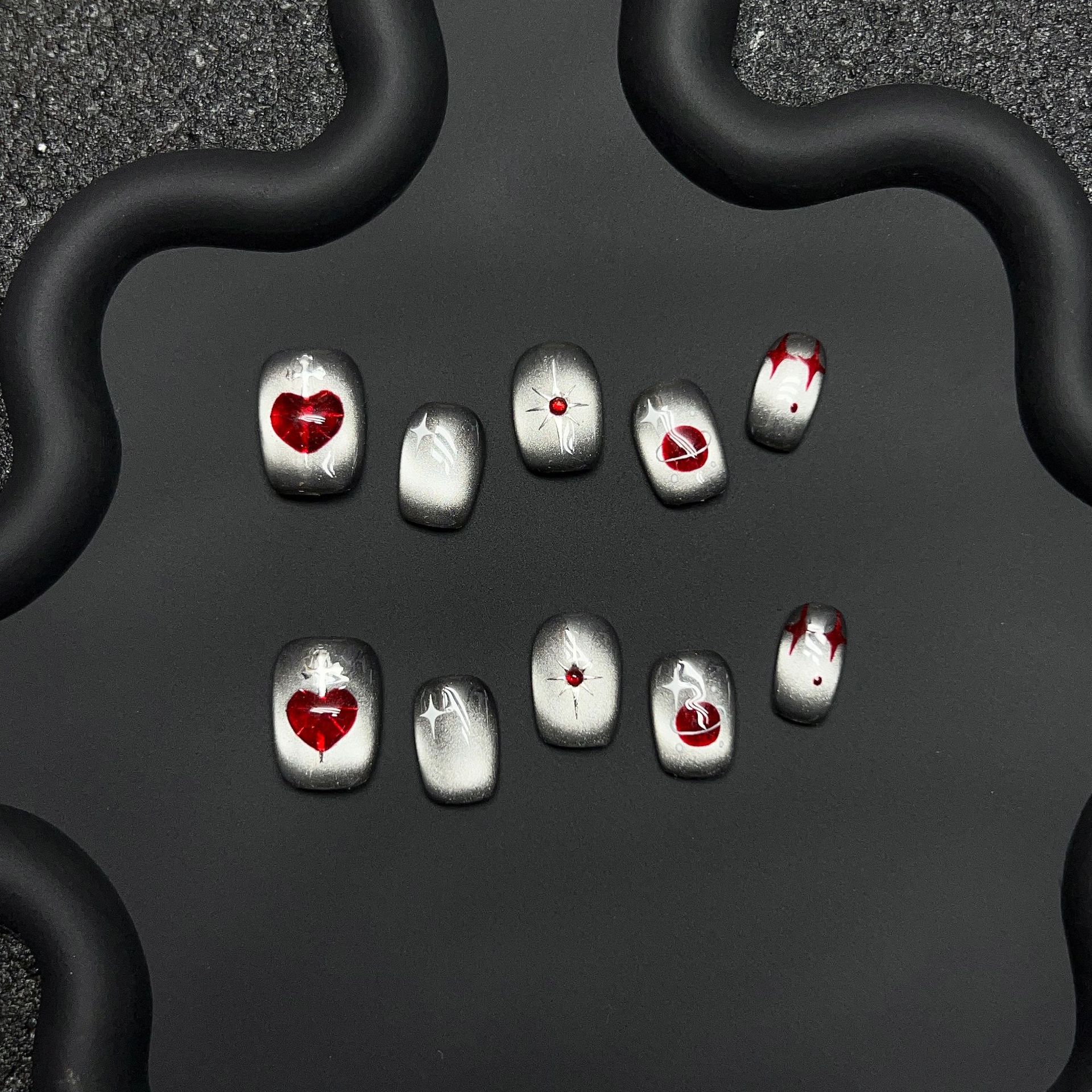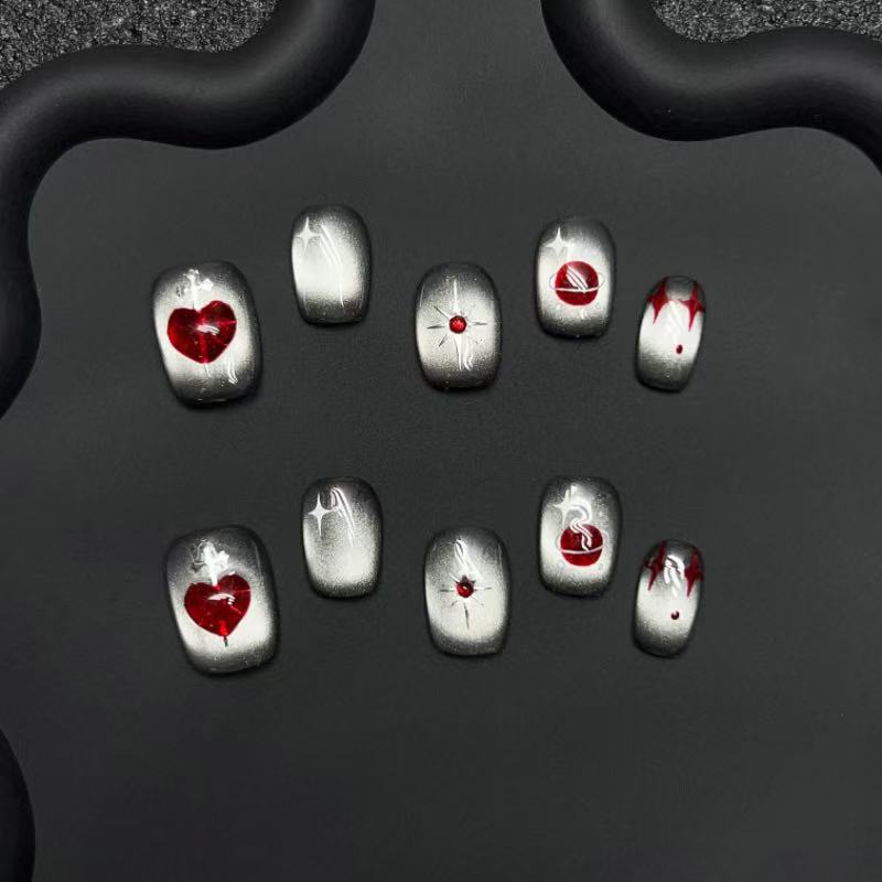 闪耀星河纯手工穿戴甲短款黑色满光猫眼红色爱心甜酷可拆卸甲片