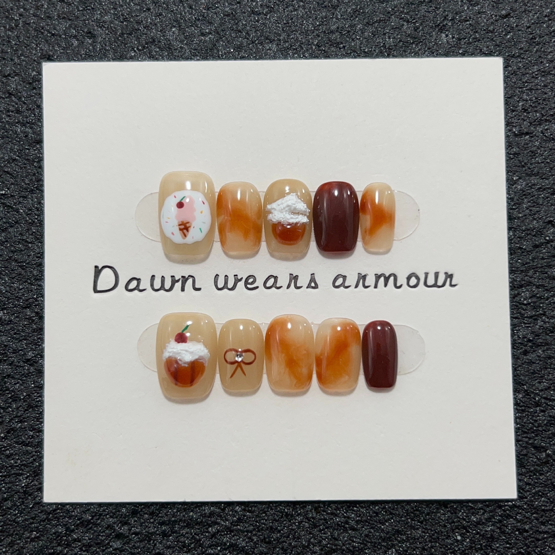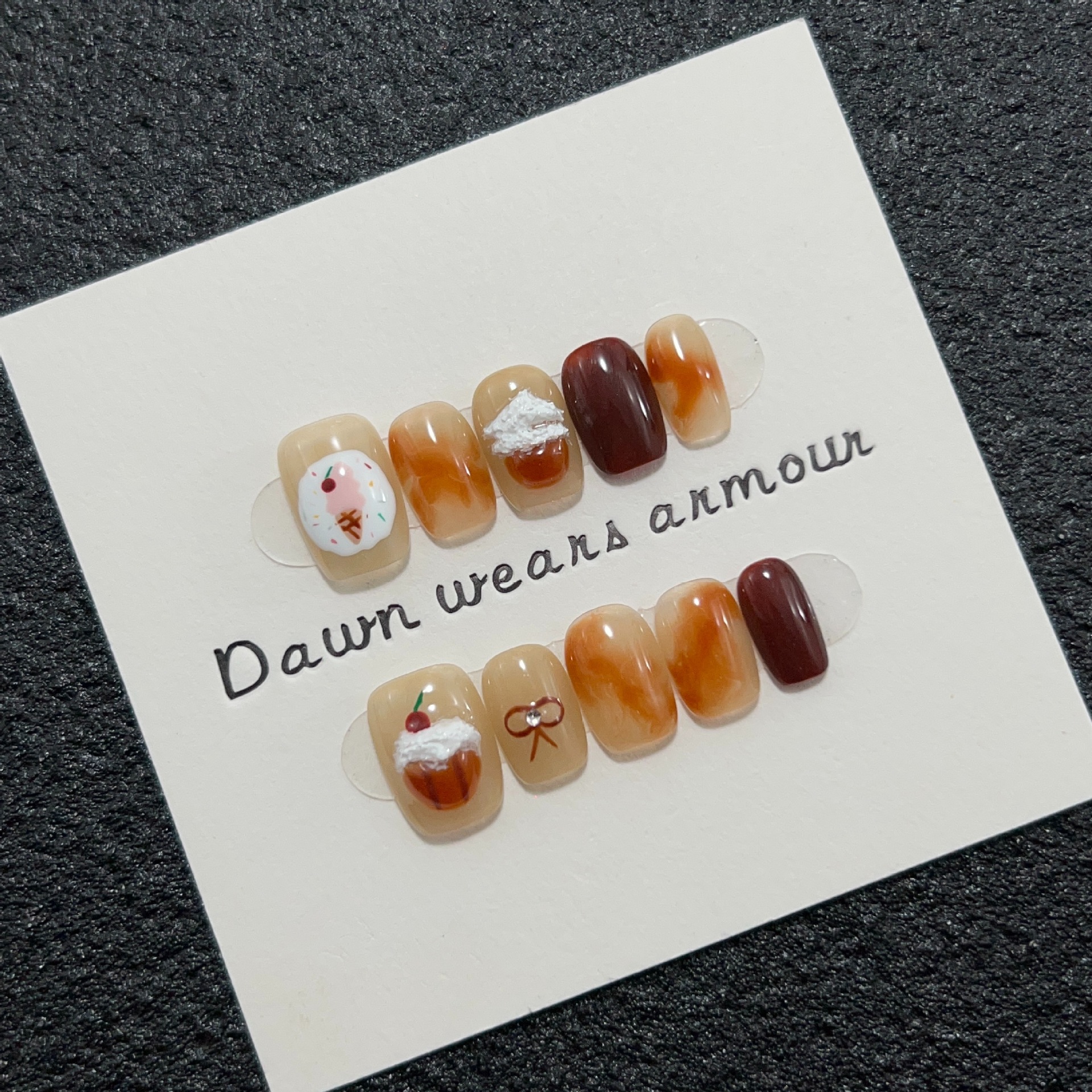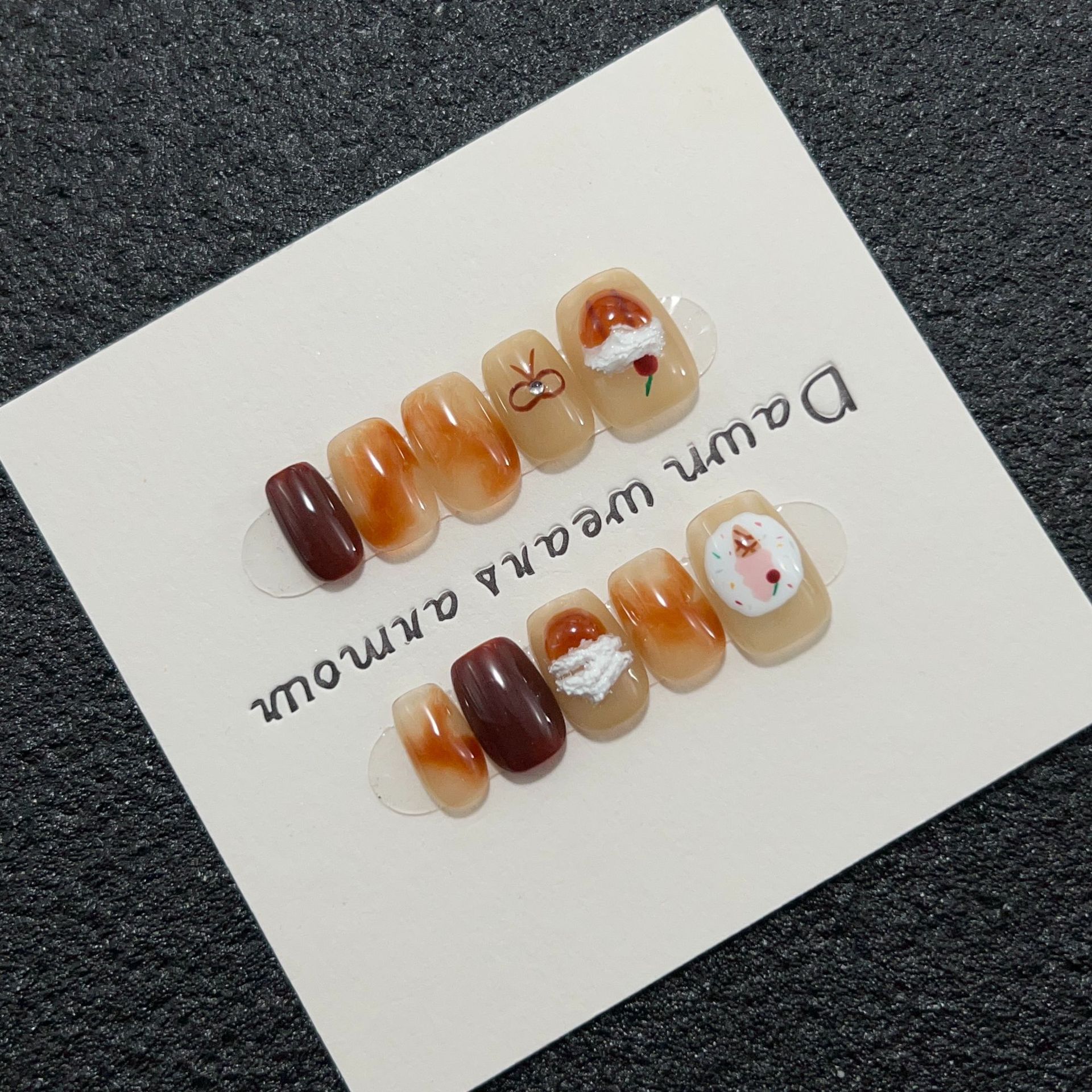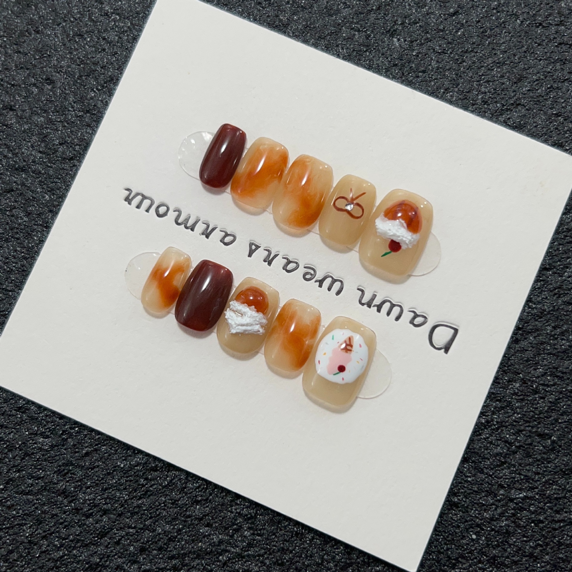 芝士桃桃纯手工穿戴甲短款棕色晕染美甲贴樱桃冰淇淋可爱跳色甲片
