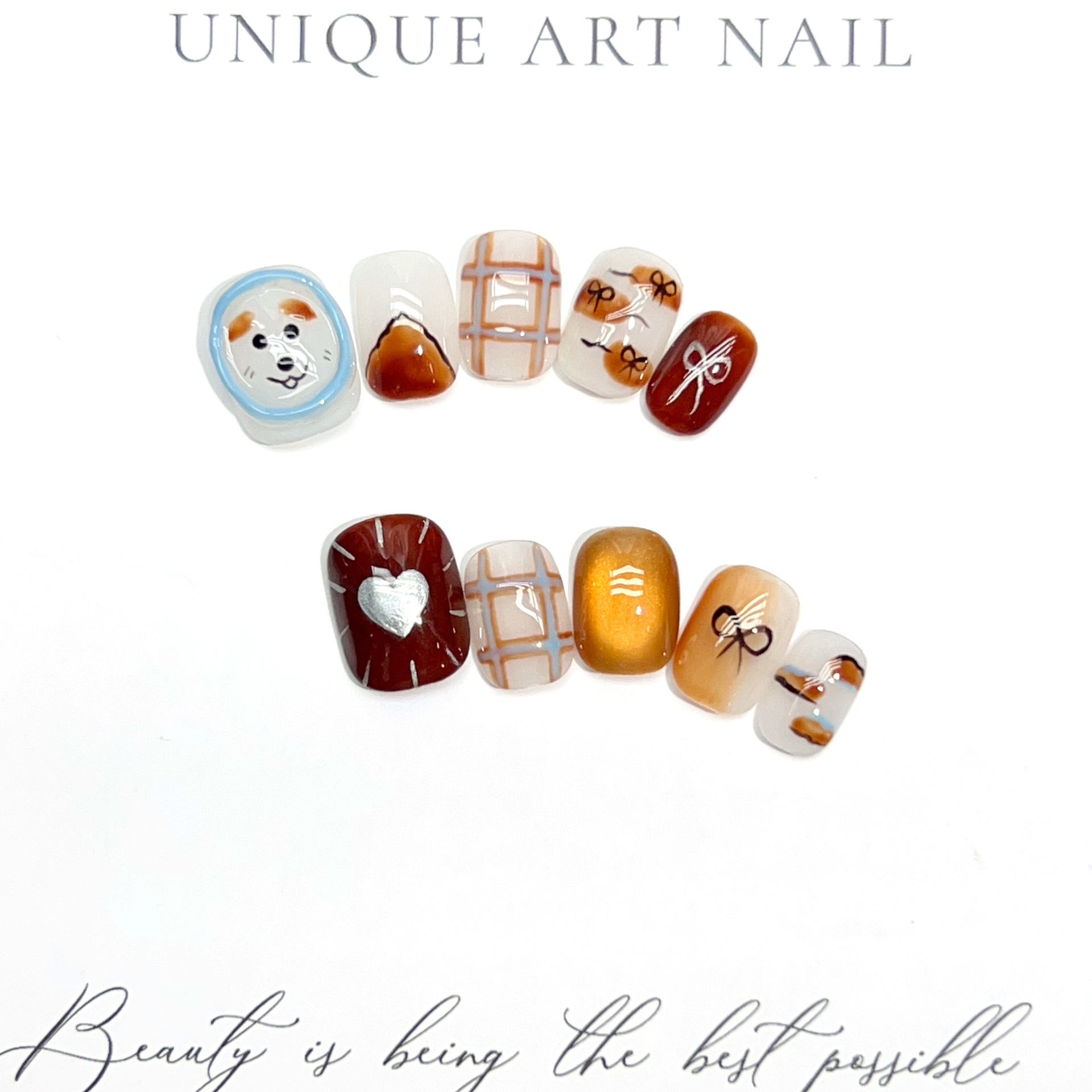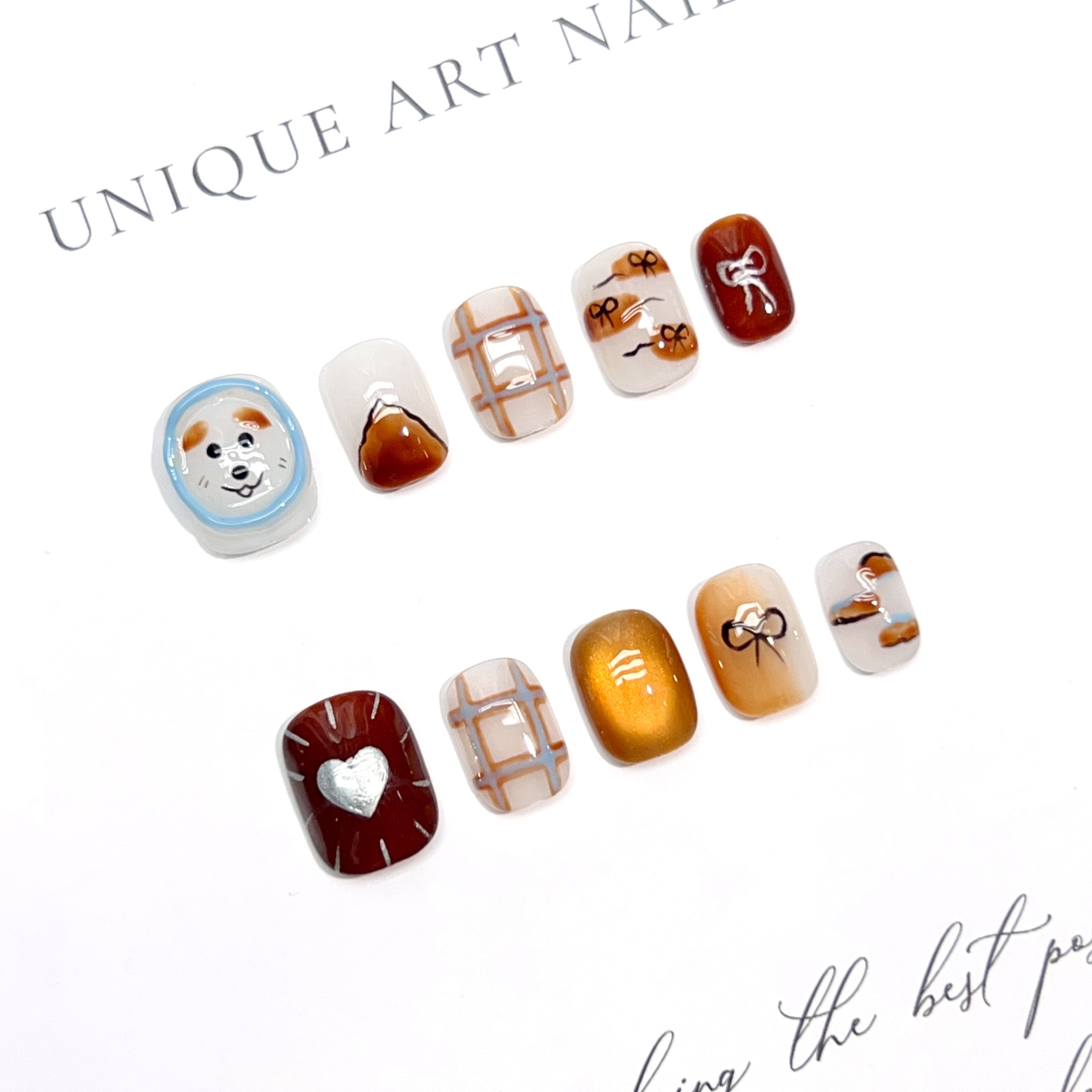 萌宠乐园纯手工穿戴甲新款卡通手绘可爱蝴蝶结猫眼美甲贴片可拆卸