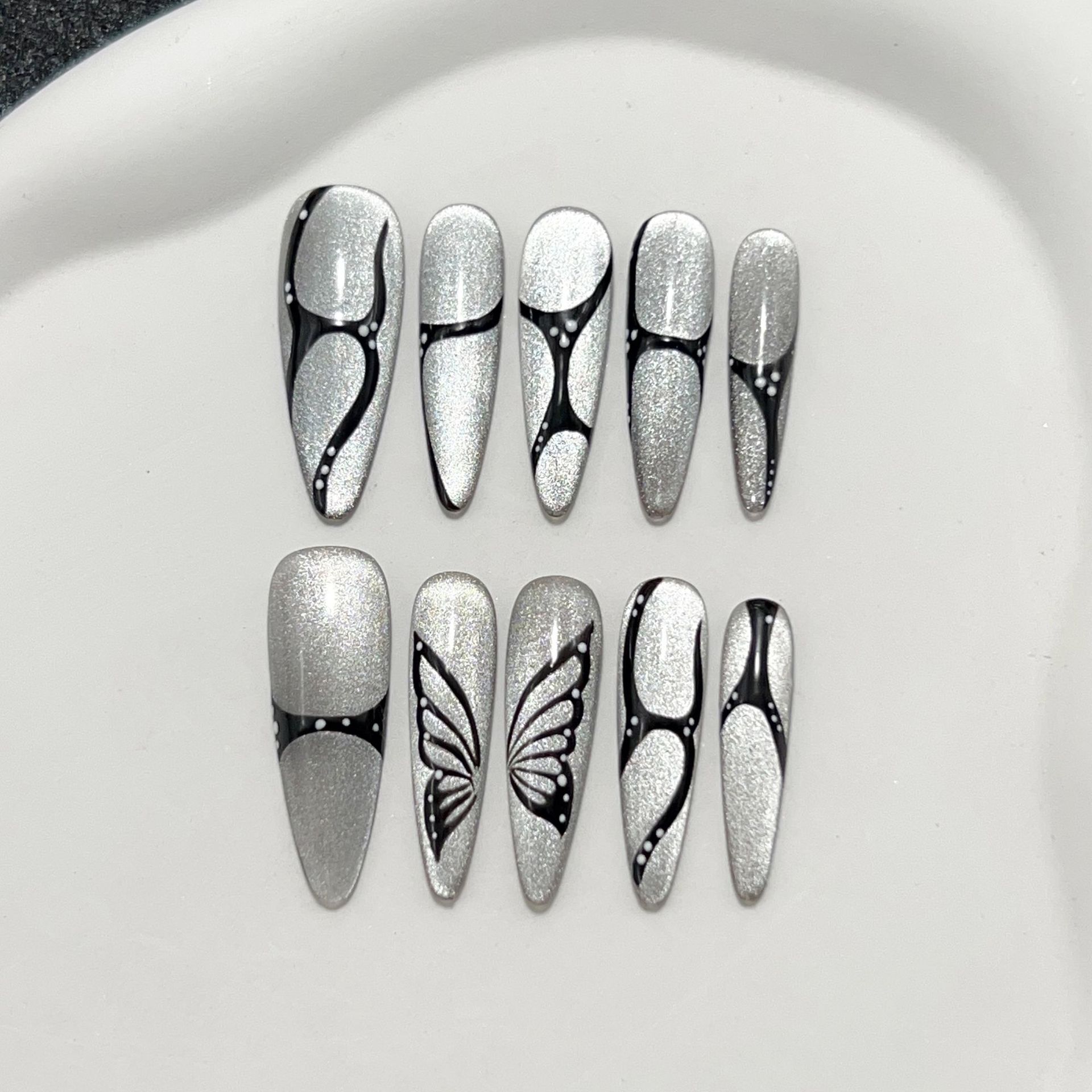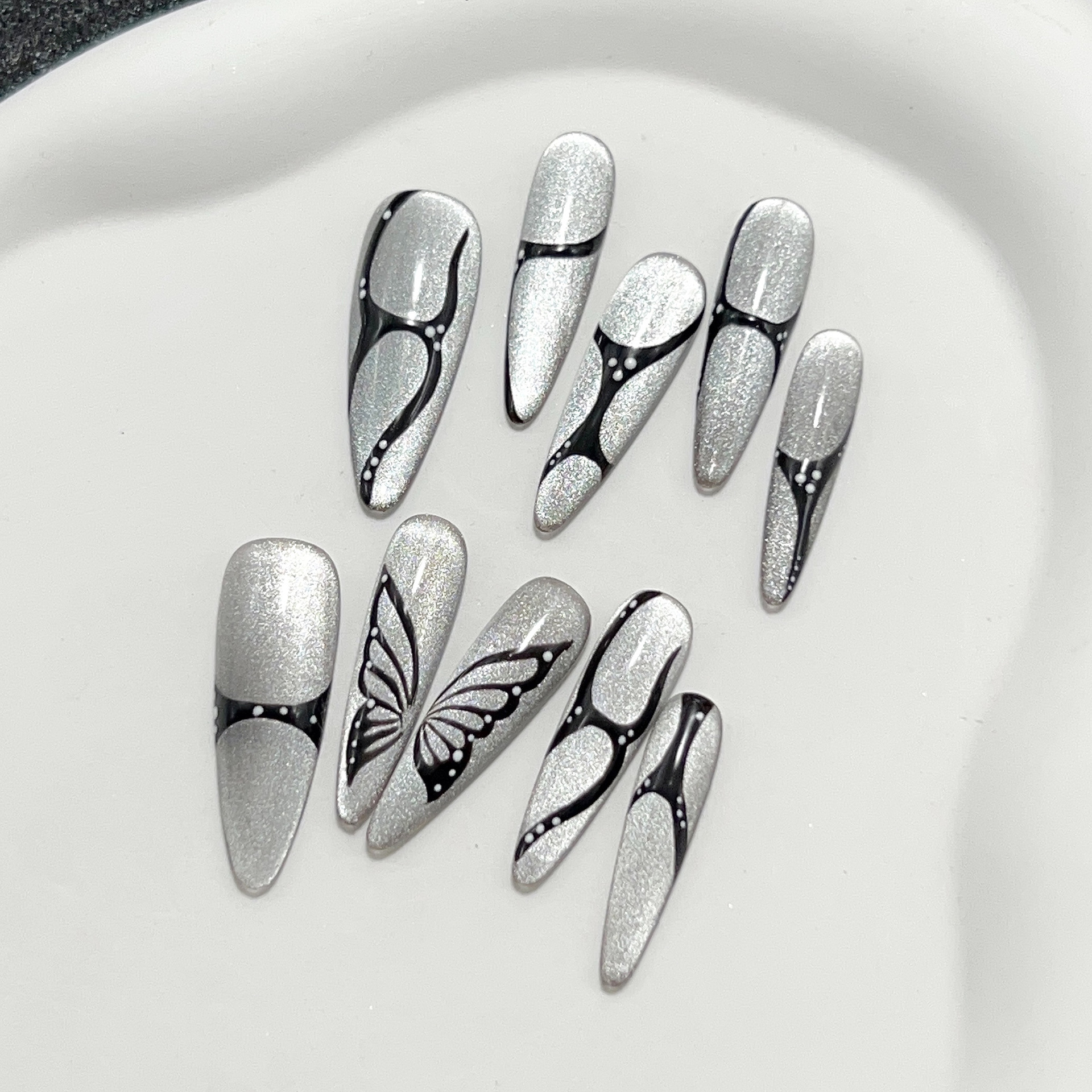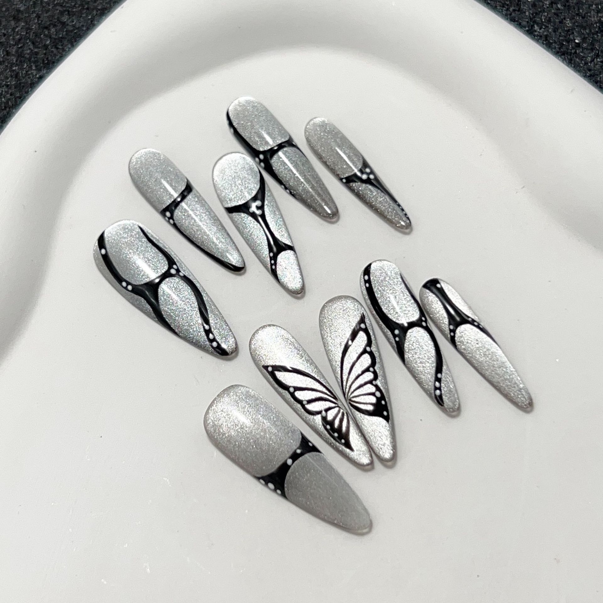 炫彩蝴蝶纯手工穿戴甲长款爆闪手绘美甲贴纯欲轻奢蝴蝶可拆卸甲片