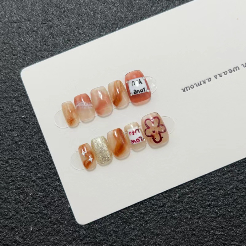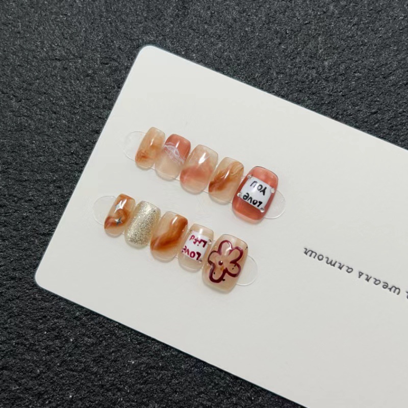 海边漫步纯手工穿戴甲短款美拉德跳色美甲贴棕色晕染手绘花可拆卸