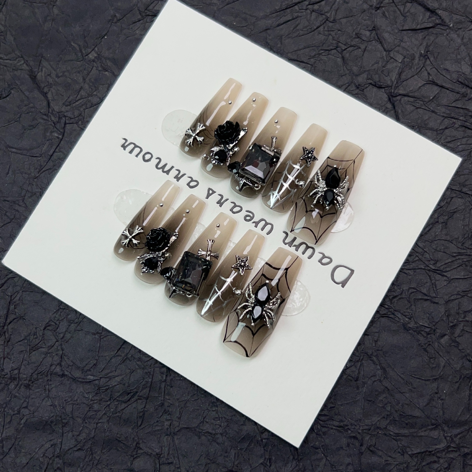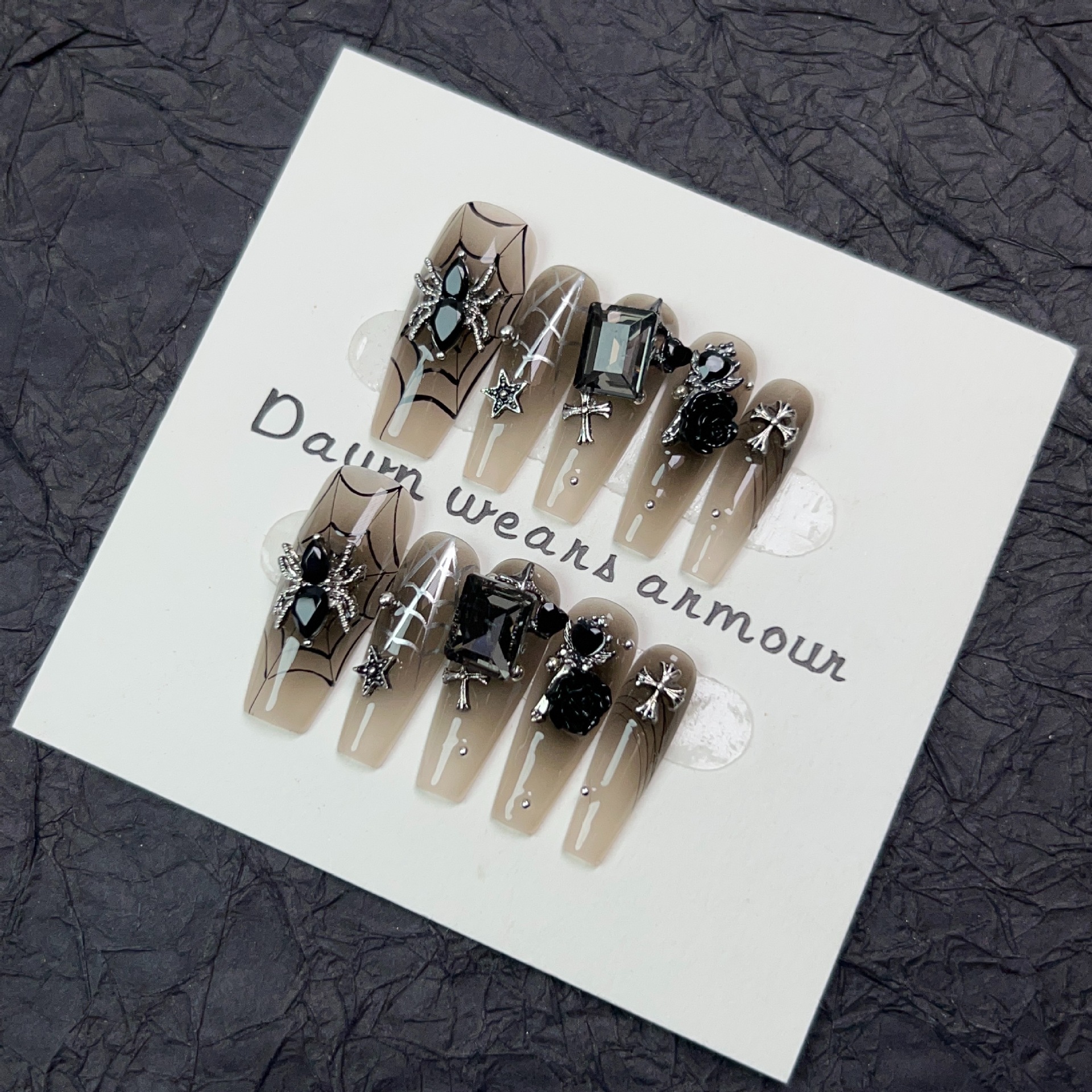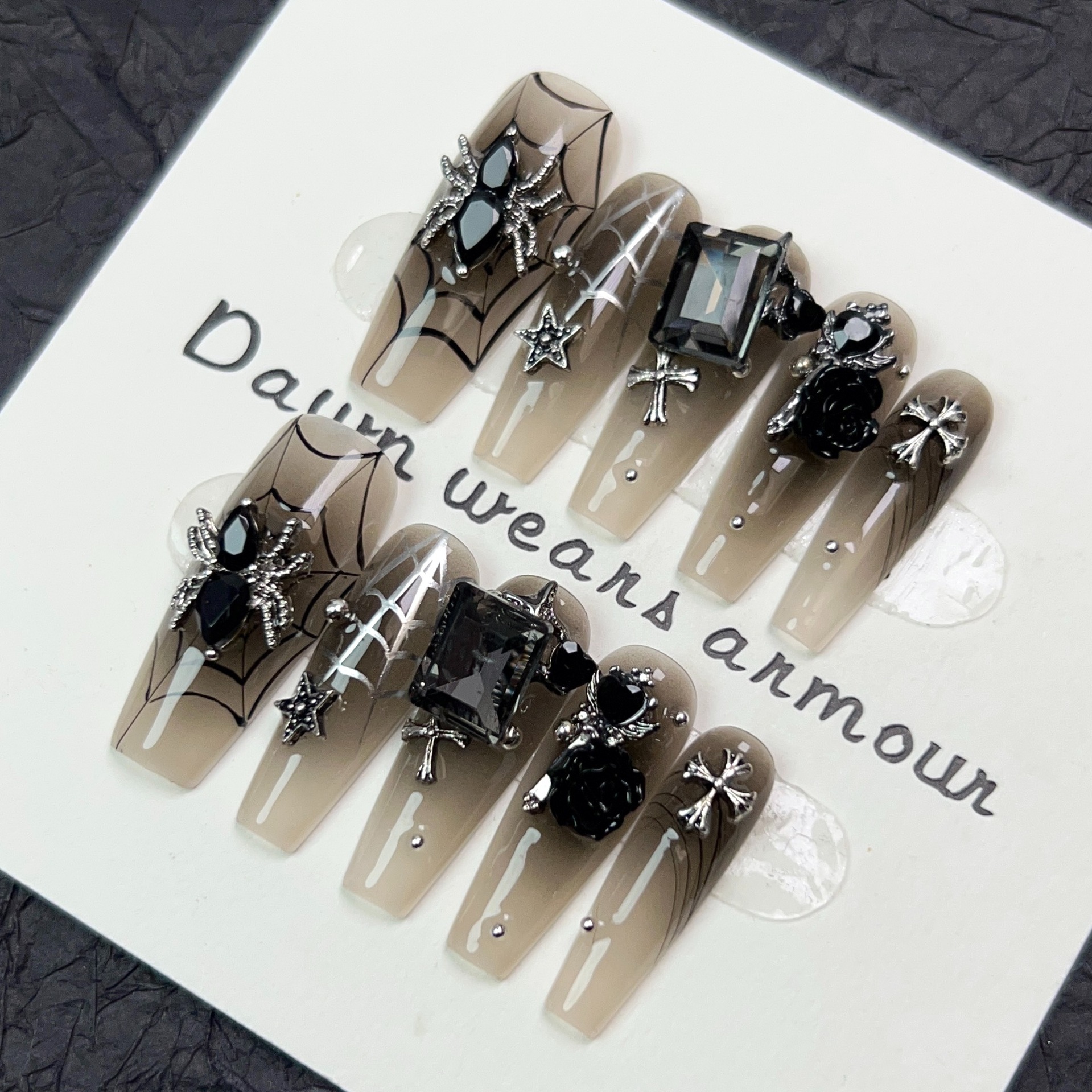 暗夜织梦纯手工穿戴甲长款冰透裸色美甲贴暗黑甜酷蜘蛛贴钻甲片