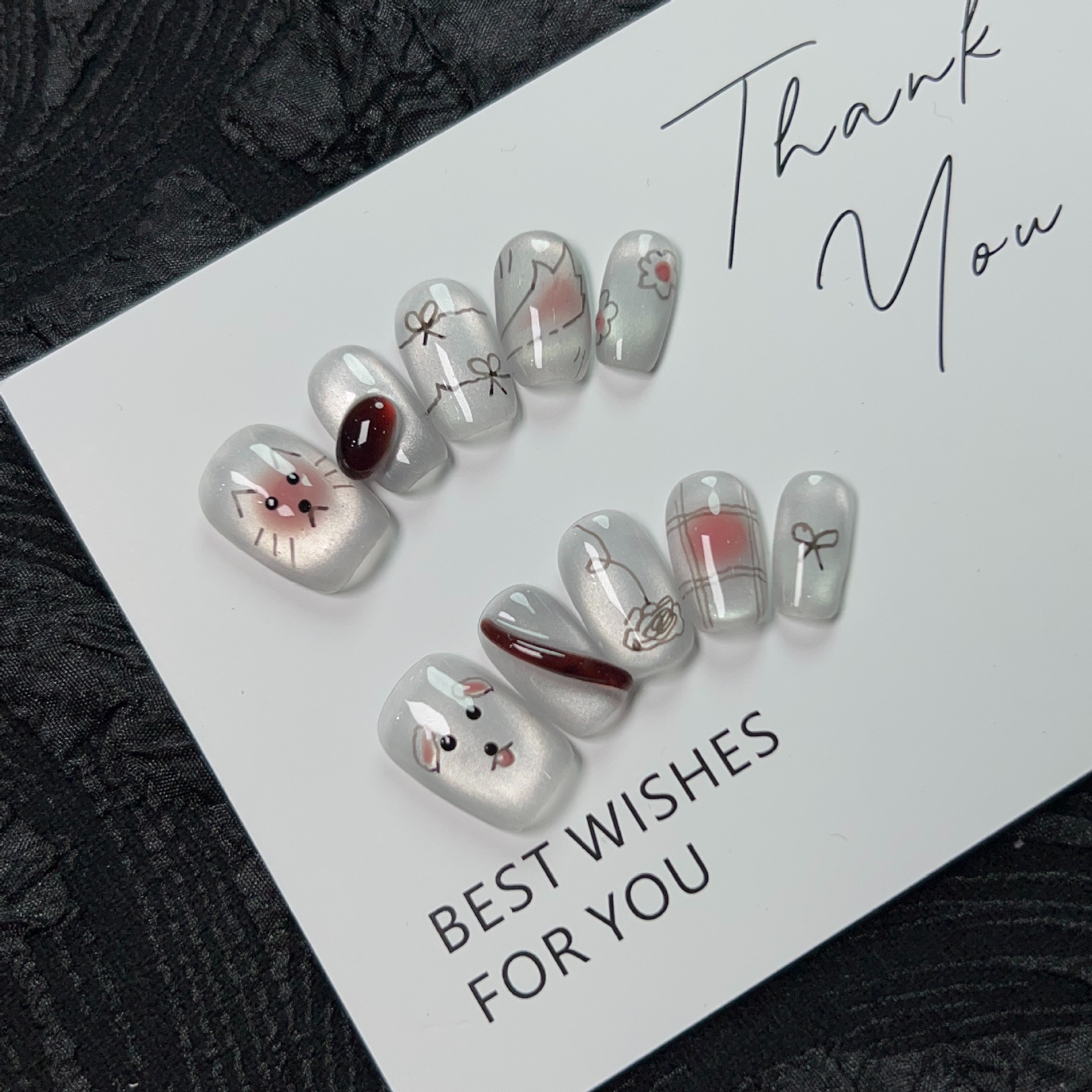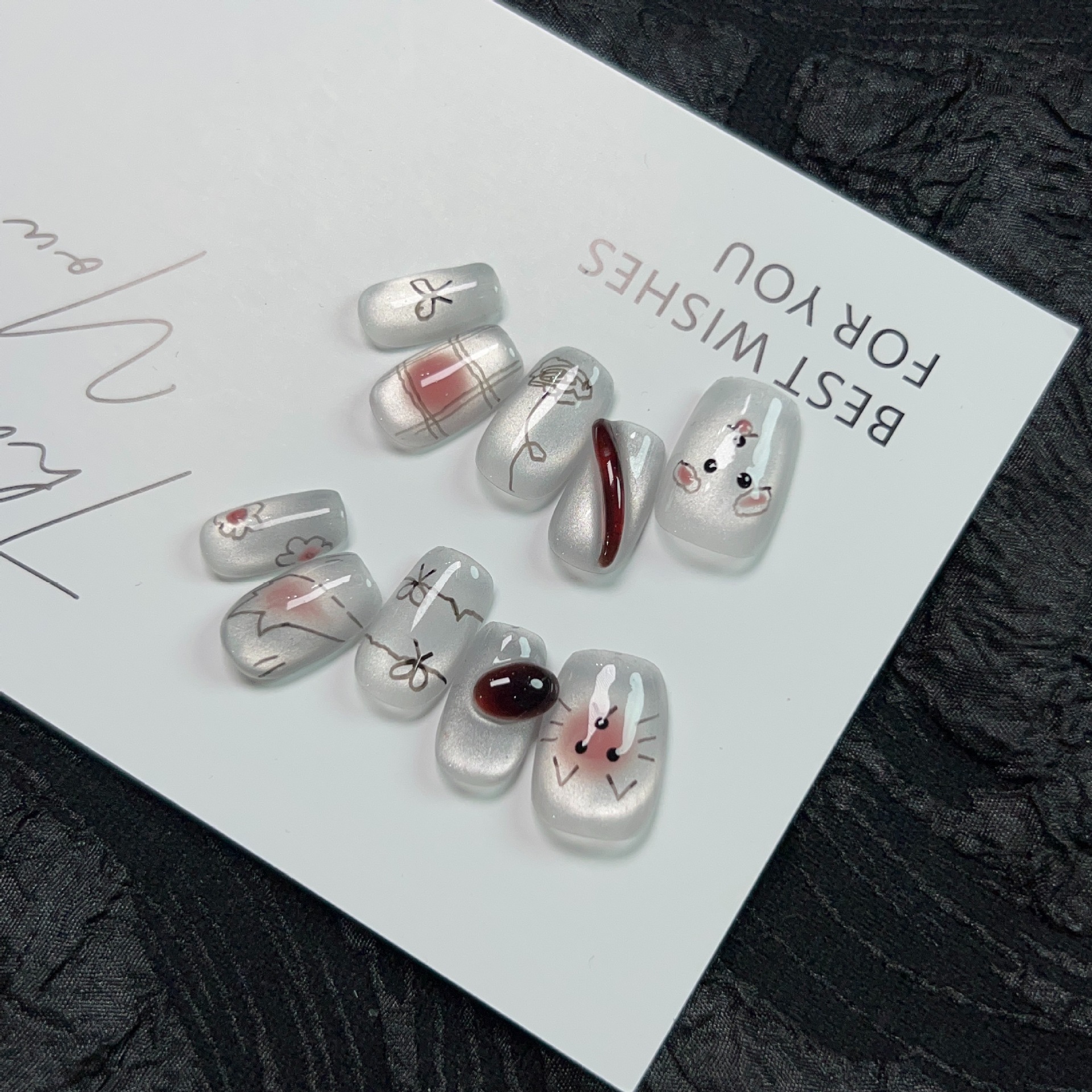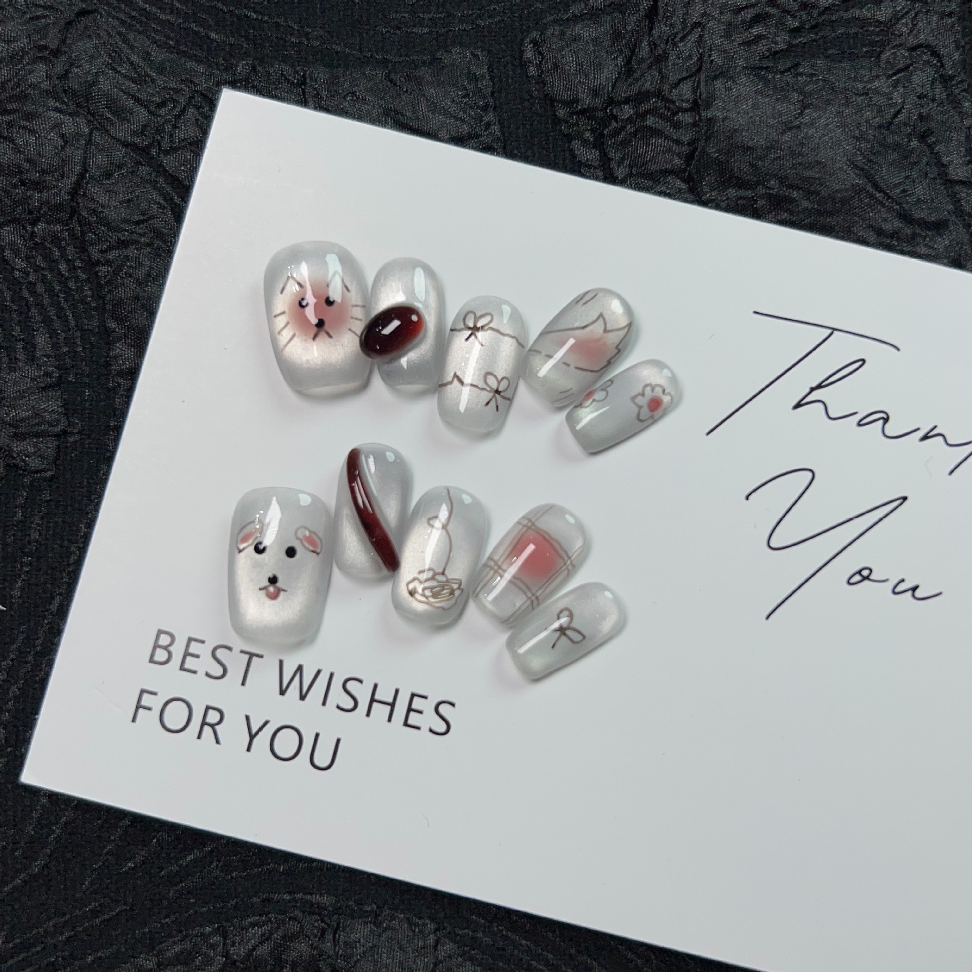 纯手工穿戴甲甜宠乐园冰透晶石猫眼手绘卡通涂鸦猫狗美甲贴成品