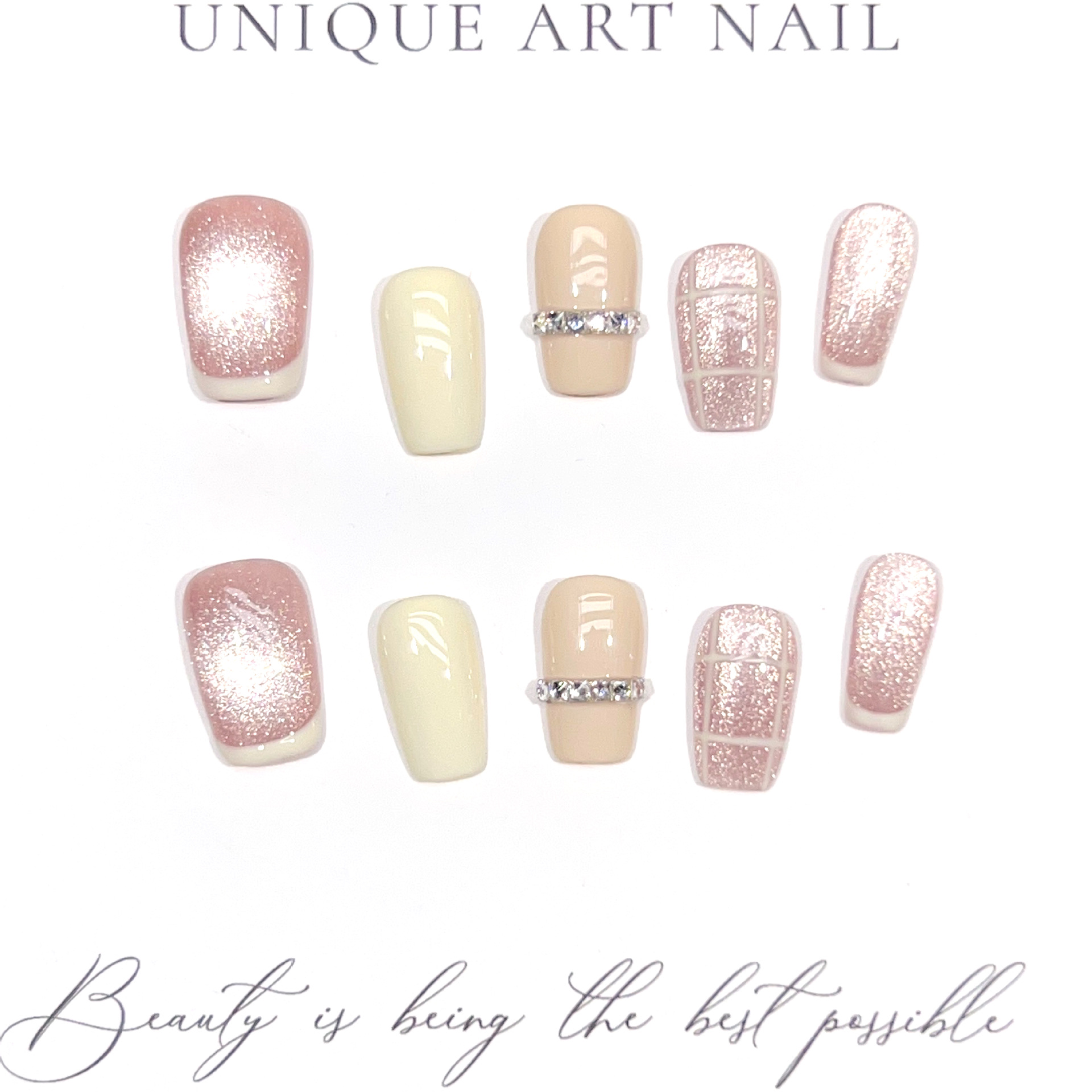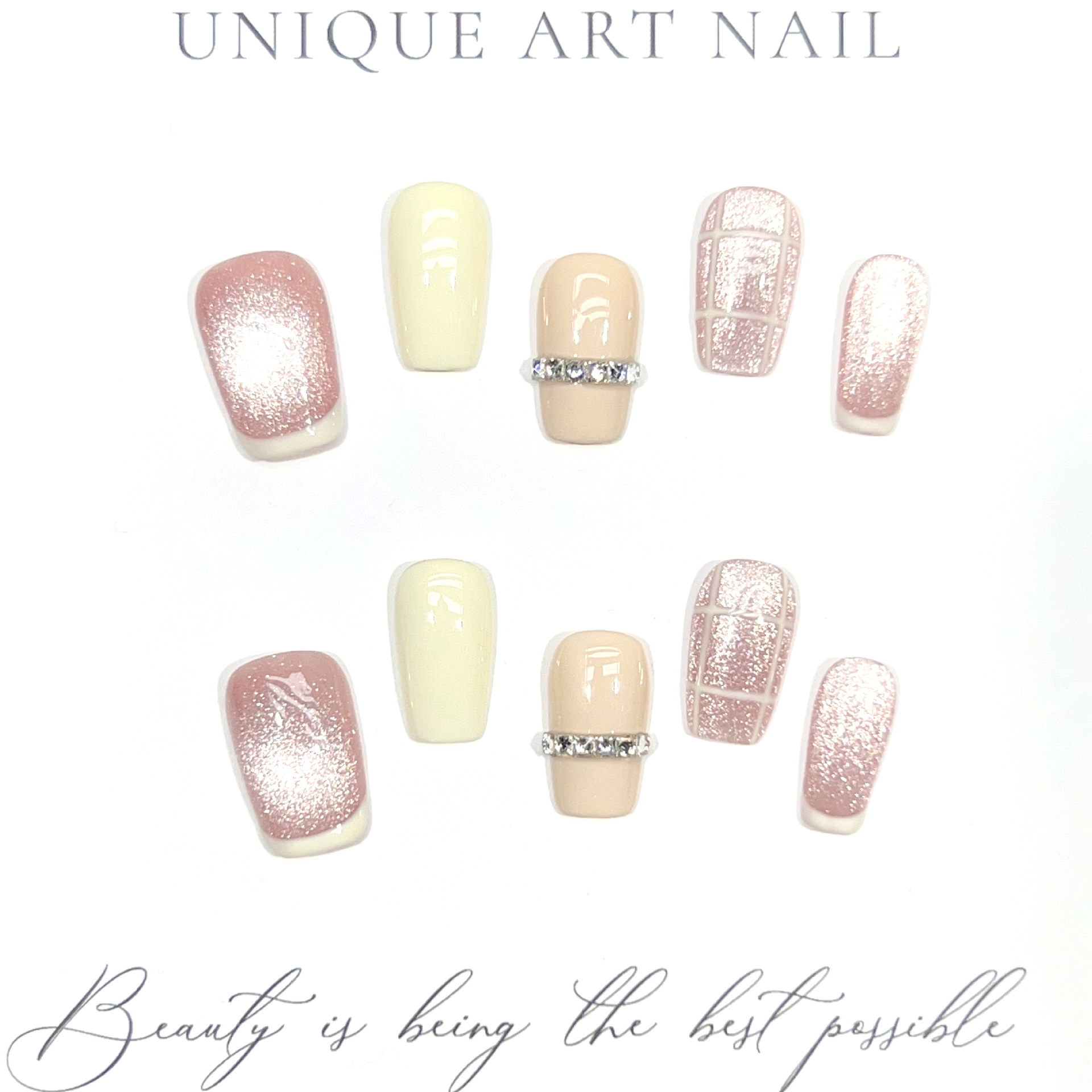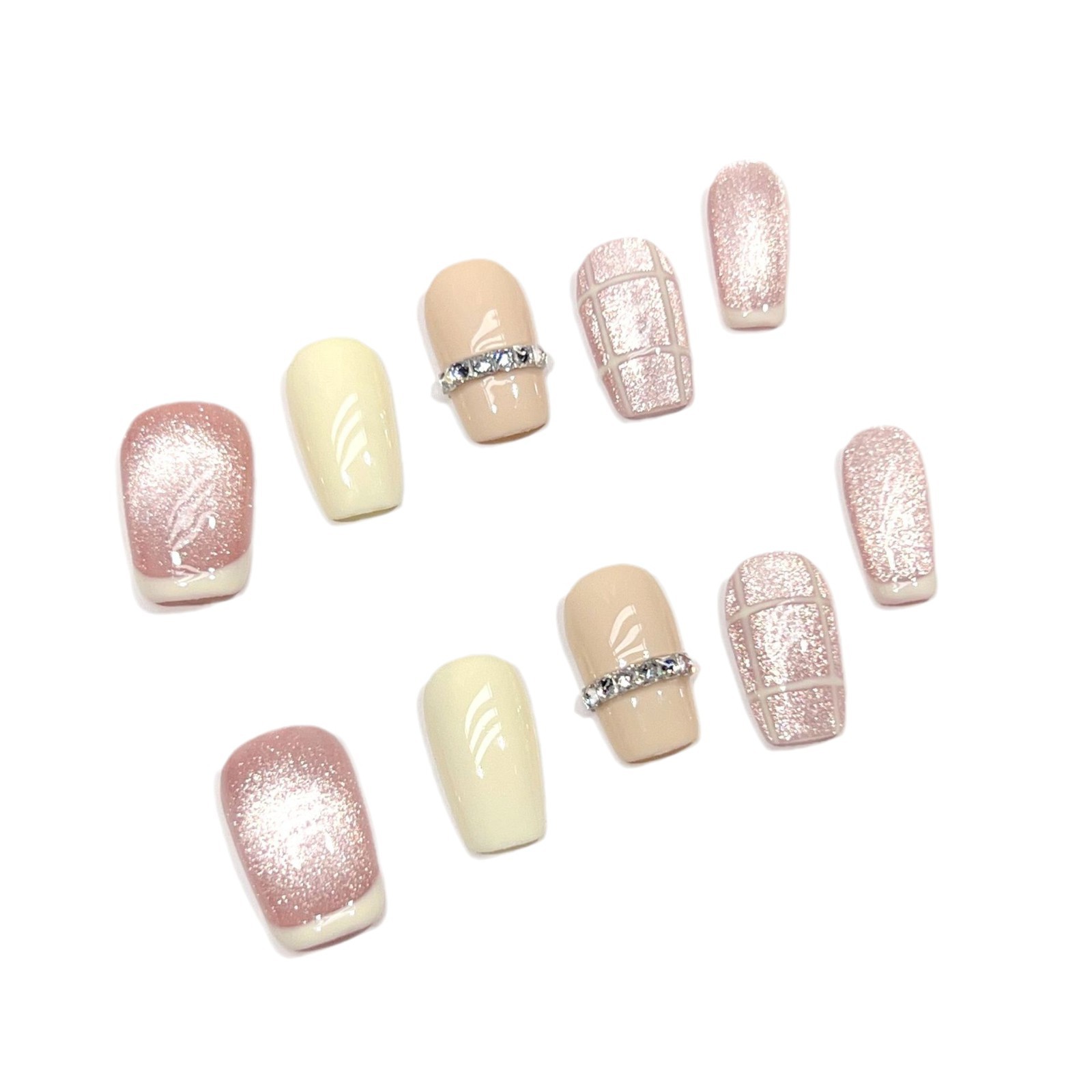 紫藤花开纯手工穿戴甲中款粉紫色爆闪猫眼纯欲显白贴钻可拆卸成品