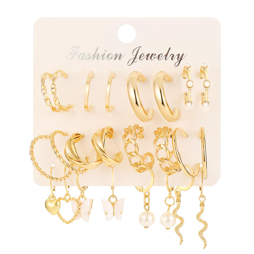 跨境新款豹纹多层几何圆圈蝴蝶爱心耳钉复古缠绕珍珠耳环套装6件
