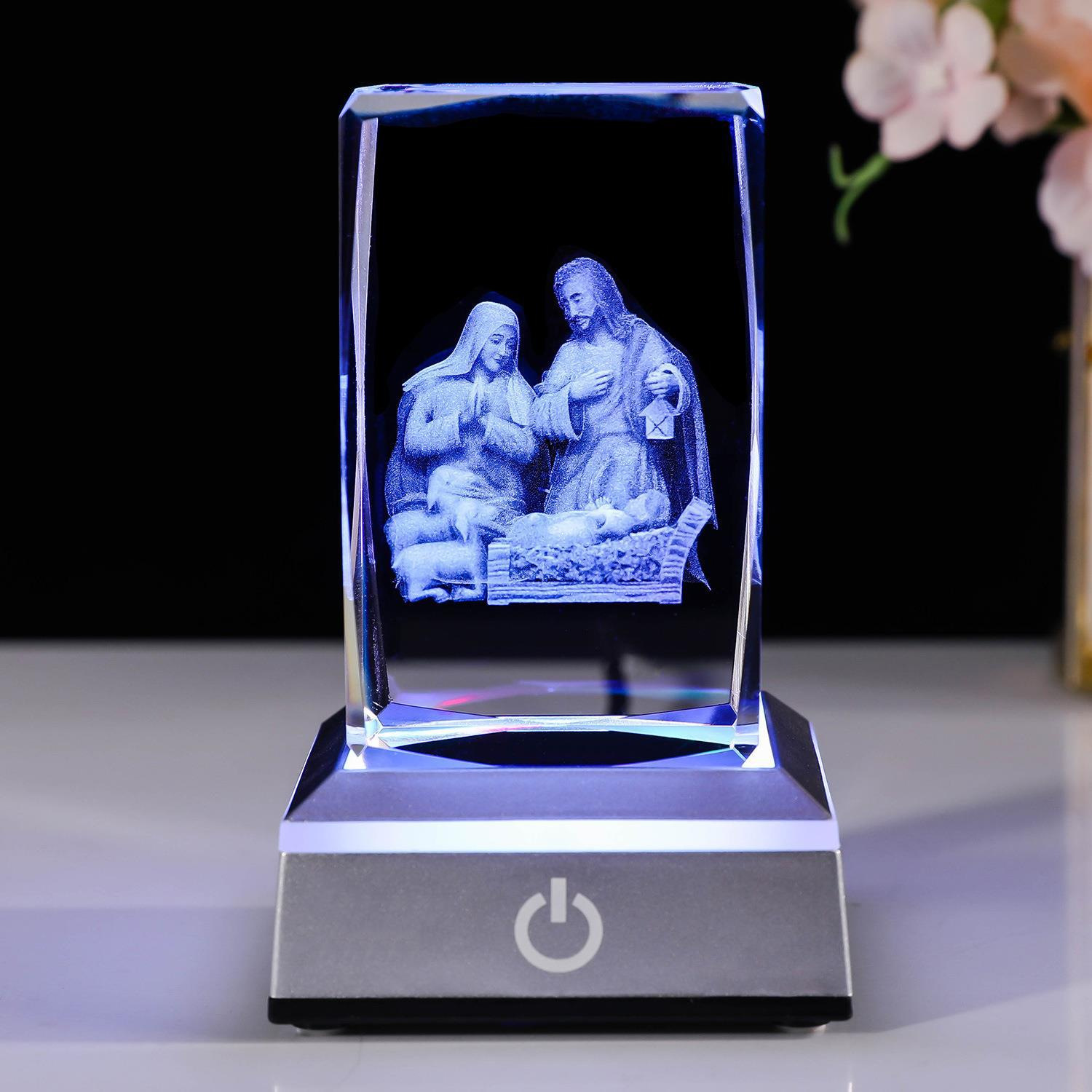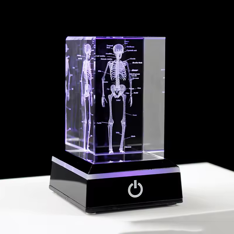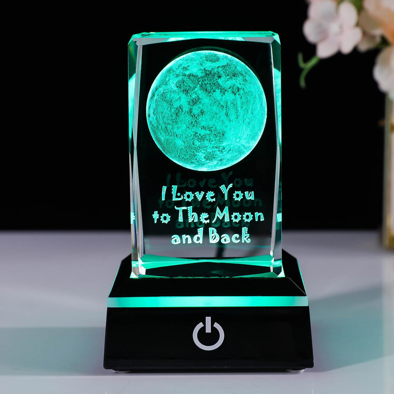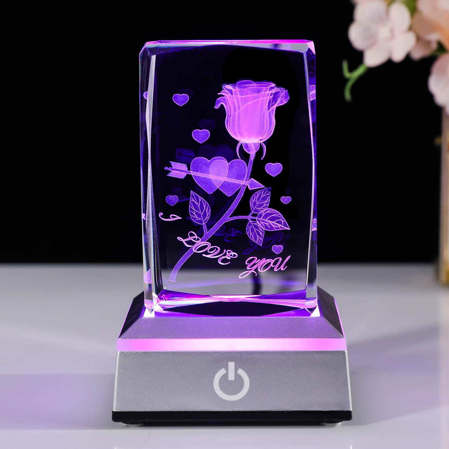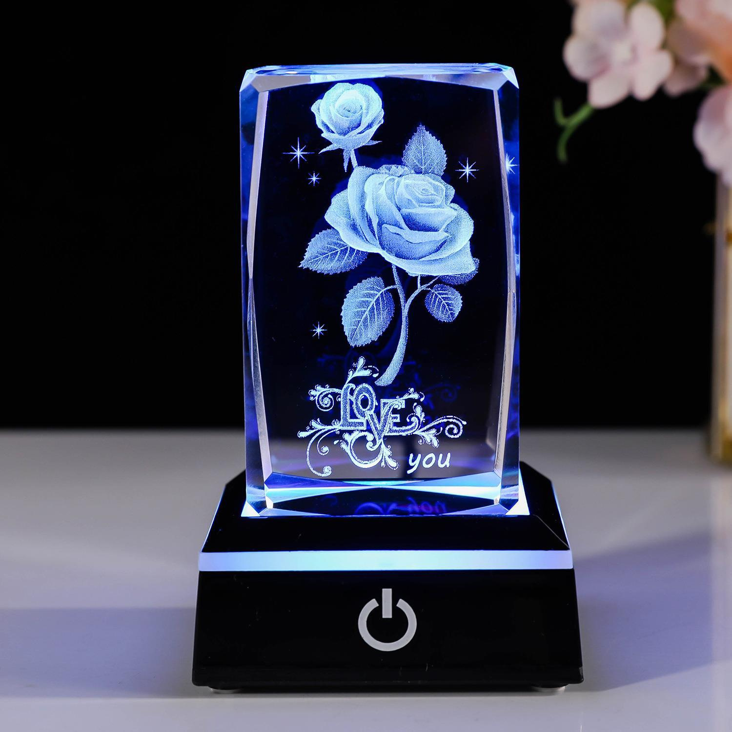 跨境批发3d激光内雕玫瑰花水晶方体摆件触摸感应灯座定制水晶魔方