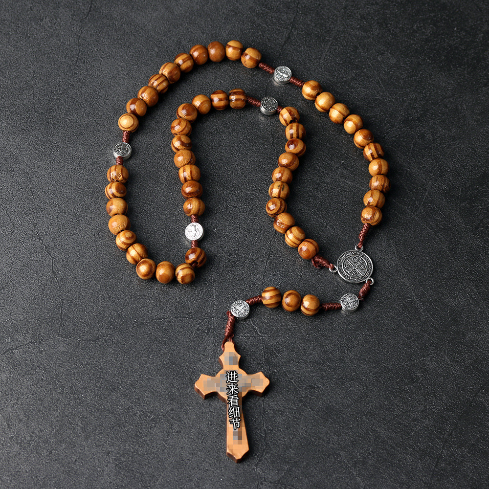 【现货】天然木珠十字架念珠项链Rosary手工编制外贸跨境饰品批发