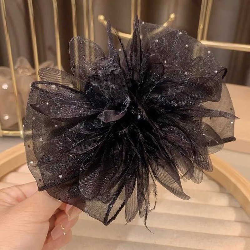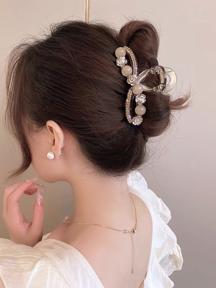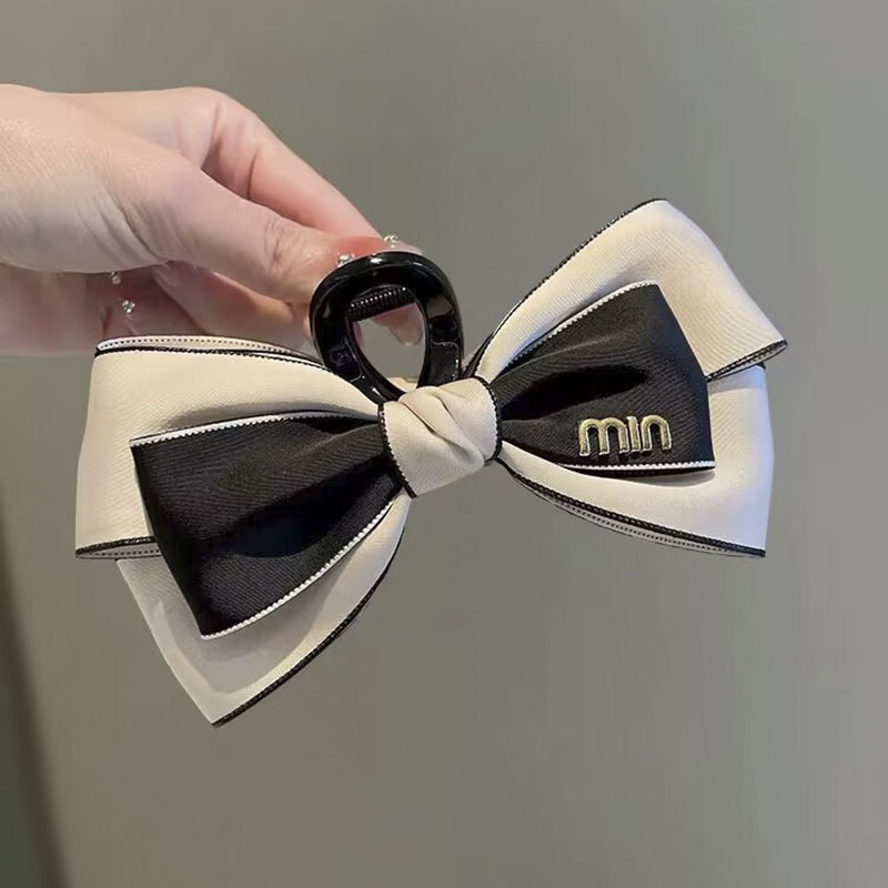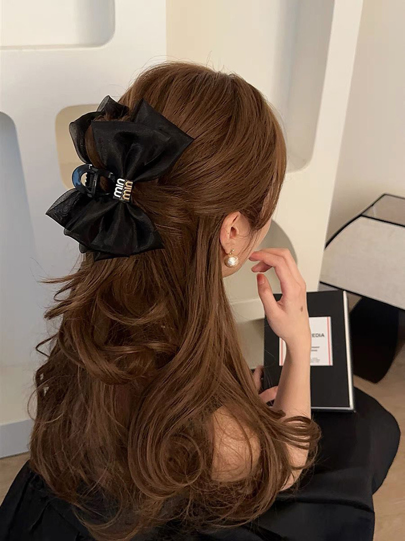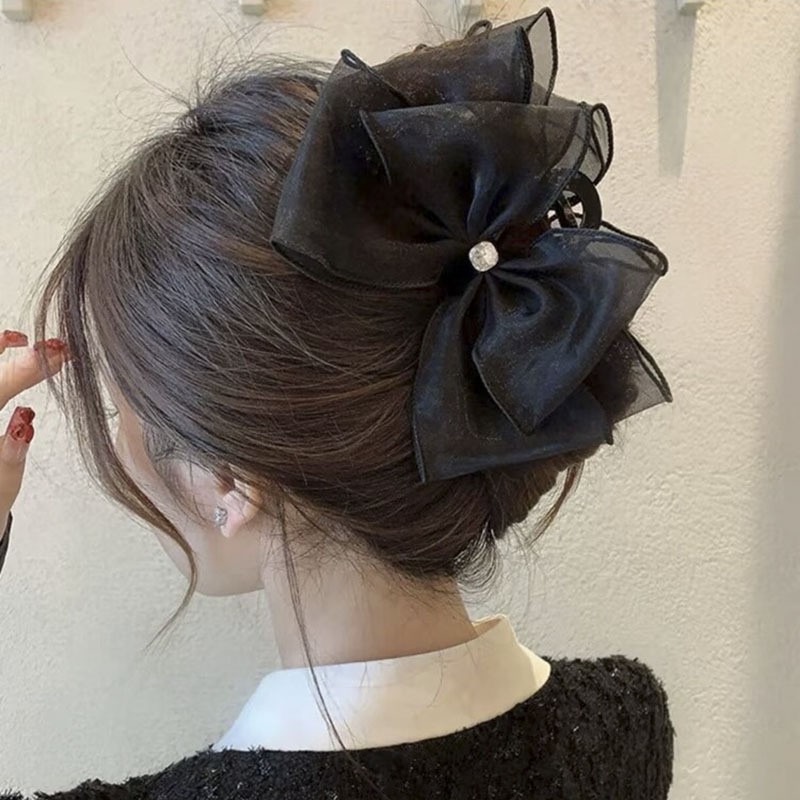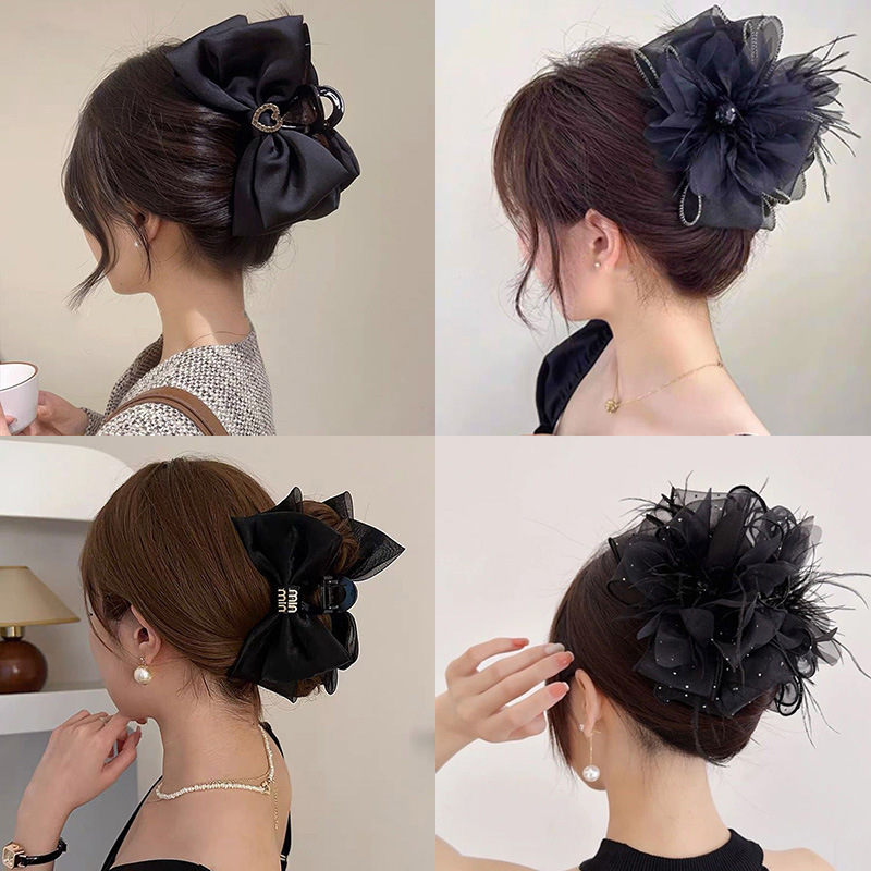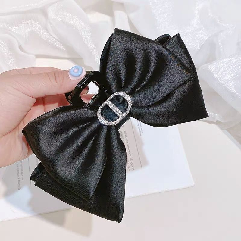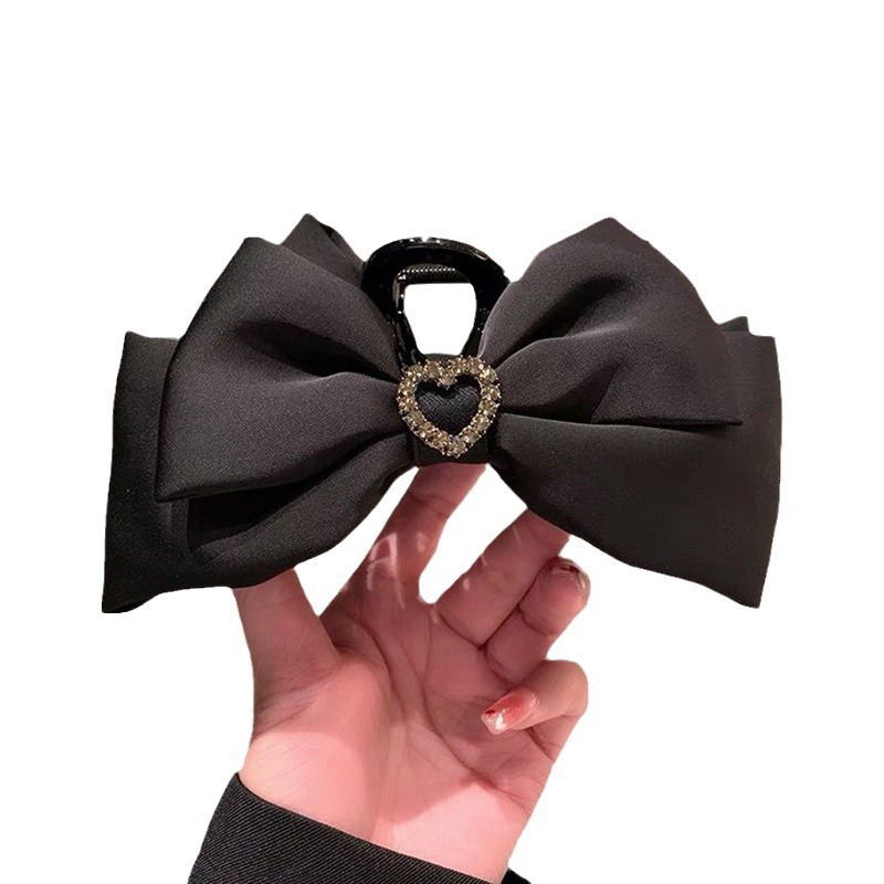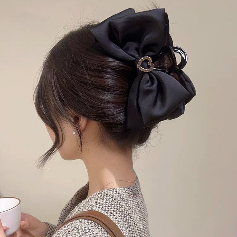 高级感缎面大号黑色蝴蝶结鲨鱼夹头饰方形钻后脑勺发夹抓夹女发卡