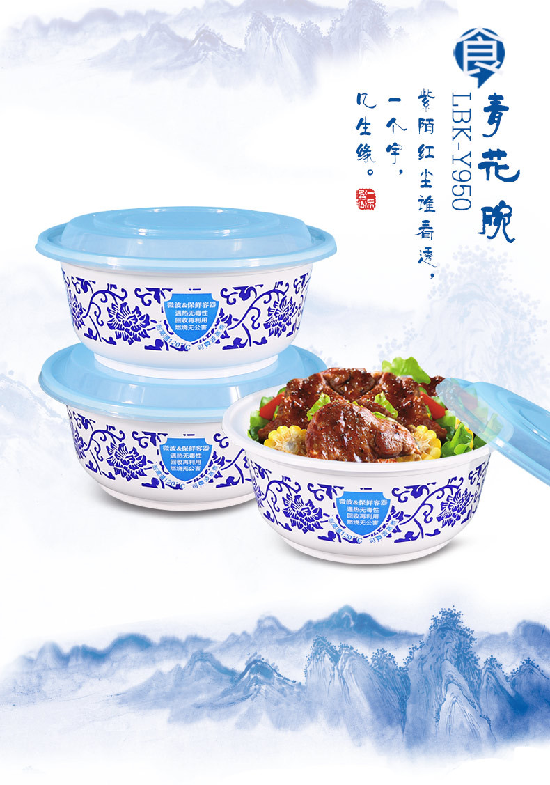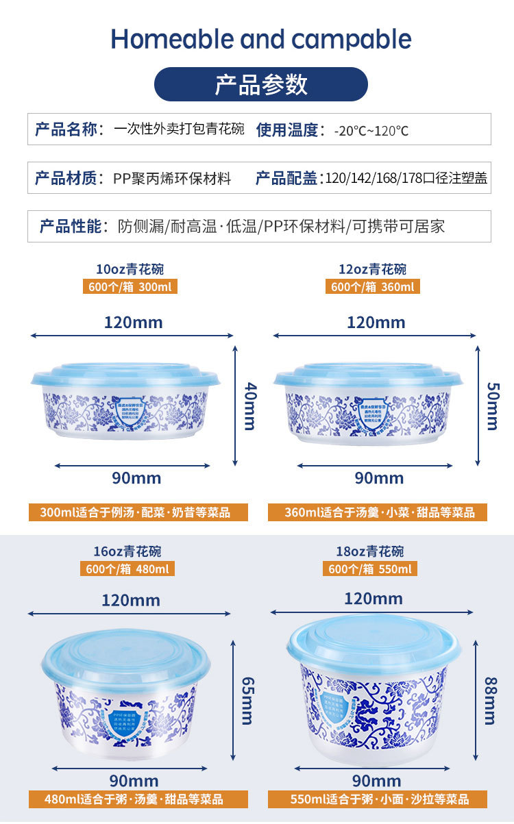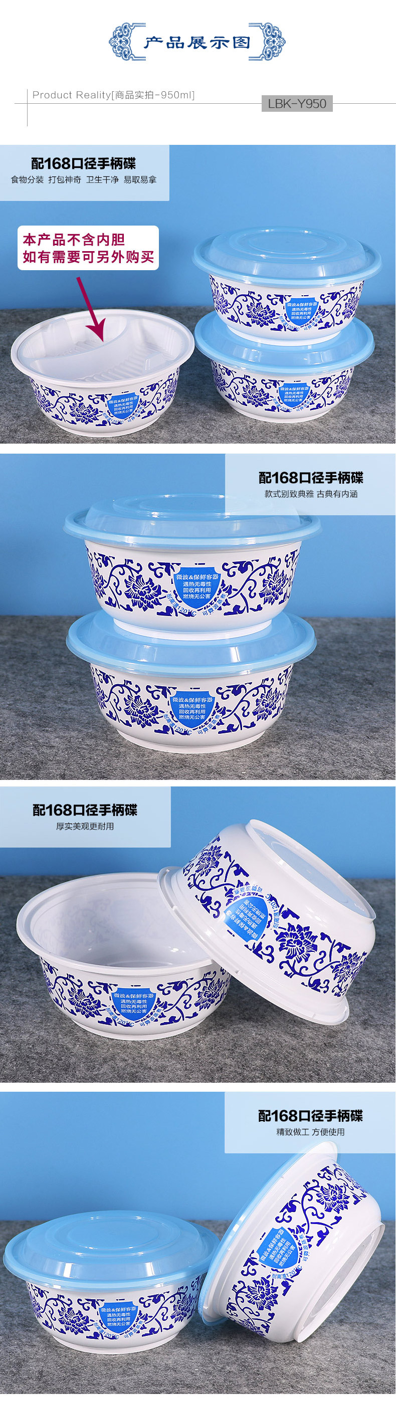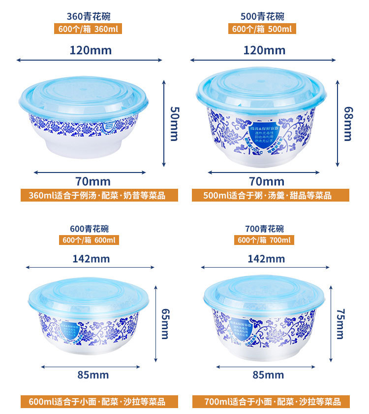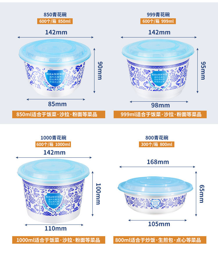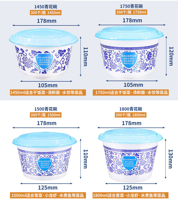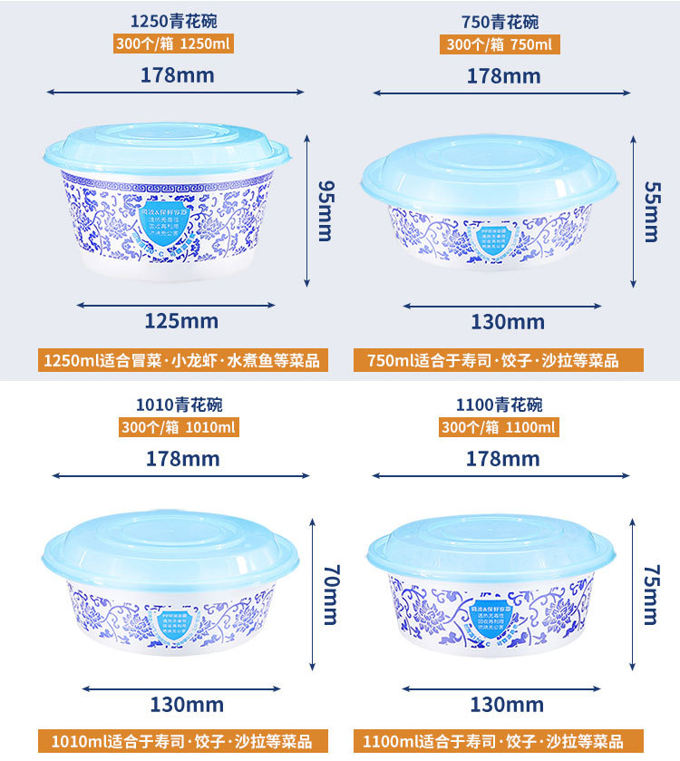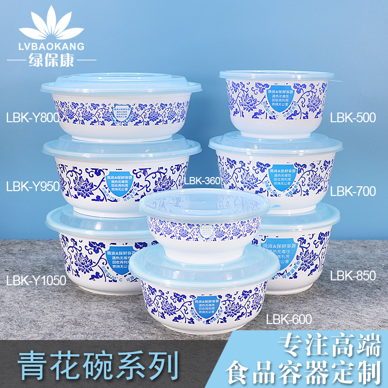 一次性青花碗食品餐盒高档环保圆形加厚打包塑料婚庆家用外卖带盖