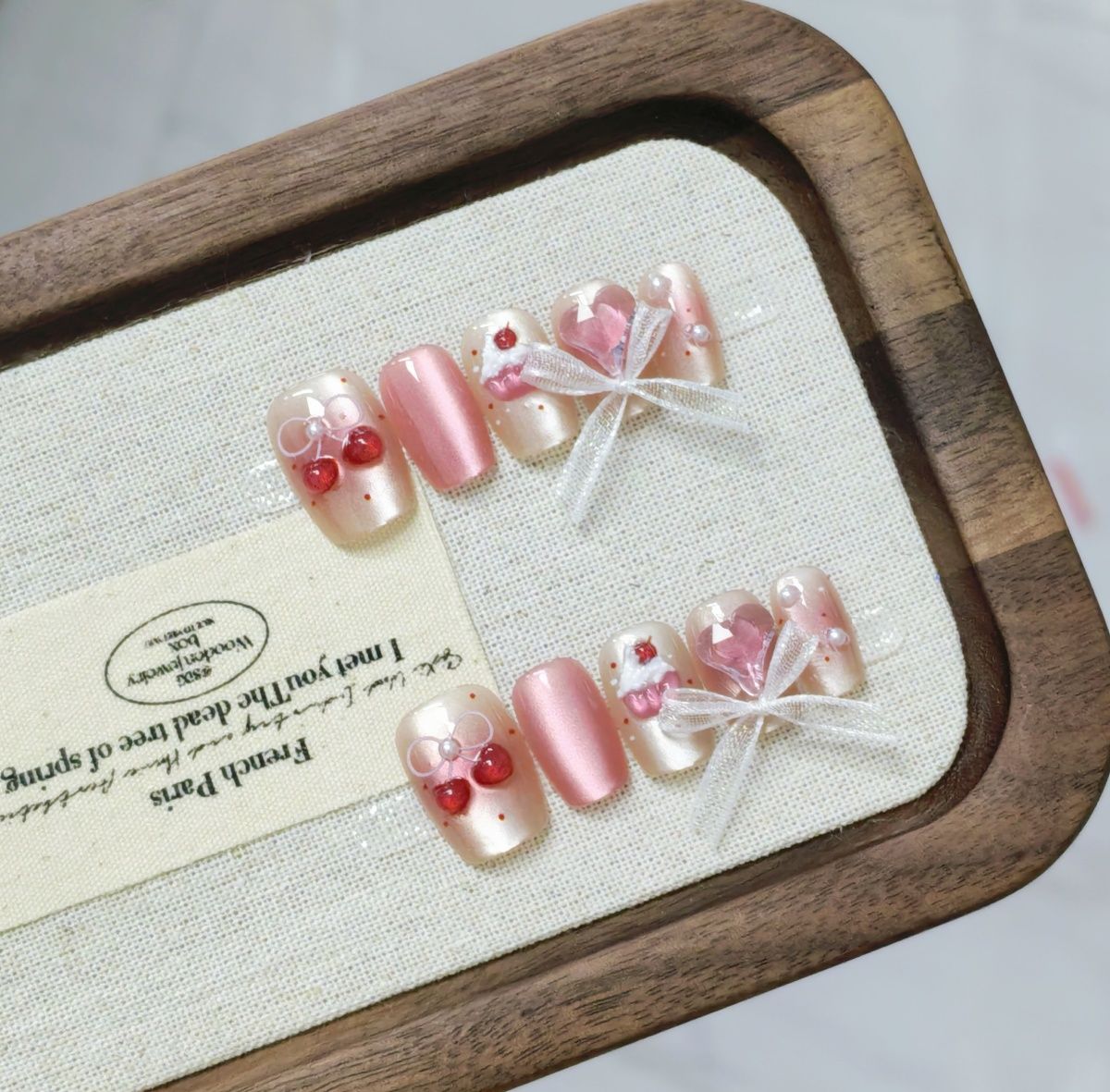 美少女手工穿戴甲立体樱桃蝴蝶猫眼手绘甜美可爱短款美甲贴片可拆