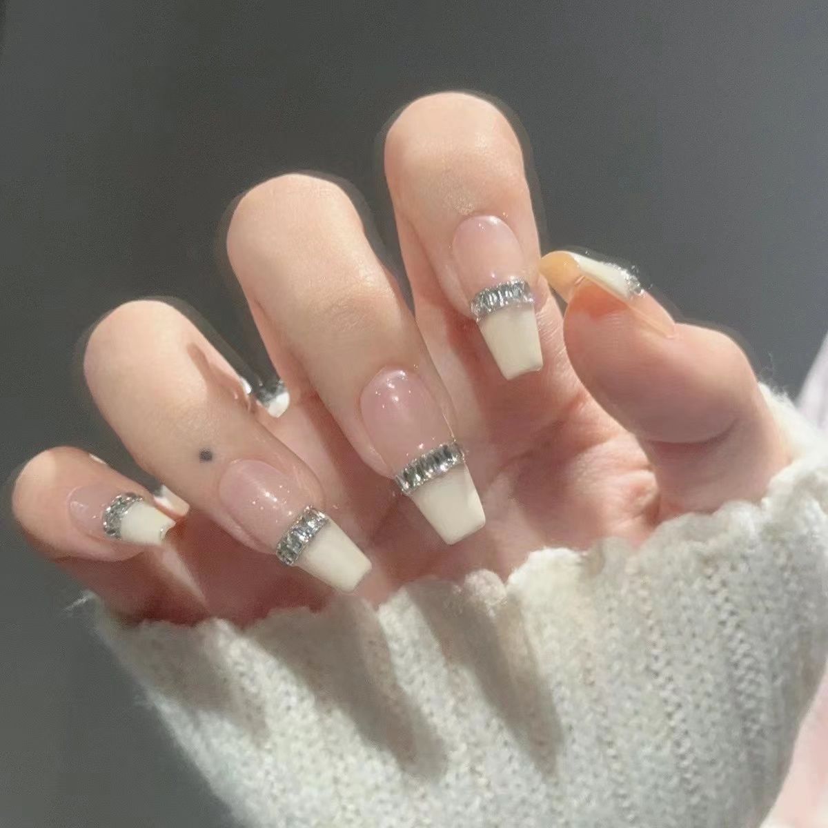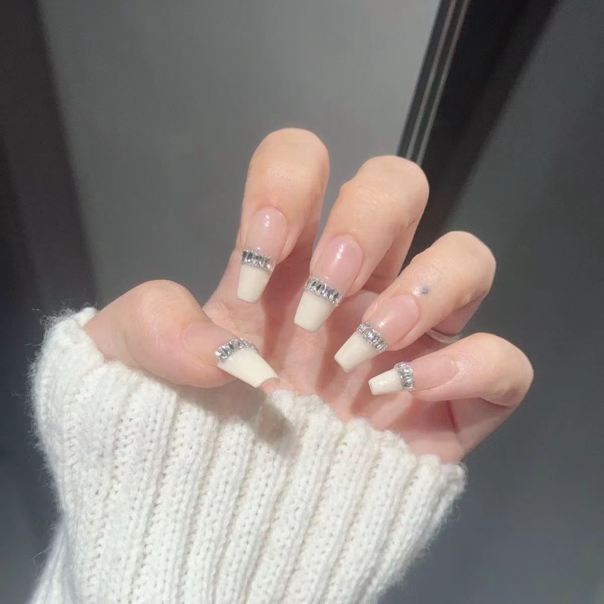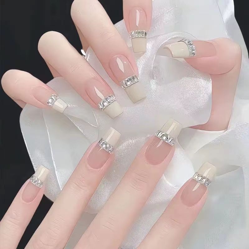 手工穿戴甲ins法式长条方形锆石穿戴甲简约公主新款奶白美甲显白