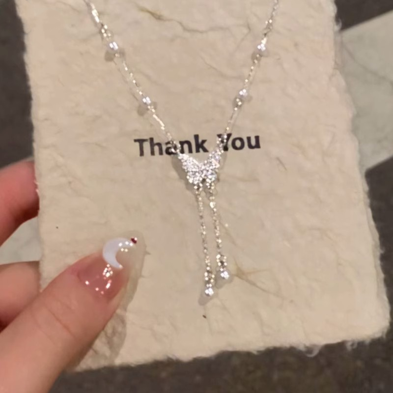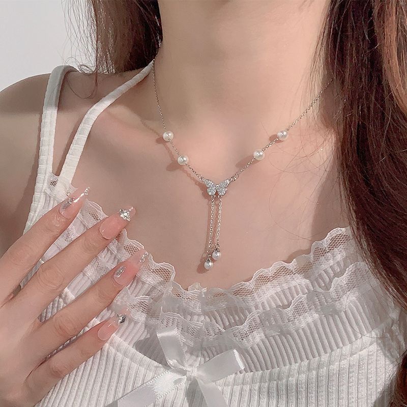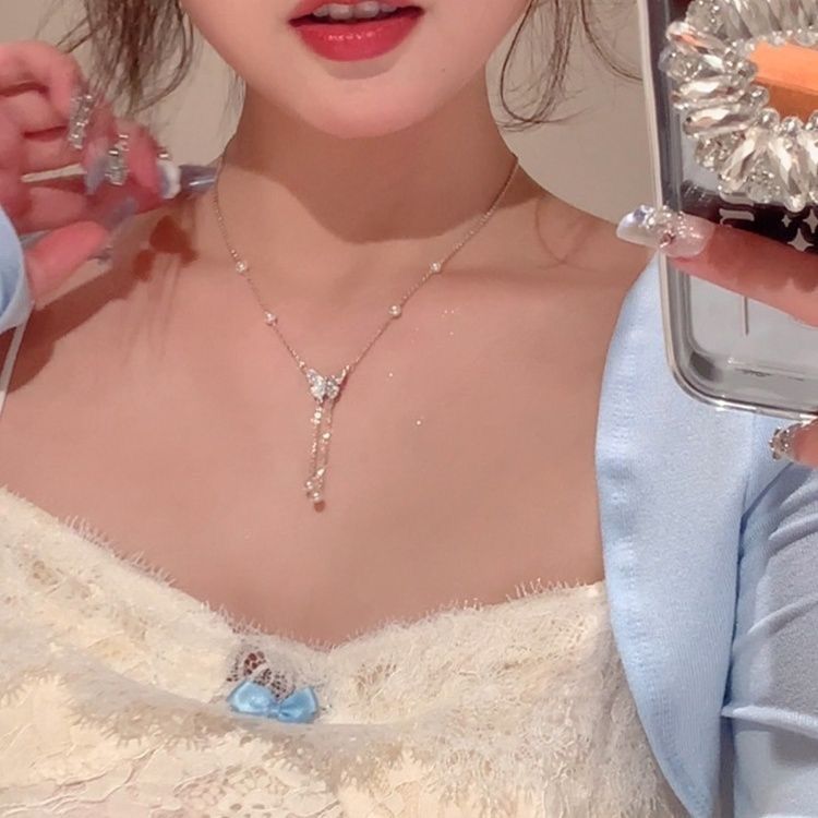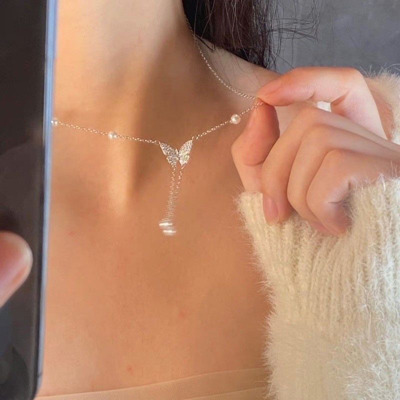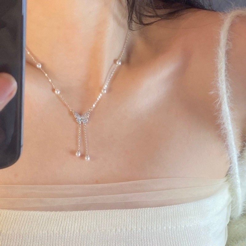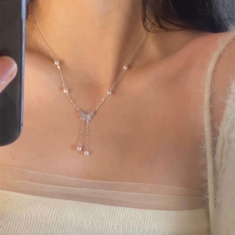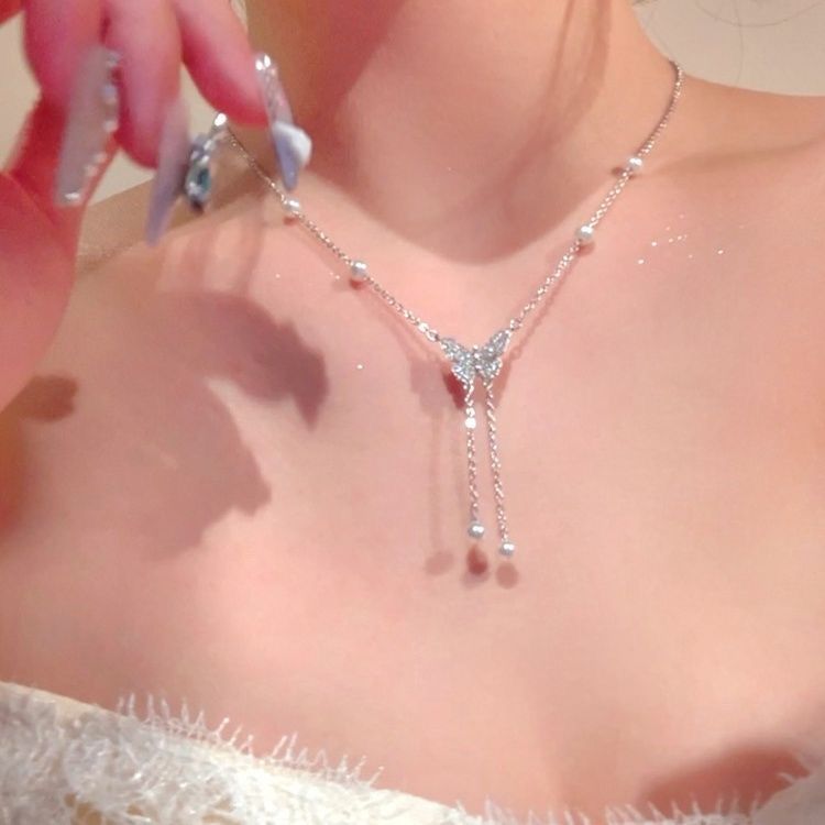 蝴蝶珍珠流苏项链女ins925银高颜值温柔精致毛衣链气质百搭锁骨链
