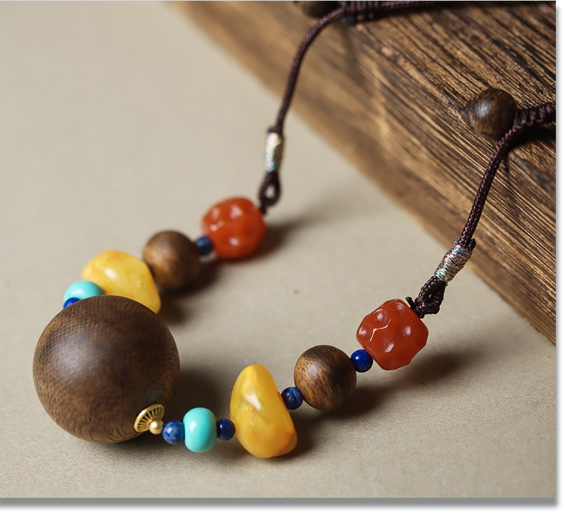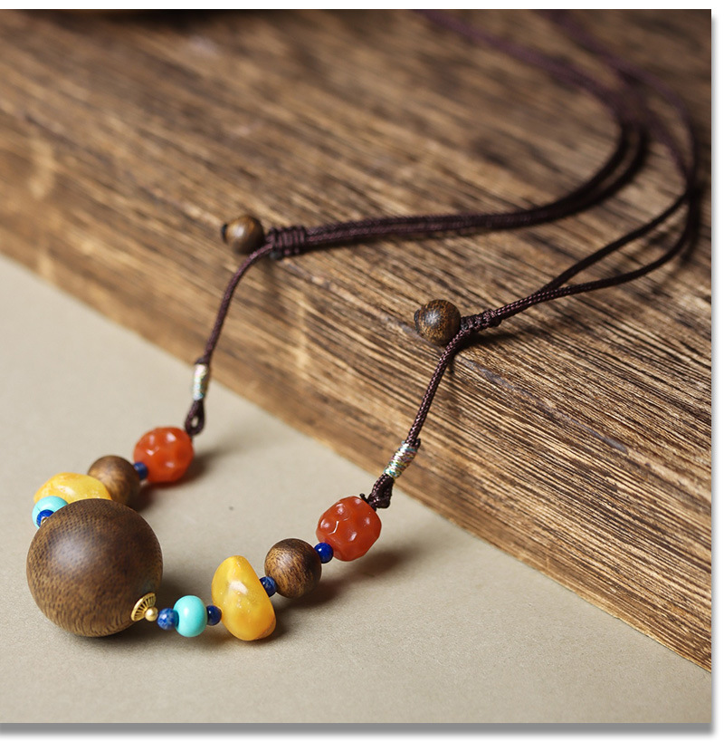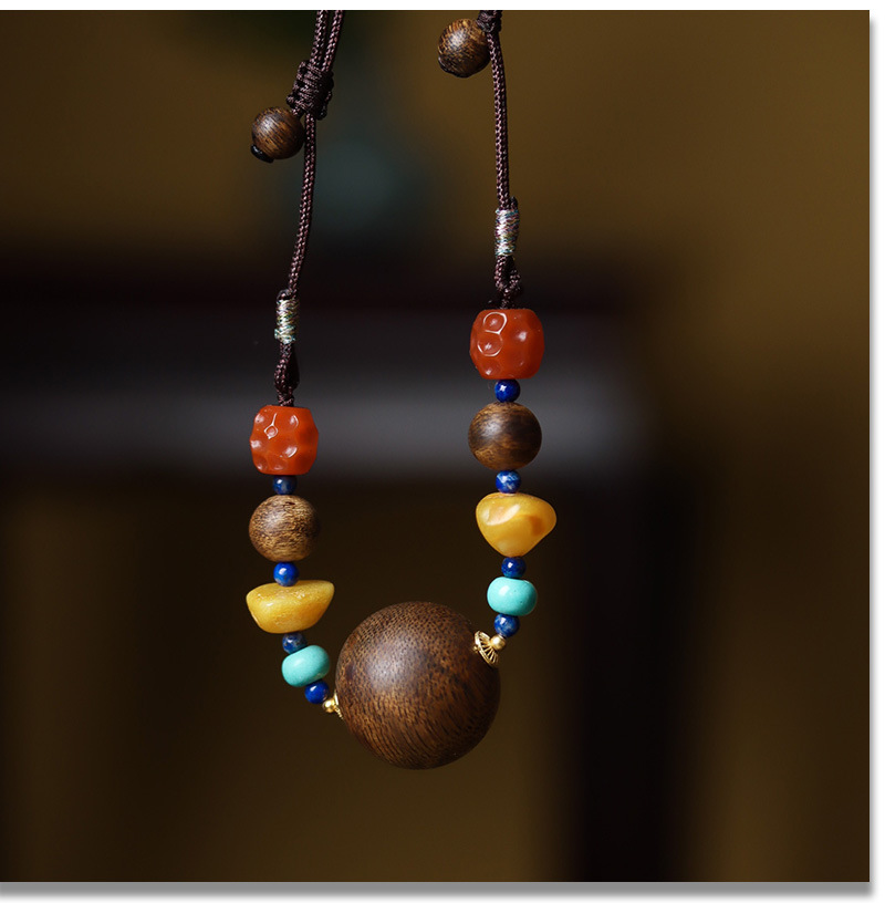 天然黄棋楠沉香蜜蜡吊坠短款绿松锁骨链项链南红珠毛衣链圆珠吊坠