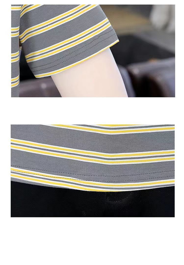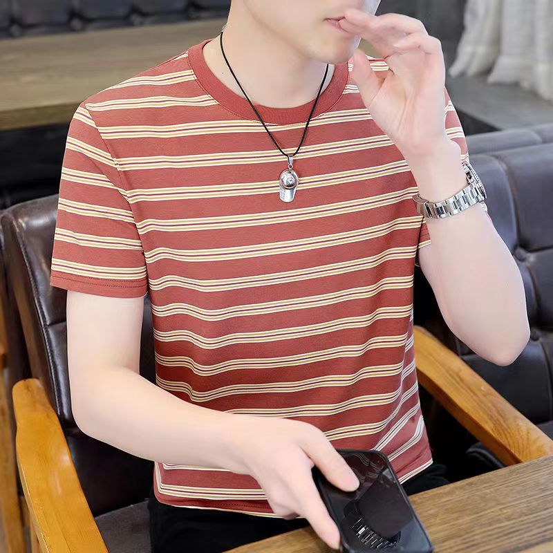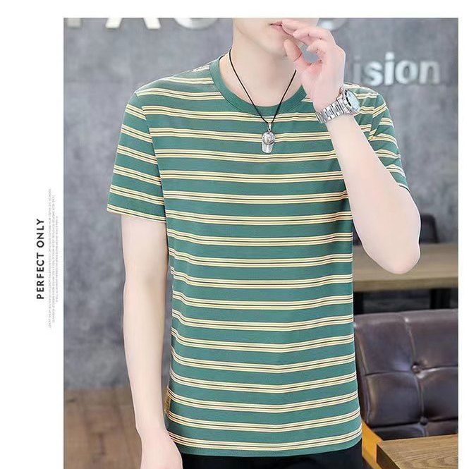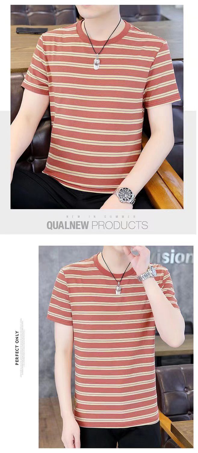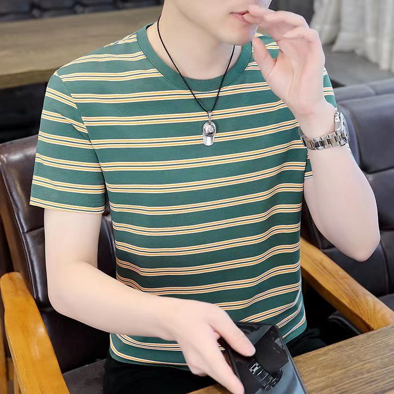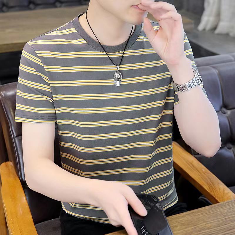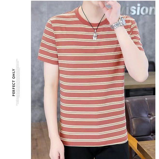 条纹t恤男士短袖t恤短袖夏季潮牌宽松圆领半袖韩版青少年上衣打底