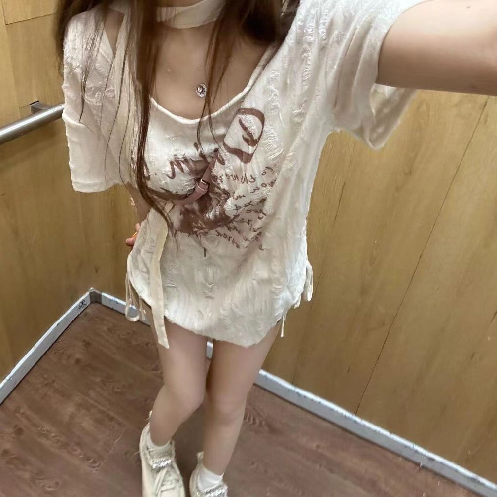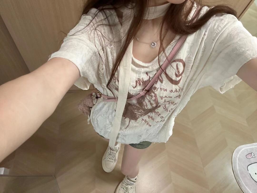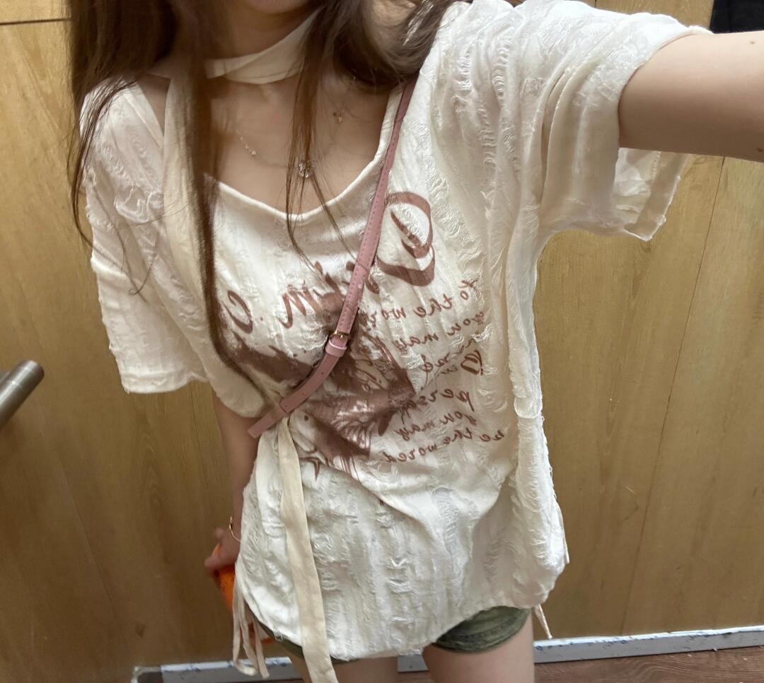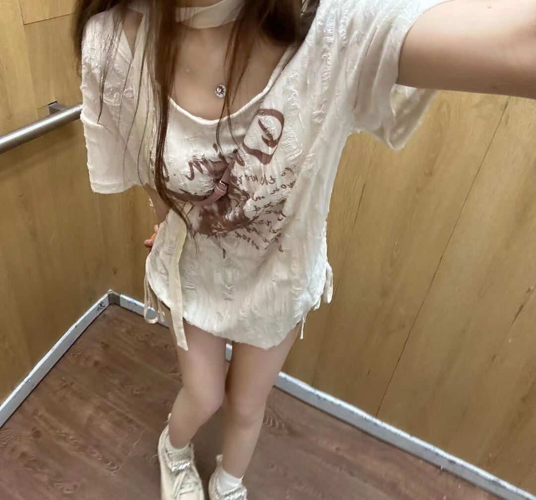 美式废土风蝴蝶印花宽松显瘦短袖T恤女夏季辣妹破洞小众个性上衣