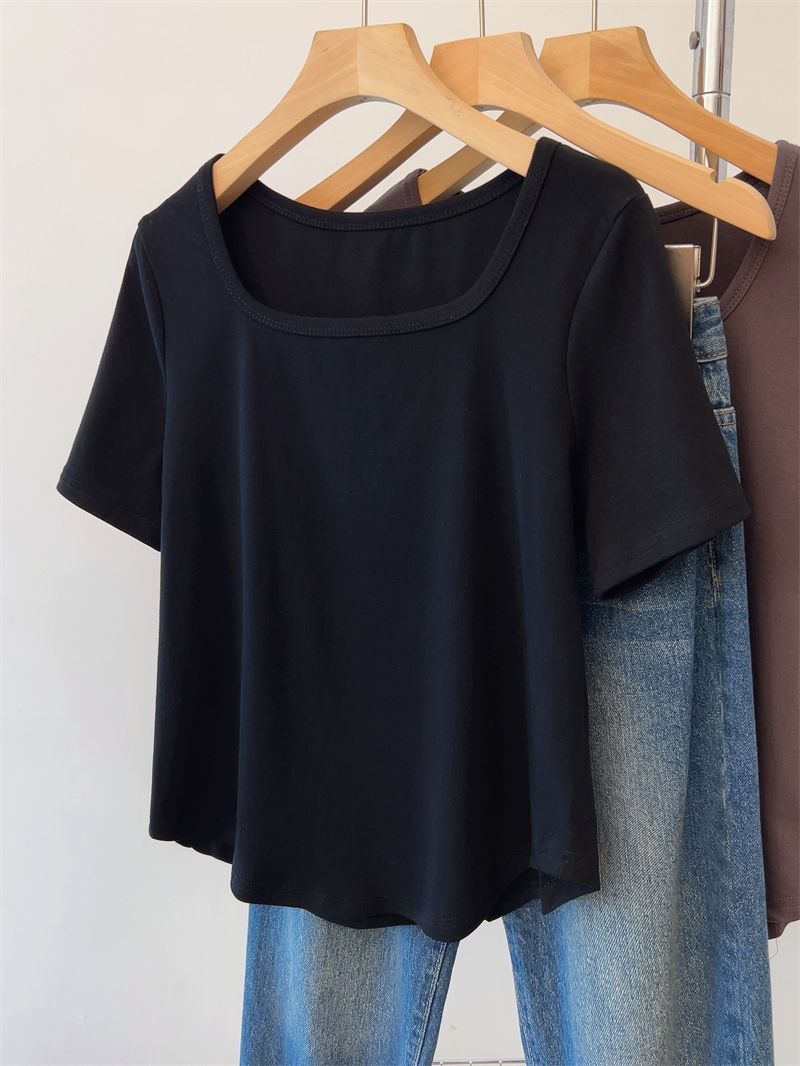 纯棉夏季大码女装胖mm正肩短袖T恤女修身显瘦遮肚子韩版方领上衣