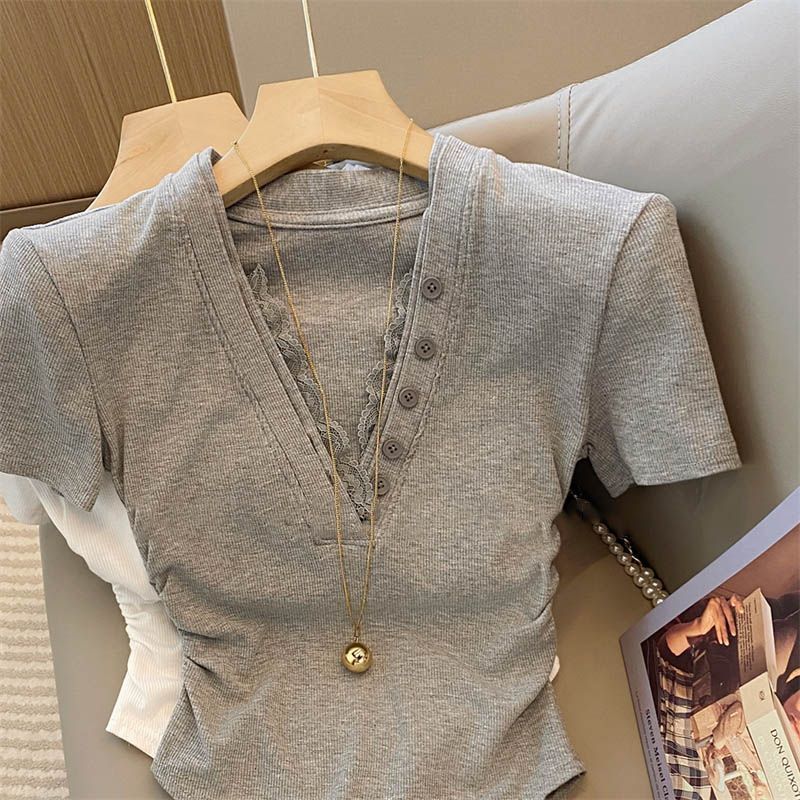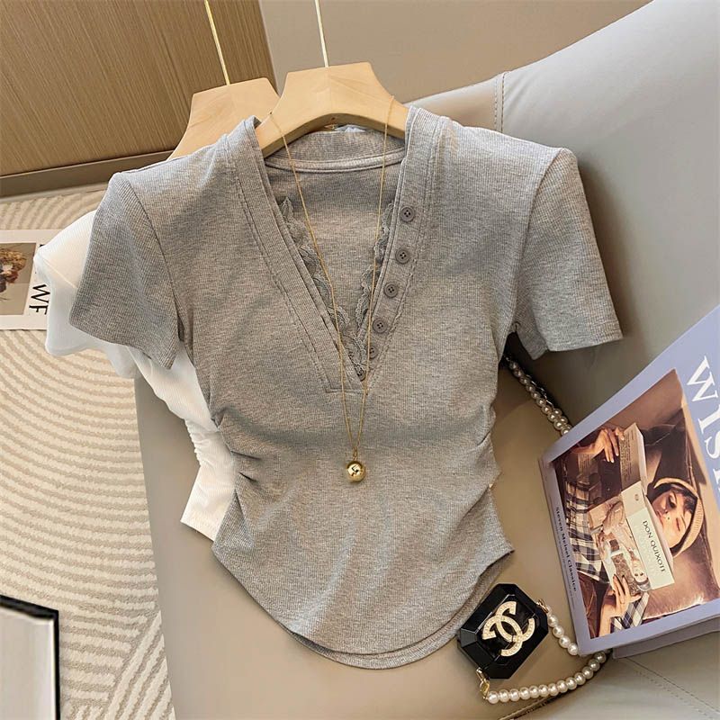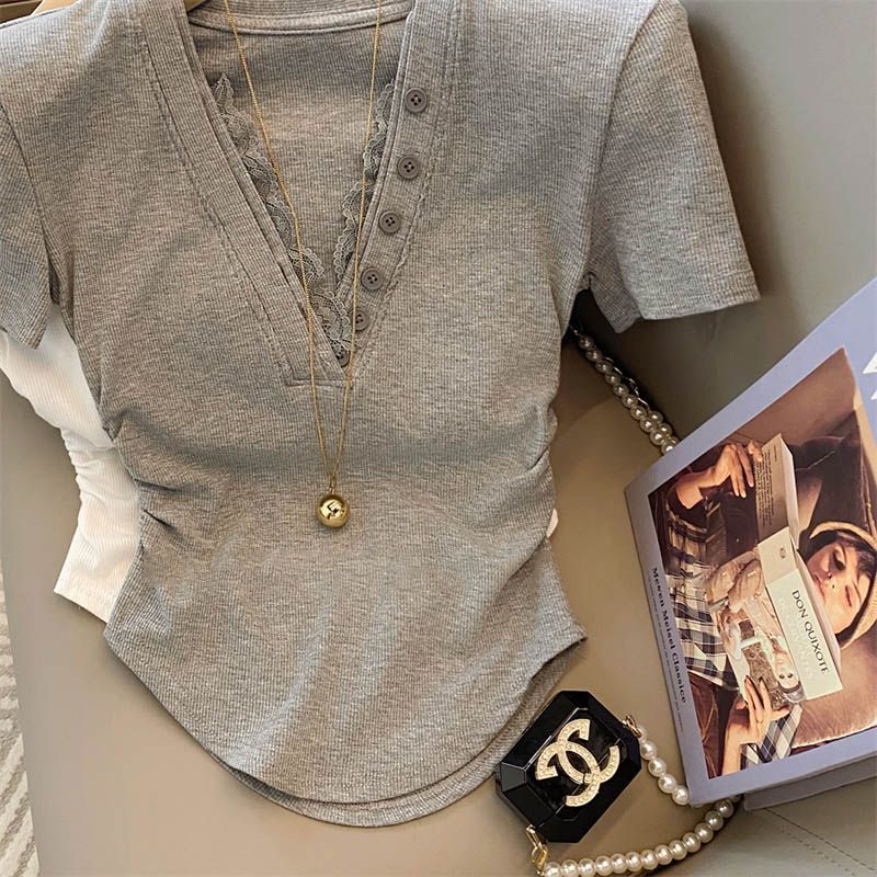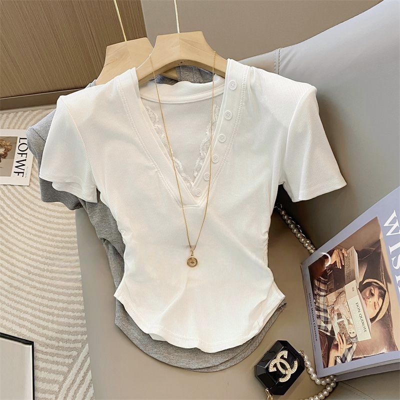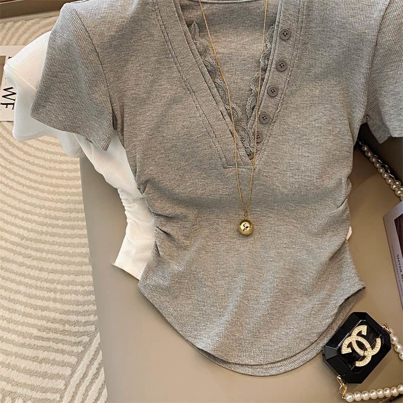 2025年新款法式复古设计蕾丝拼接V领短袖夏季T恤小众褶皱修身上衣