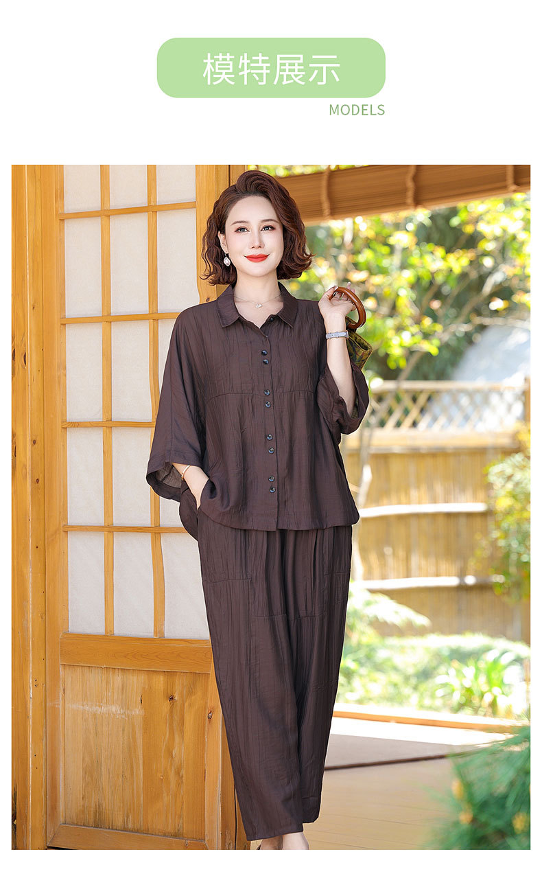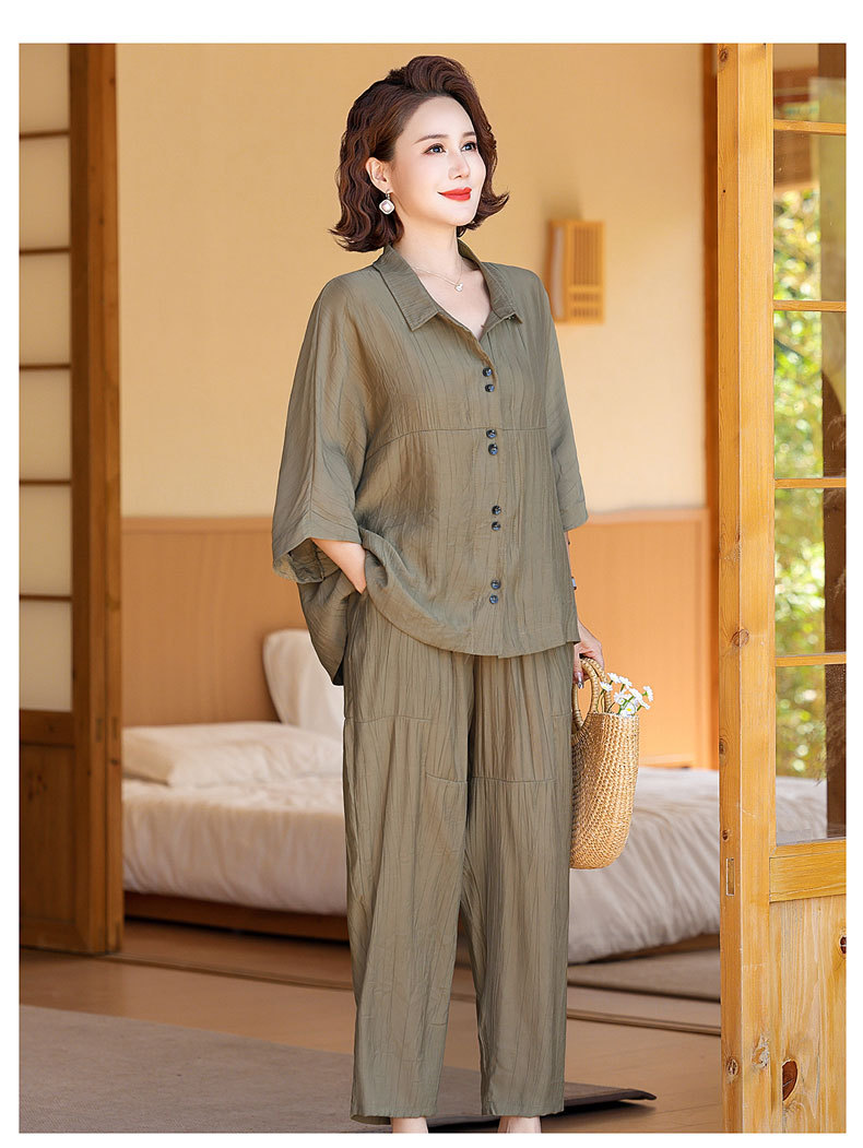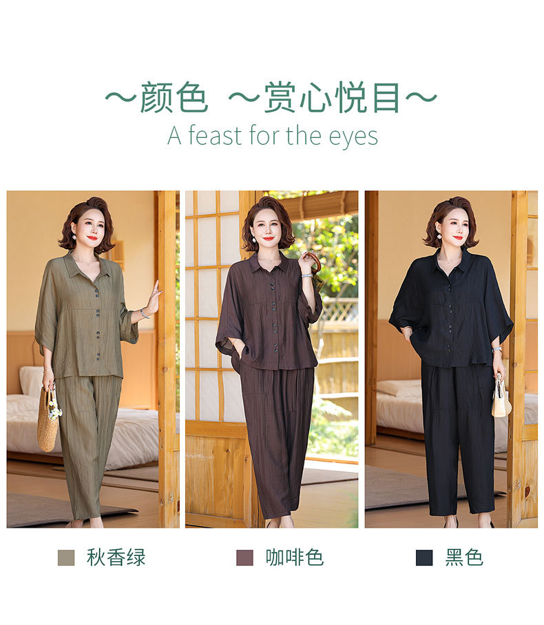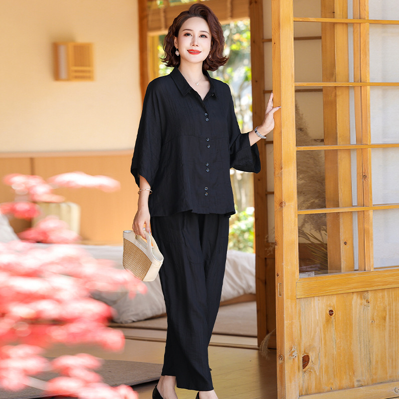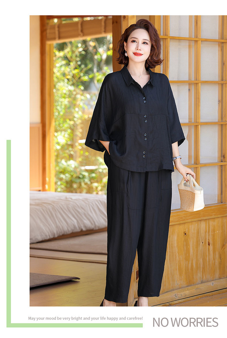 中老年女装九分裤子新款夏装宽松翻领衬衫气质大码妈妈装两件套装