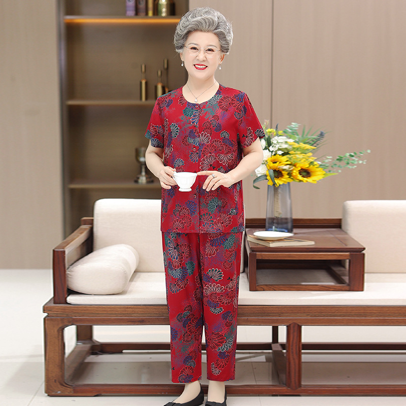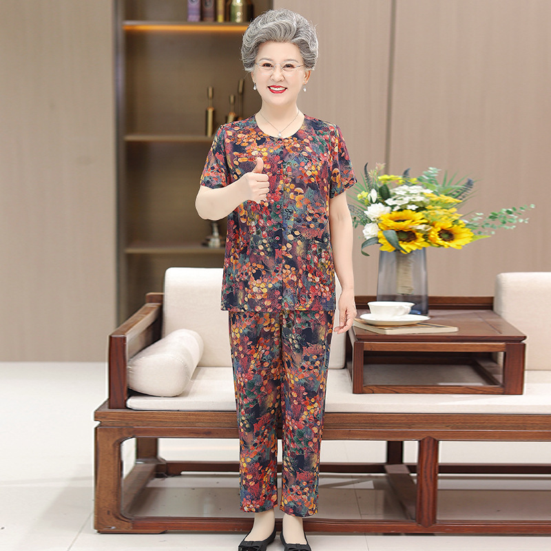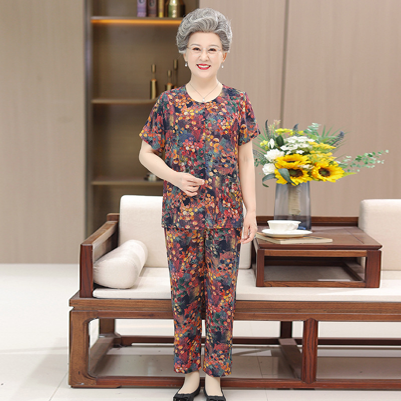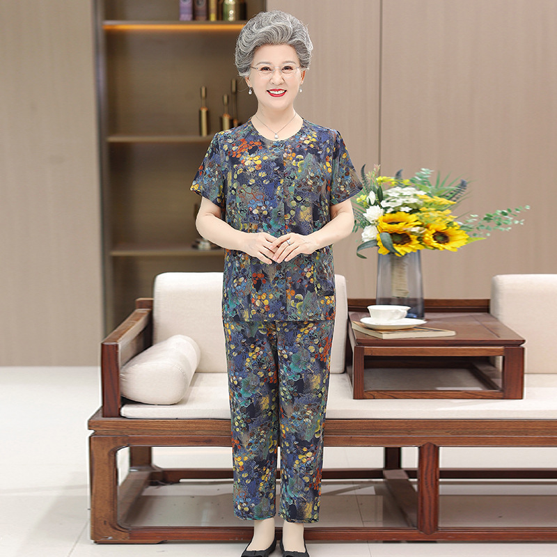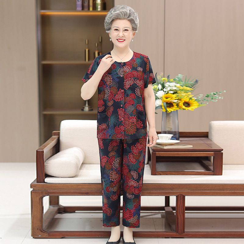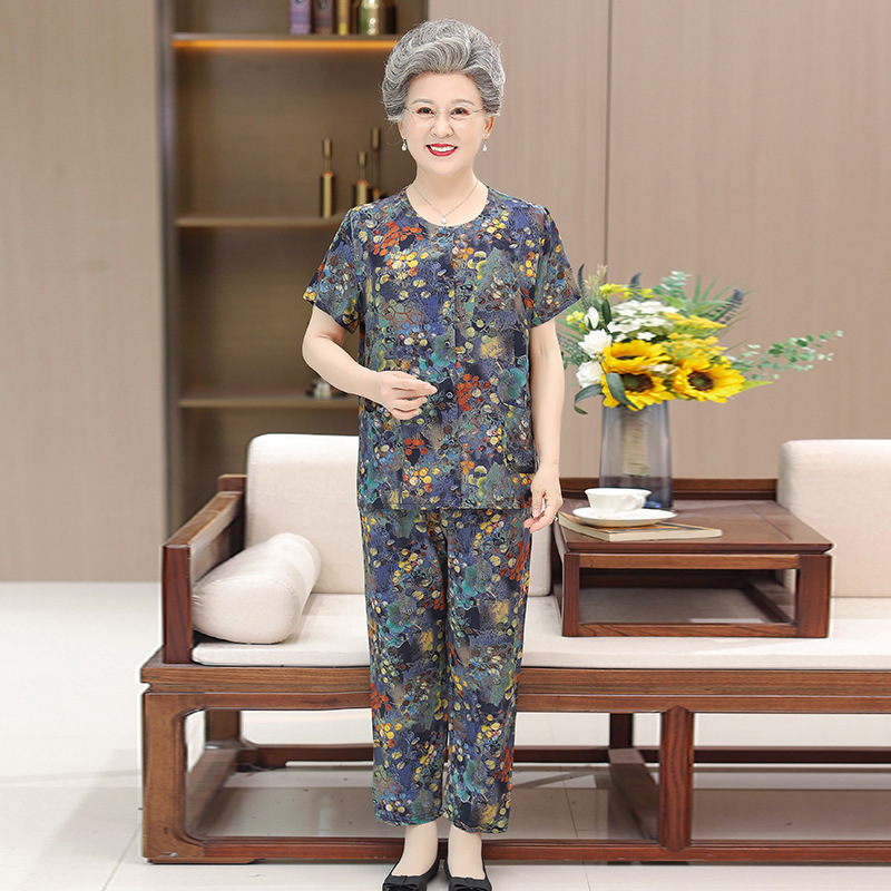 中老年人棉绸套装女奶奶短袖开衫70岁80妈妈老人绵绸两件套装夏季